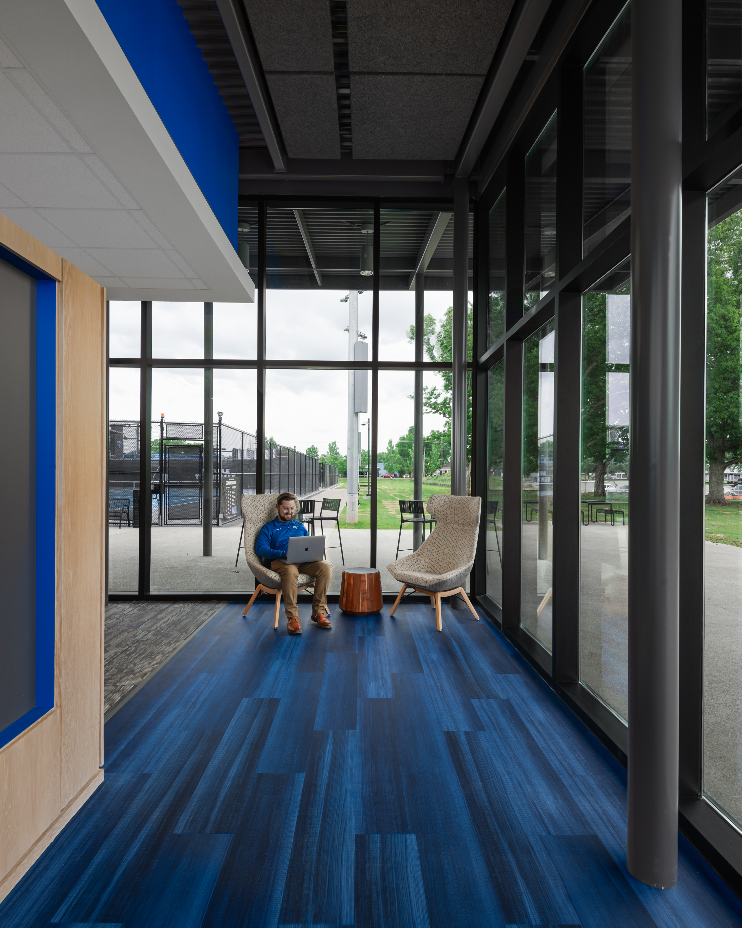 One significant challenge with this project - potentially the biggest - was managing the project budget. The budget for the project was established prior to the COVID-19 pandemic and its subsequent impact on manufacturing, material costs, and lead times. This meant that even with an early conception of right-sizing and finding efficiencies, there were several pivot points in the design process where we modified and focused the design to highlight only critical elements. This included reducing what was originally a 6,000 sf tennis program center building to a very efficient and compact 4,100 sf. This required an intensive iterative space planning process that allowed for the most efficient exterior envelope area as possible. The design team gained economy through reducing the building height while maintaining the lofted nature of the roof design. WBA made tactical adjustments to these areas to reduce overall exterior cladding costs and reduce glazing system costs. We reduced the exterior overhangs to provide generous shading where needed, but decrease the cost of framing and size of cantilevers. Additionally, the butterfly roof design was adjusted so that the lower half slopes outward instead of inward at a shallow slope - enabling the use of traditional gutter and downspout systems for rainwater drainage rather than a rainwater leader and drainage system inside the building. Additionally as part of this adjustment, standing seam metal roofing was replaced with a TPO roof. However, as part of this change, WBA maintained the design intent by specifying welded TPO “standing seams” on the roof at the same 16” interval spacing as on the wall cladding.