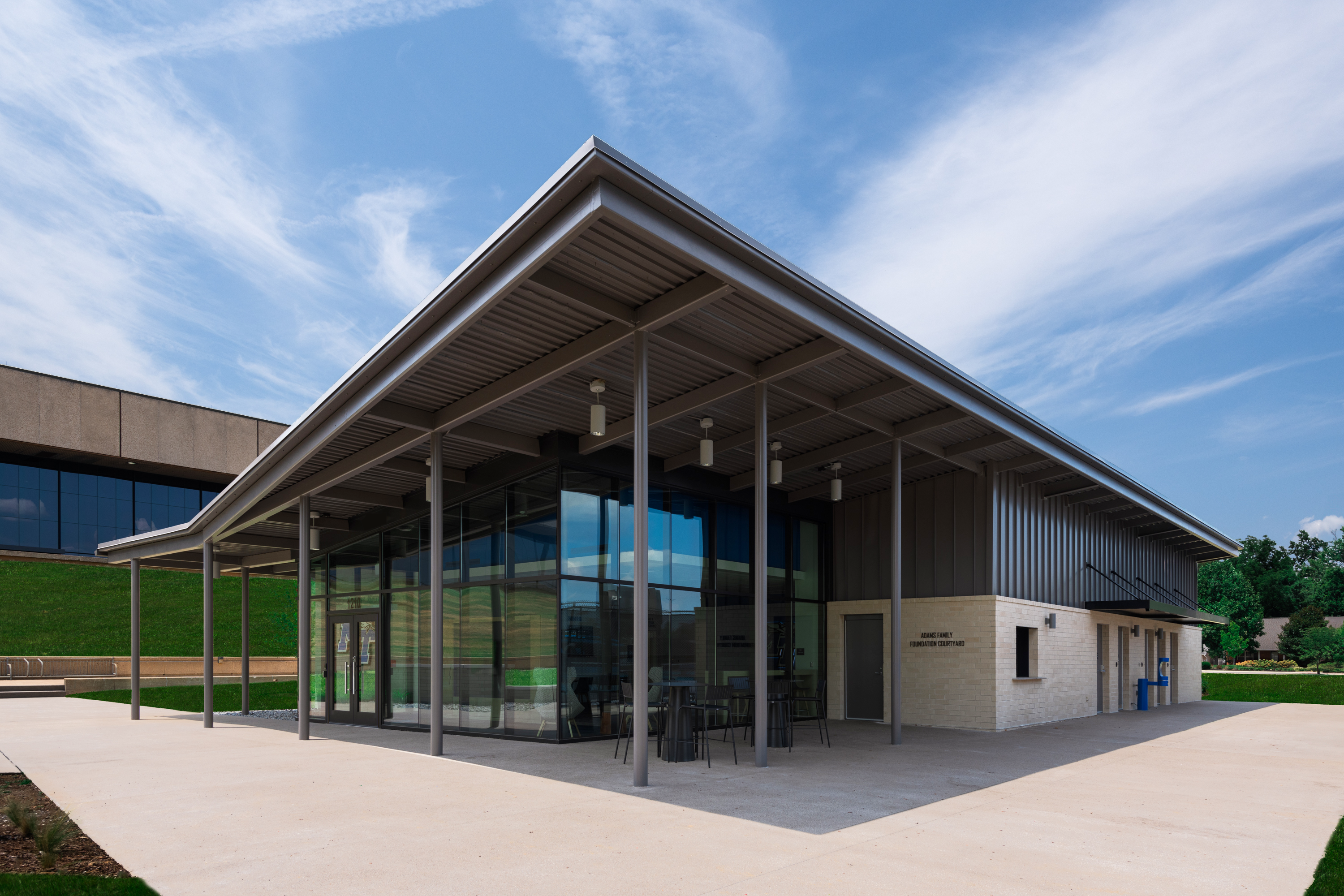 The most primary and consistent relationship for the project site is with the Murphy Center, a monumental 1970s campus landmark featuring a brutalist design style. The Tennis Complex shares a primary pedestrian corridor with the Murphy Center and careful attention was given to the utility of that corridor for different scenarios. Design of the Tennis Complex needed to integrate with campus events and operations. Rather than orienting the building entry to the Murphy Center, the building was rotated 90 degrees to allow for a long, angular pathway that branches off and provides an emphatic approach to the Tennis Complex. This pathway celebrates architectural features like the buff colored, utility-sized brick veneer, crisp vertical standing seam metal cladding, continuous glass entry facade, and processional landscaping elements. These architectural features are intended to cultivate a new architectural language specific to MTSU athletics that other projects in construction - like the new Student Athlete Performance Center - adjacent to the Tennis Complex. These projects are incorporating aspects of the material palette to create consistency and establish a clear athletics “village”. With several more athletics projects planned in the coming years, the MTSU Tennis Complex project serves as an anchor for architectural language on its campus.