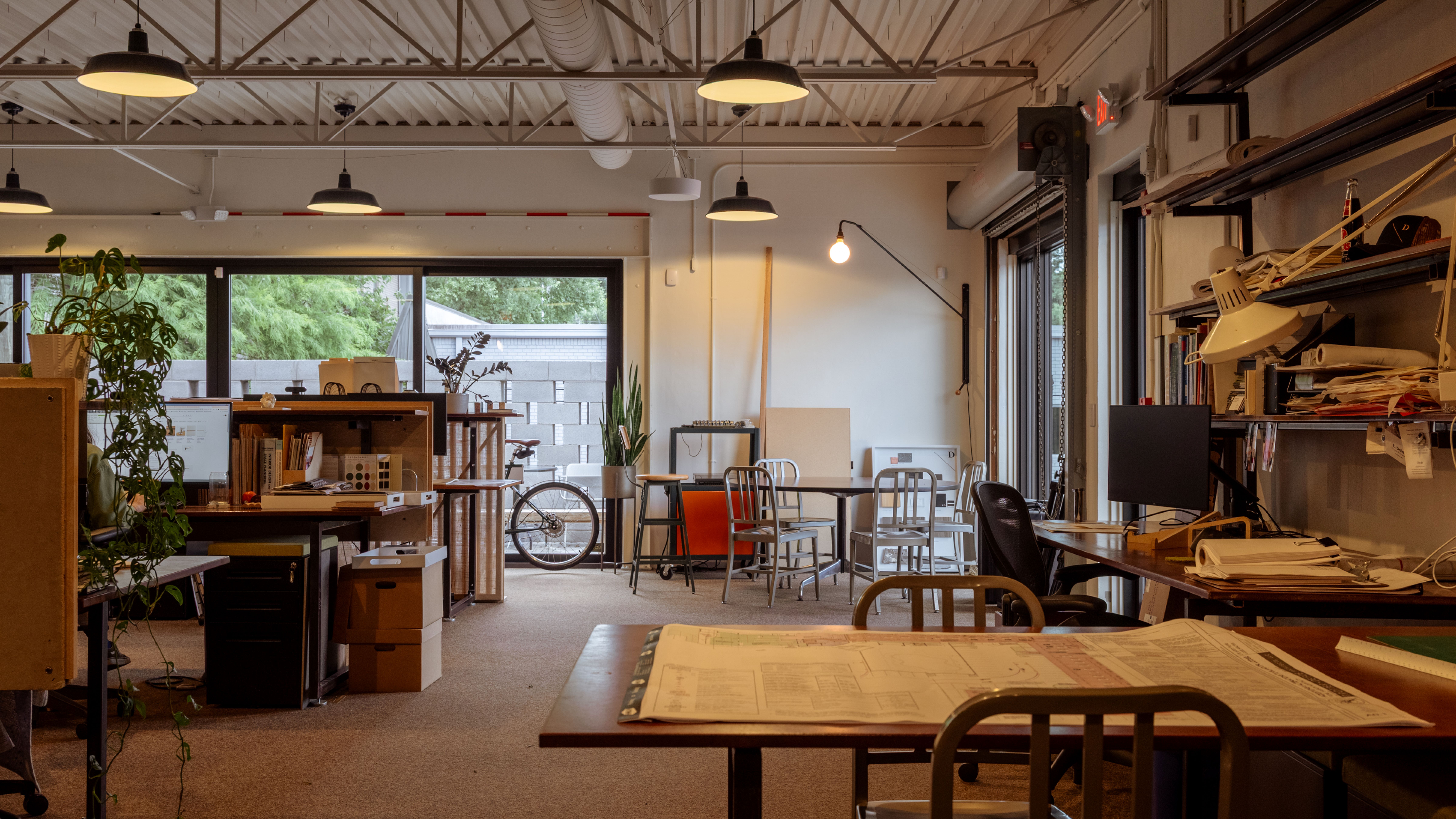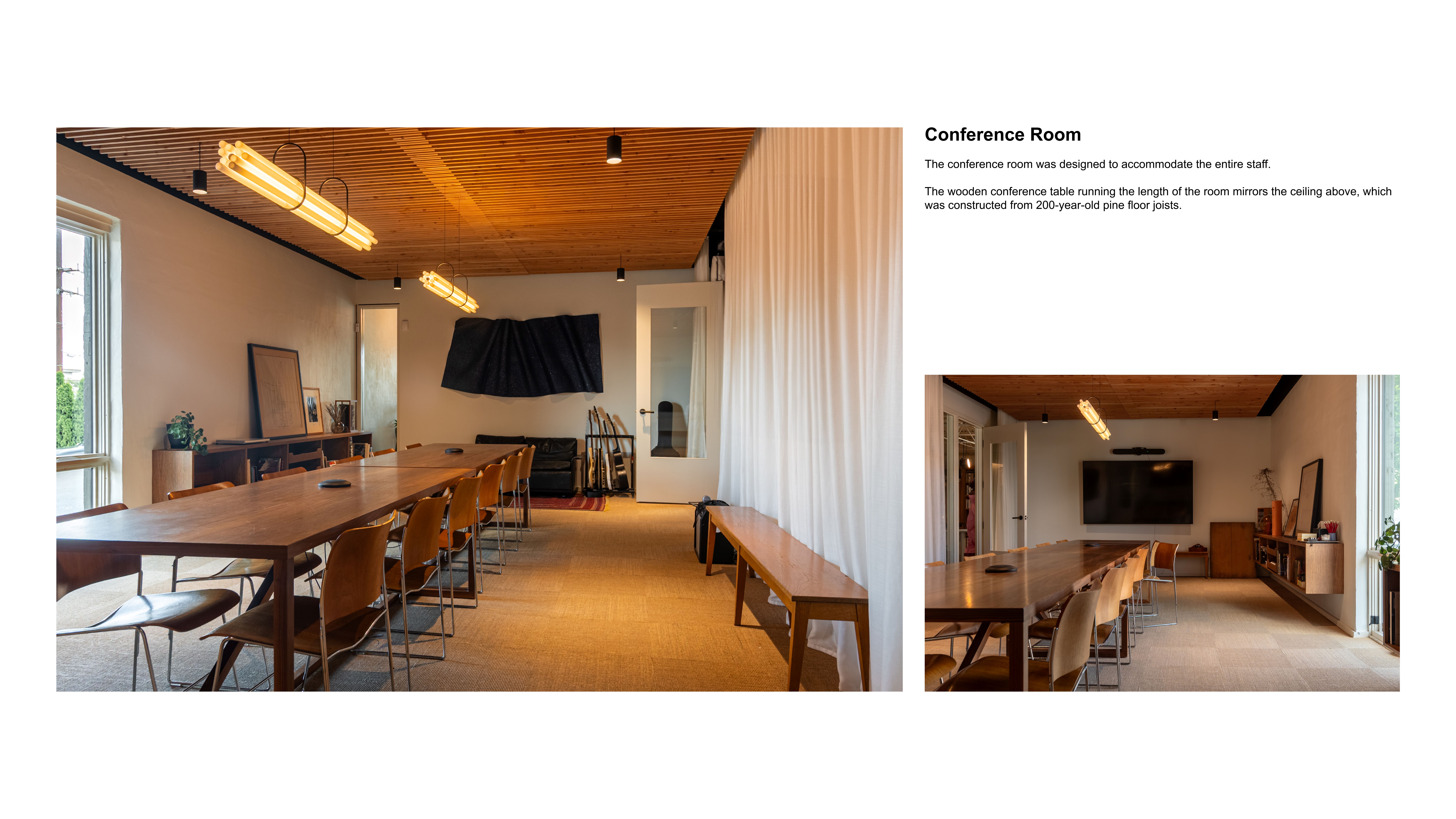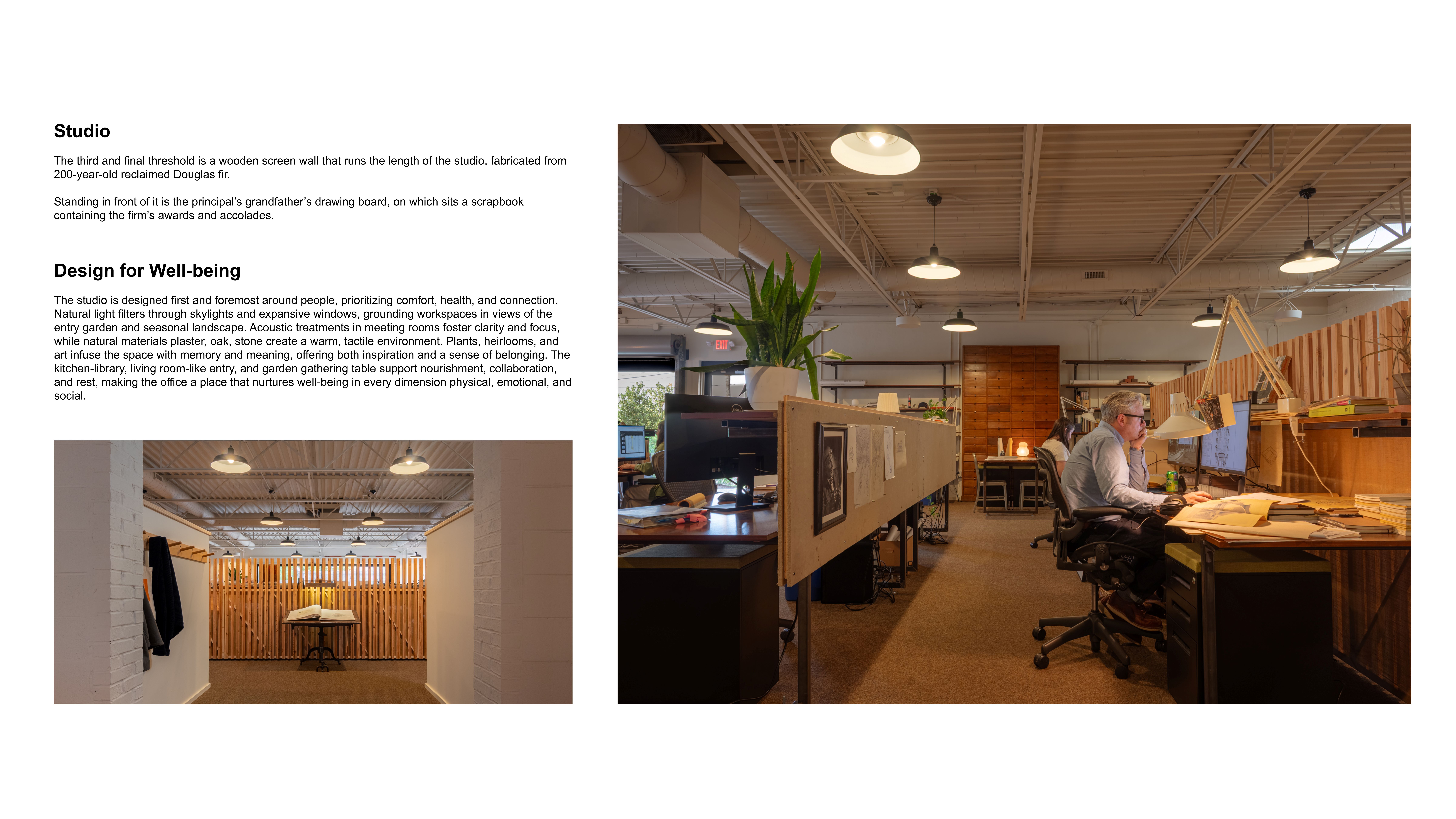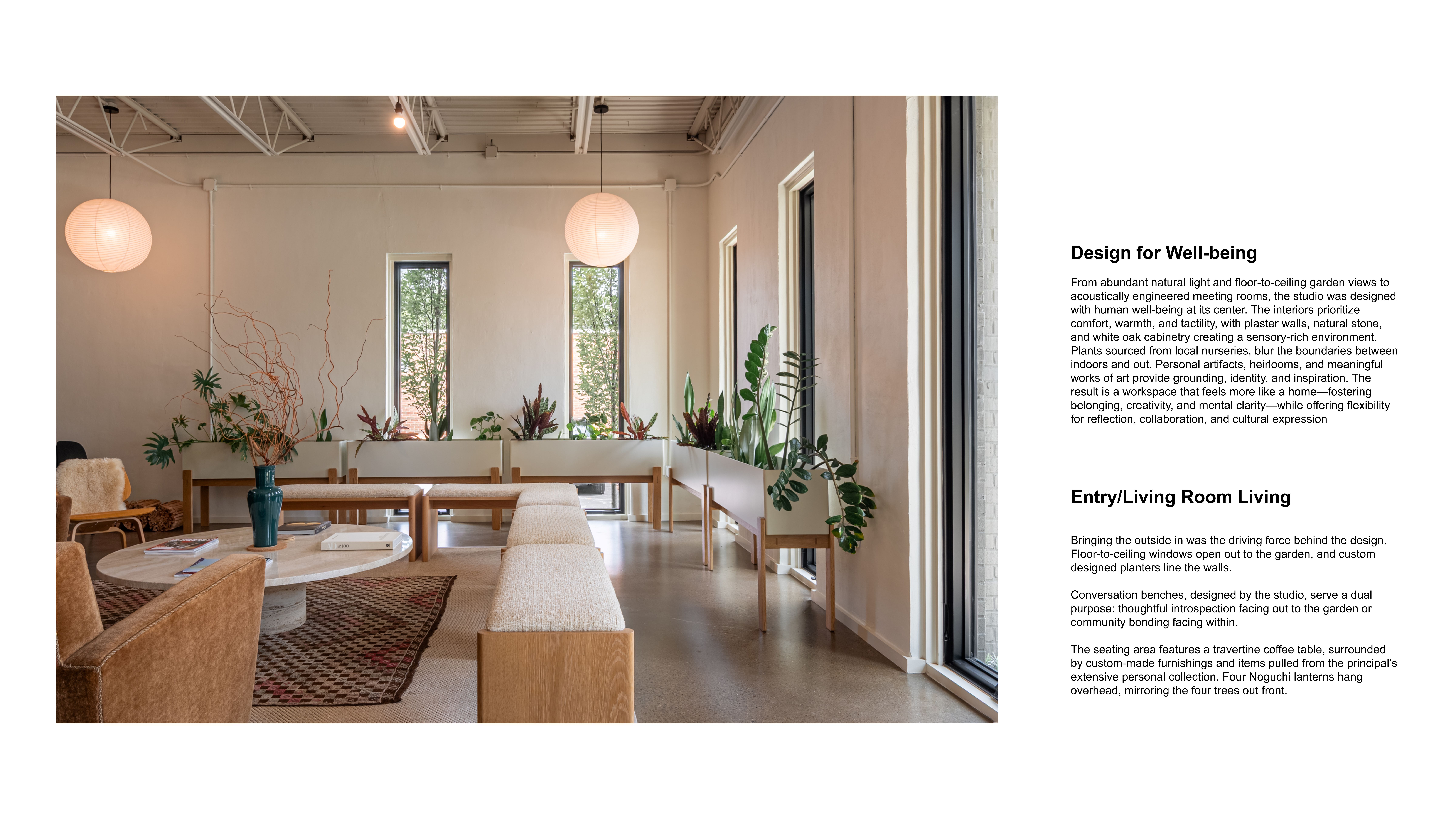 The studio is designed first and foremost around people, prioritizing comfort, health, and connection. Natural light filters through skylights and expansive windows, grounding workspaces in views of the entry garden and seasonal landscape. Acoustic treatments in meeting rooms foster clarity and focus, while natural materials plaster, oak, stone create a warm, tactile environment. Plants, heirlooms, and art infuse the space with memory and meaning, offering both inspiration and a sense of belonging. The kitchen-library, living room-like entry, and garden gathering table support nourishment, collaboration, and rest, making the office a place that nurtures well-being in every dimension physical, emotional, and social.