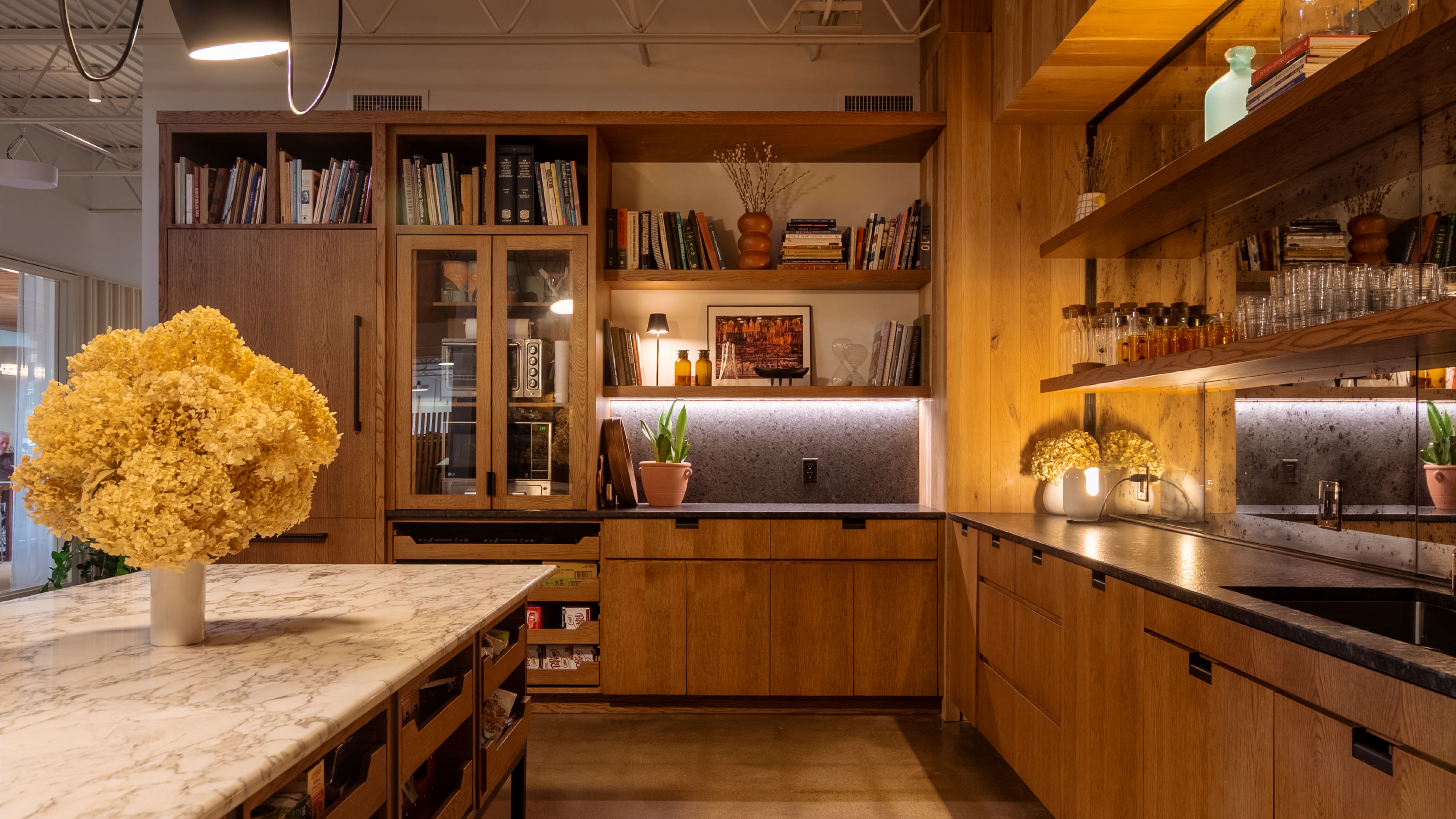 The office is a study in intentional juxtaposition: urban and rural, residential and commercial, contemporary and traditional, past and present. These contrasts reflect the diversity of the studio’s design capabilities and create a space that blurs the boundaries between home and workplace, defying office norms. The entry doubles as a lounge and listening room, while the kitchen—with white oak cabinetry, natural stone counters, an antiqued mirror backsplash, and a built-in design library—feels more like it belongs in a home than an office. Meeting rooms, engineered for superior acoustics, subtly reference the surrounding recording studios while ensuring clarity in virtual collaboration. Together, these elements evoke the home of your coolest friend—comfortably stylish, inviting, and entirely personal.