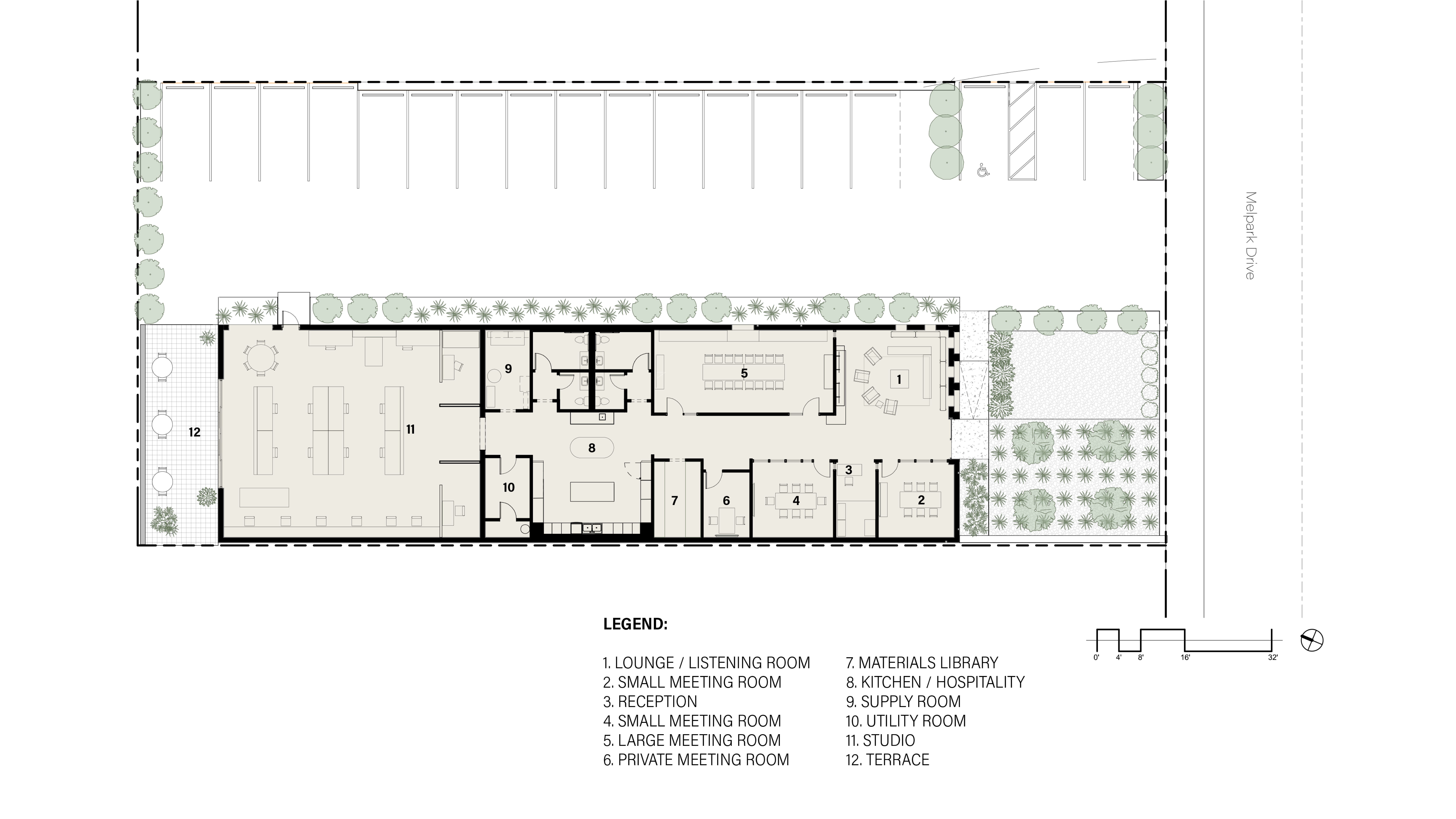 Located in Berry Hill, Nashville’s design district, the studio is more than an office it’s a neighborhood anchor and a community gathering place. The space is often used by outside organizations for community events after office hours. The renovation honors the firm’s long-standing mission of adaptive reuse and placemaking by giving new life to an overlooked structure while contributing vibrancy to the street. Within the space, local makers (Holler Design, Scheibe Design, New Hat) and regional artists are foregrounded, amplifying the voices of Nashville’s creative community. Shared areas such as the entry lounge, kitchen-library, and outdoor garden with its communal Judd table are designed for conversation, collaboration, and hospitality—underscoring the office’s role as both a workplace and a community hub.
