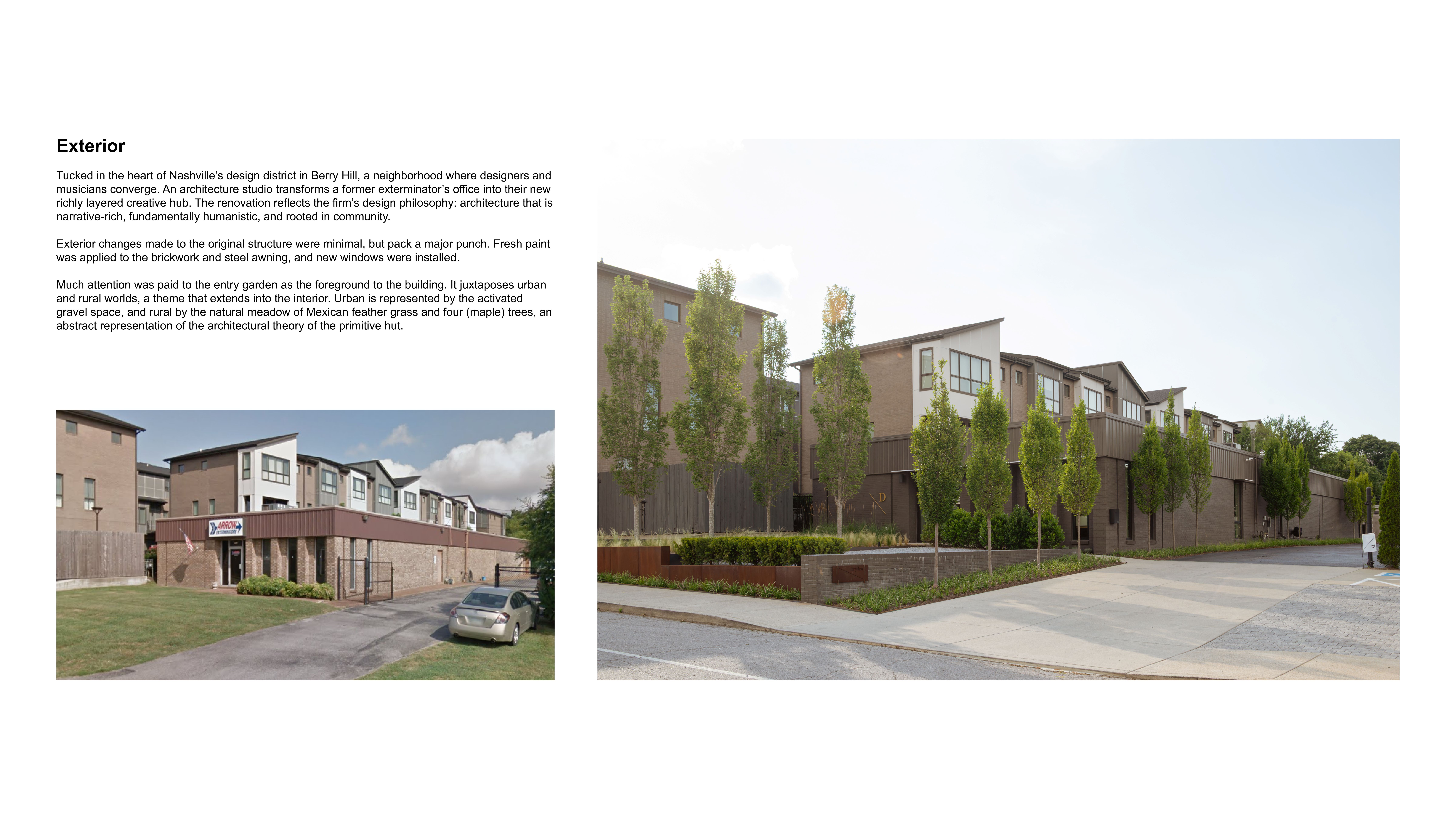 Tucked in the heart of Nashville’s design district in Berry Hill, a neighborhood where designers and musicians converge. An architecture studio transforms a former exterminator’s office into their new richly layered creative hub. The renovation reflects the firm’s design philosophy: architecture that is narrative-rich, fundamentally humanistic, and rooted in community.