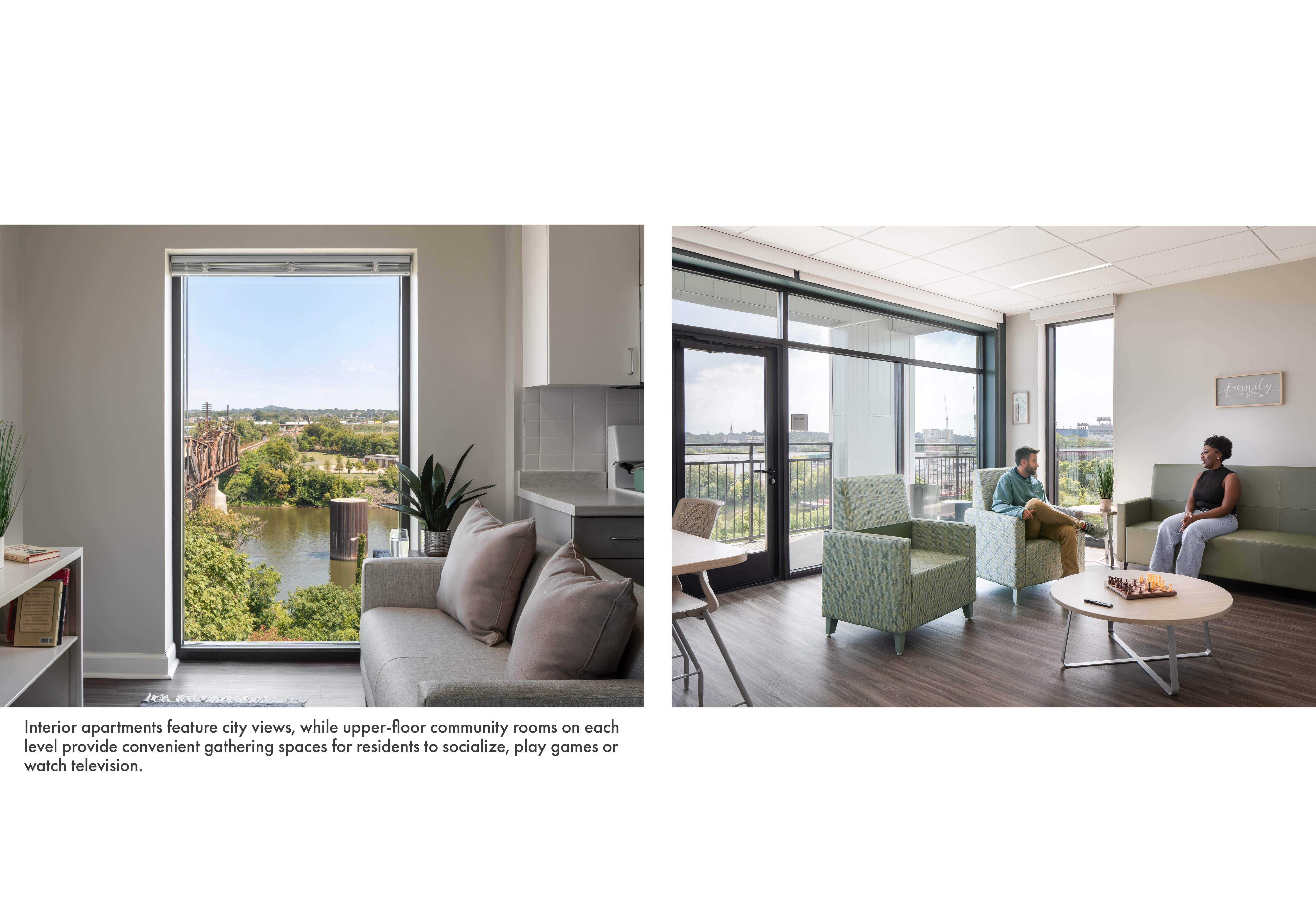 The LEED Gold-certified development comprises 90 fully furnished efficiency units, each featuring a private bedroom, bathroom, and kitchen. On-site amenities include a computer lab, multipurpose rooms, and outdoor terraces offering panoramic views of the river and Downtown Nashville. First-floor case management offices provide residents with on-site resources in a familiar setting, while nearby communal spaces support engagement, healing, and community-building.
