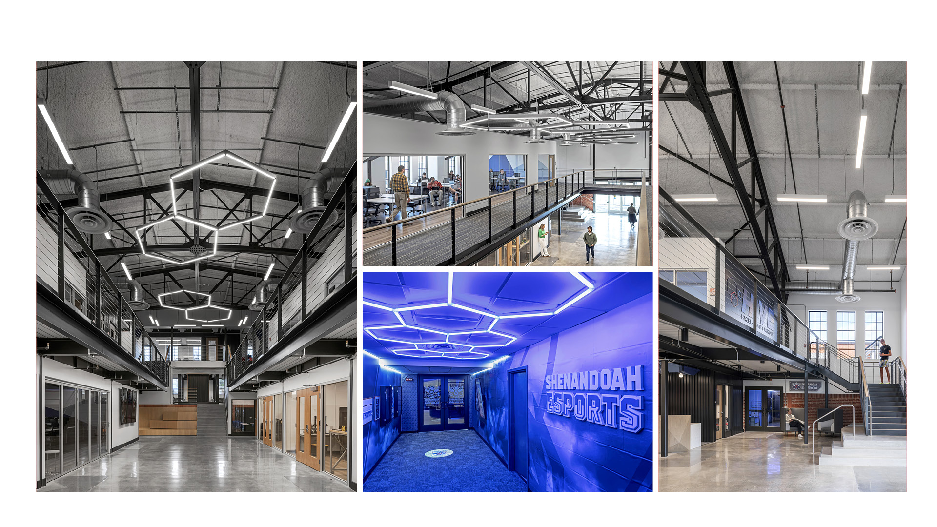 The HIVE is an adaptive reuse student center at Shenandoah University that transforms a 1940s military barracks and gym into a vibrant, multi-functional hub. The facility includes a veteran’s center, event space, e-sports arena, motion-capture studio, study areas, classrooms, and a business incubator, all in support of the university’s interdisciplinary vision.