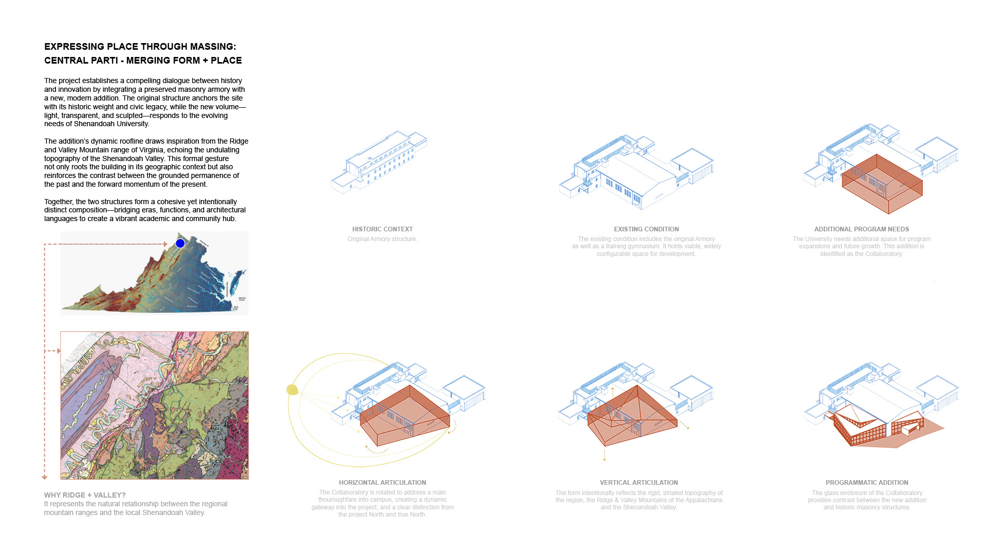 5 - Inspired by Virginia’s Ridge and Valley landscape, the design integrates historic preservation with innovative massing transforming the Winchester Armory into a dynamic academic hub rooted in regional identity.