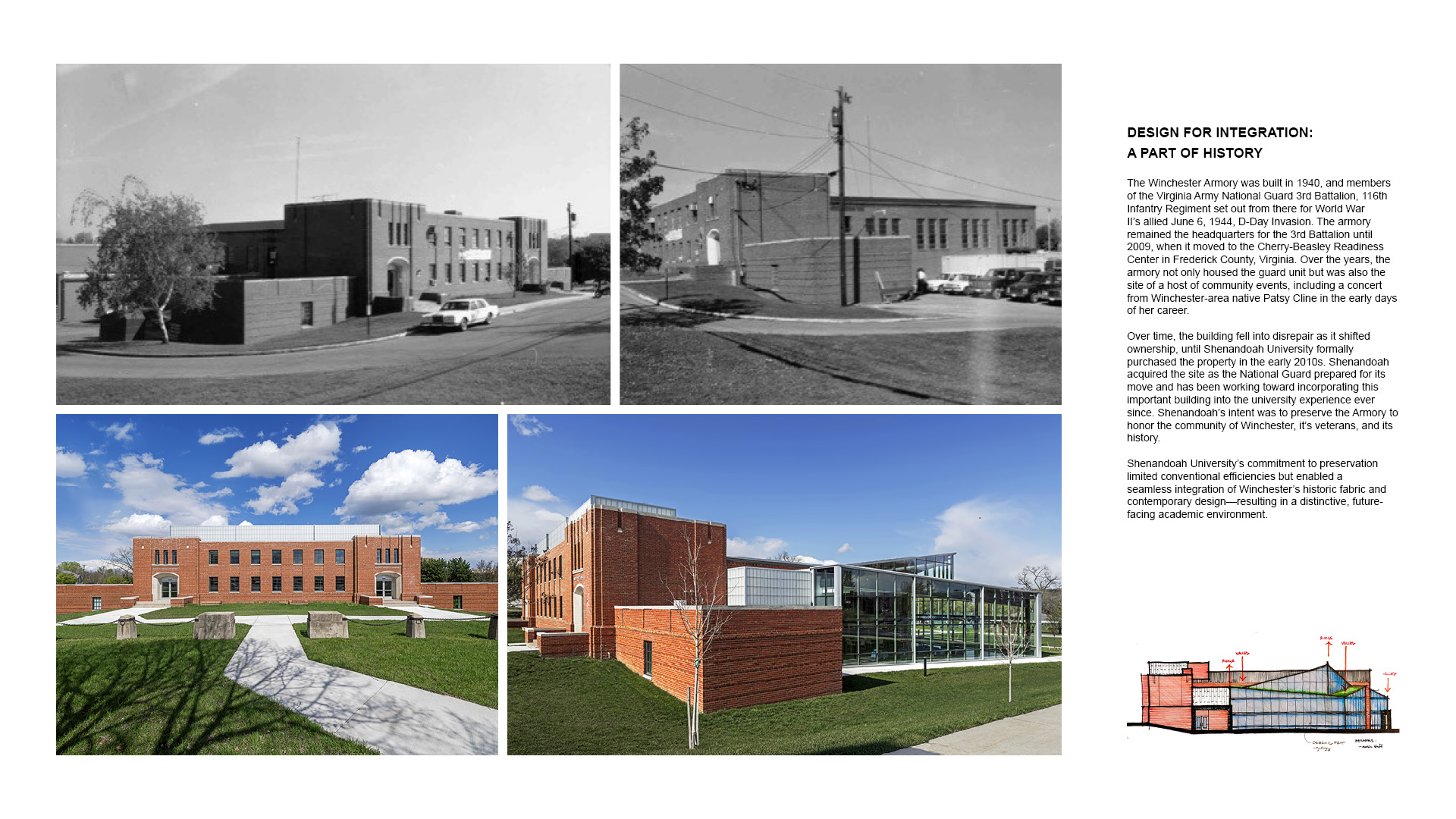 2 - Shenandoah University’s transformation of the historic Winchester Armory blends original 1940s architecture with modern design, preserving its legacy while creating a vibrant academic space for future generations.