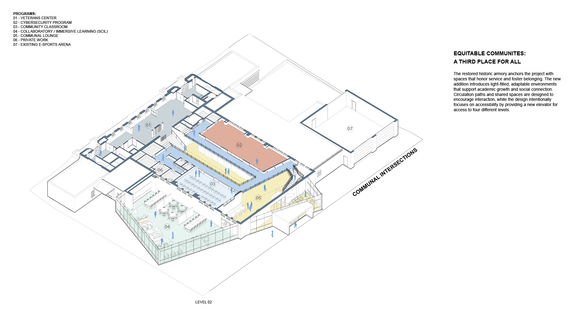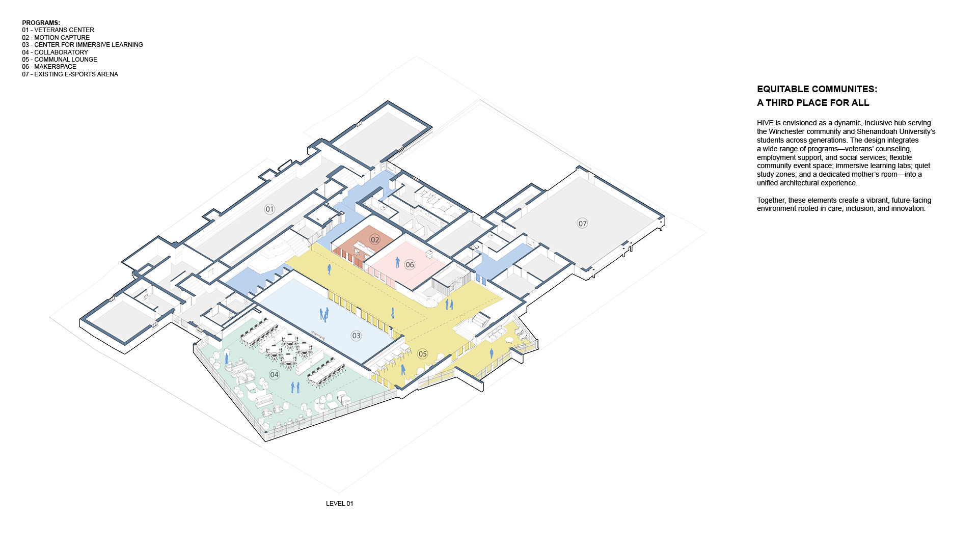 The HIVE is designed as an inclusive, multi-generational “third place” that bridges Shenandoah University and the broader Winchester community. The architecture supports a diverse range of programs—veterans’ services, social support, immersive learning, and flexible event spaces—within a unified, accessible environment.