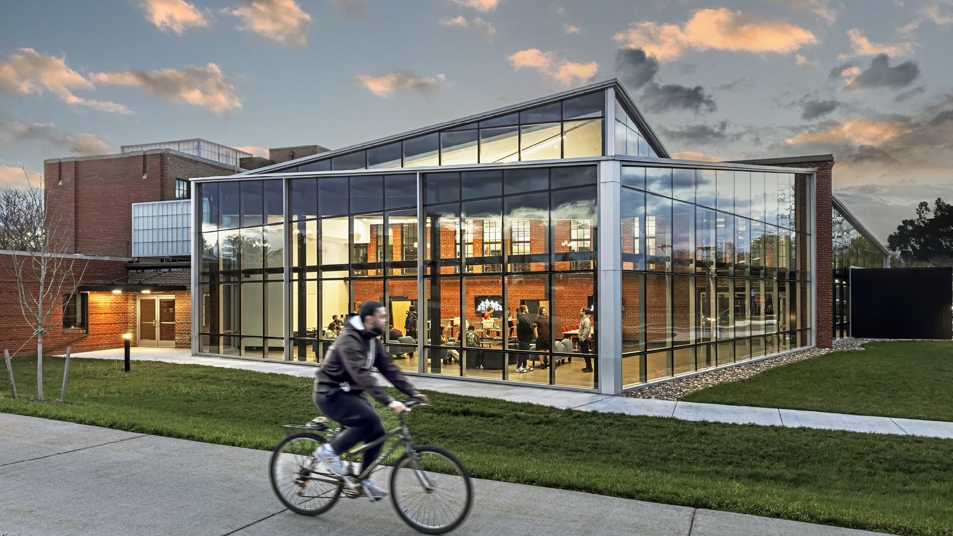 A striking new addition, named the “Collaboratory”, hosts the Shenandoah Center for Immersive Learning (SCiL) and serves as a 170-person event space. The dynamic glass form, through its shifting roof planes, reflects the region's topography of the Appalachian Mountains and the beautiful Shenandoah Valley and contrasts the original masonry structure.