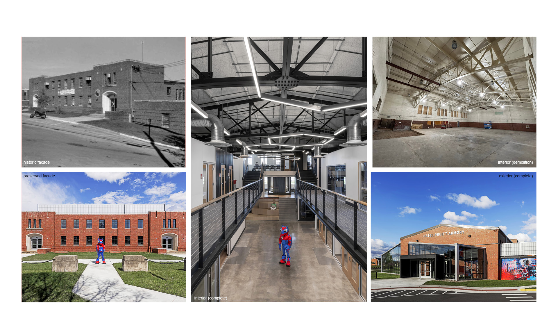 The gymnasium now houses immersive learning labs across two floors, including a new mezzanine level to expand the academic and administrative capacity. The adjacent two-story armory, with its historic Millwood Avenue façade, is repurposed as a Veteran’s Center offering counseling, employment support, and social services.
