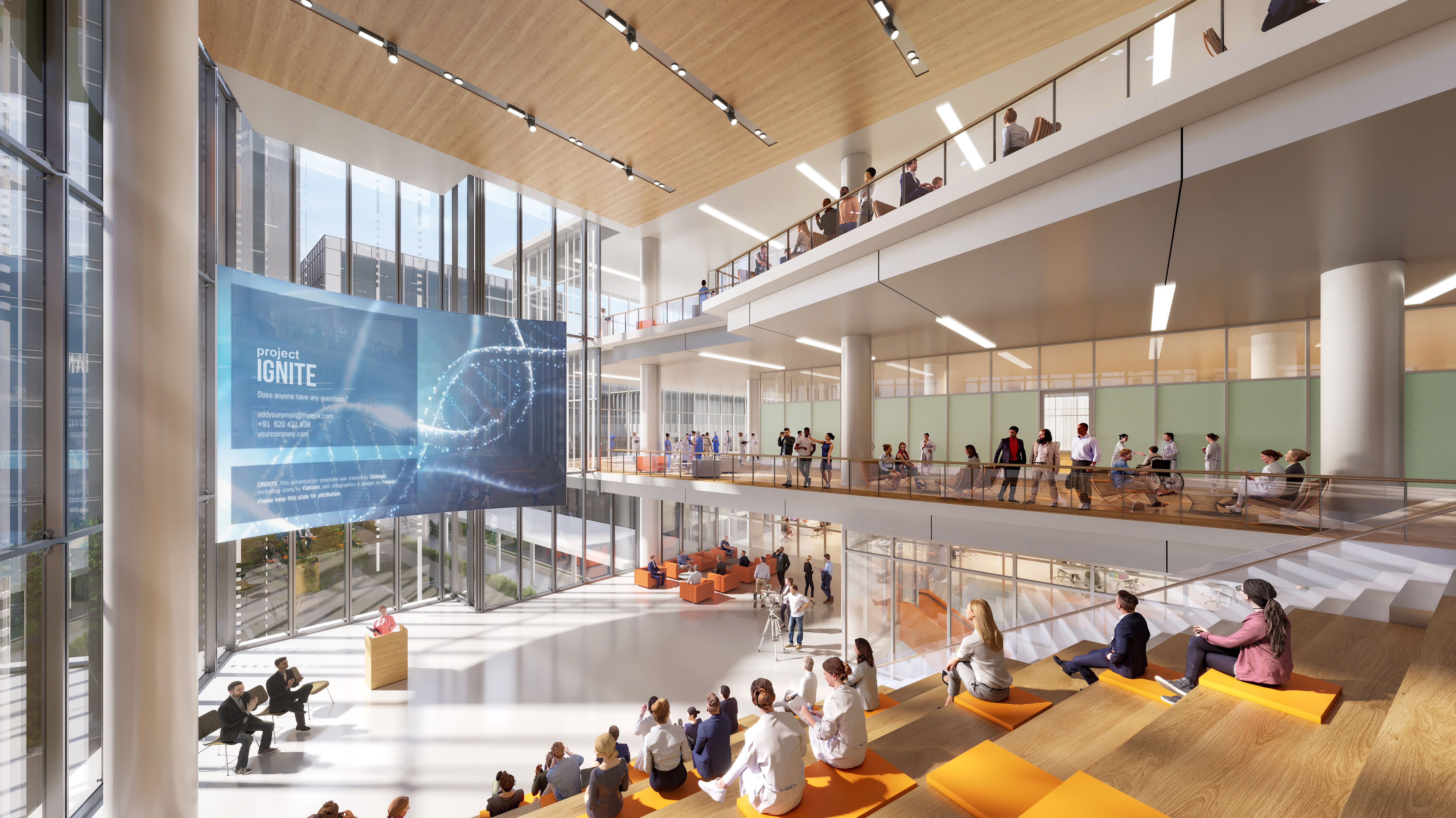The design prioritizes occupant well-being through patient-centered spaces, access to natural light, and biophilic elements like green spaces or views of nature. Quiet study areas and communal zones for medical students and researchers enhance mental health, while ergonomic, accessible design ensures comfort for all users, including patients, staff, and visitors.