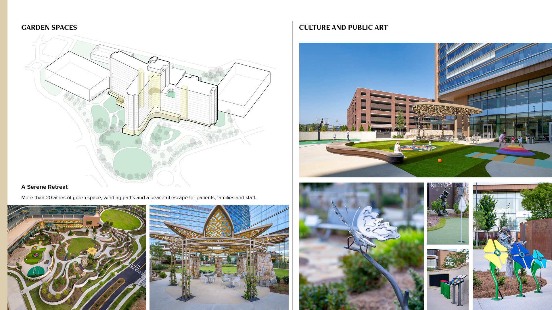 4 - A serene retreat of over 20 acres blends healing gardens with public art, creating a peaceful and culturally rich environment for patients, families and staff.
