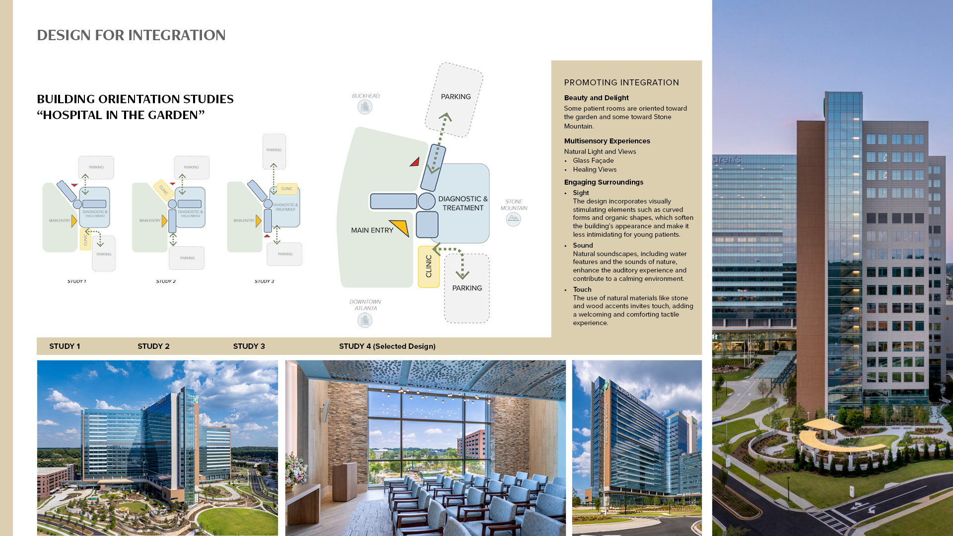 3 - Orientation studies and selected site plan illustrate the 'hospital in a garden' concept, emphasizing healing views, natural materials and green spaces to promote comfort and well-being.