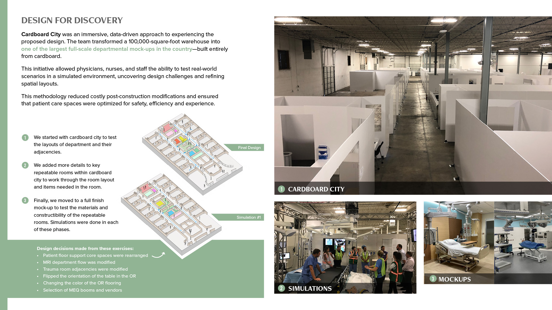 2 - Cardboard City: A full-scale, immersive mock-up built entirely from cardboard, enabling real-time simulations that informed critical design decisions for safety, efficiency and patient experience.