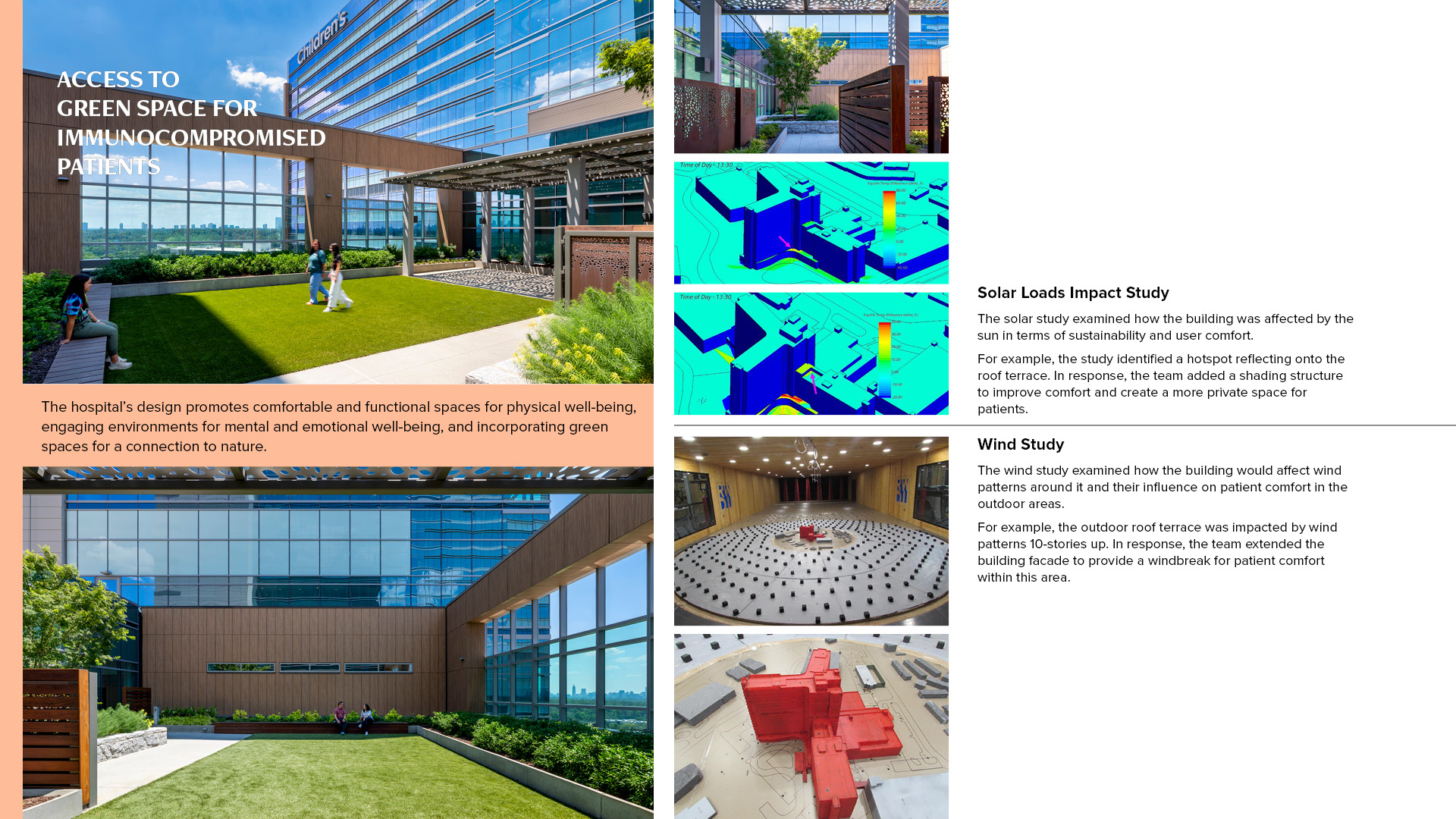 - **Environmental Comfort Studies** \n Solar and wind studies informed design adjustments, such as shading structures and windbreaks, to enhance outdoor comfort and usability for patients and staff.