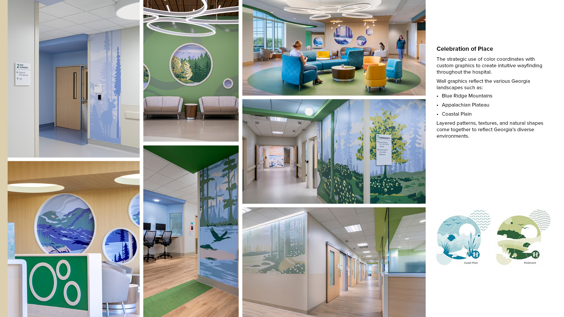 6 - Wayfinding inspired by Georgia’s landscapes connects patients to place through color, texture, and regional identity.