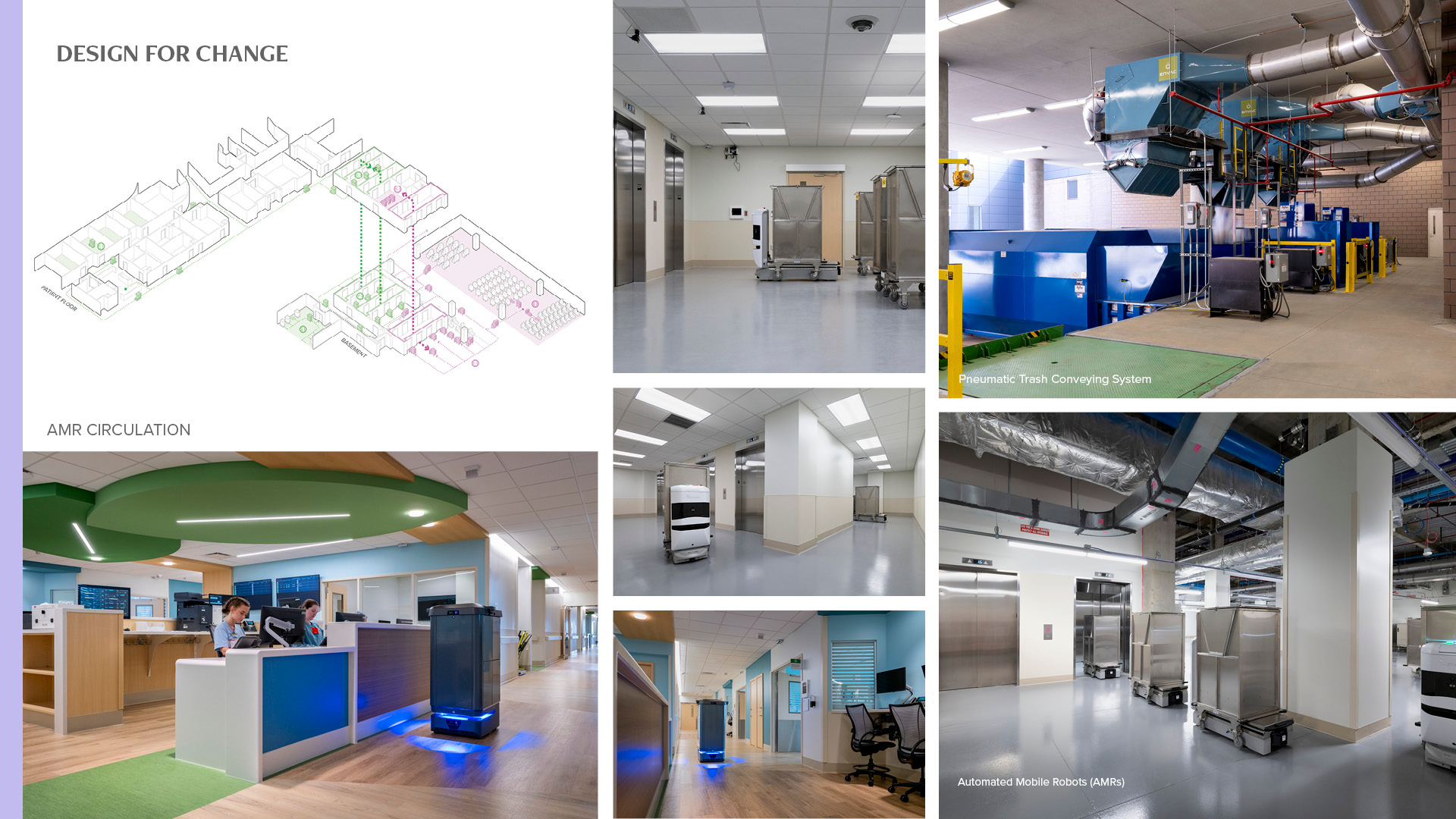 By supporting multiple AMR systems, the design reduces the need for costly future retrofits and allows for smoother technology integration. While specific performance data will be available post-implementation, industry benchmarks suggest automation contributes to cost savings, staff productivity, and better patient outcomes through faster, more reliable supply distribution. A **pneumatic trash conveying system** also reduces staff travel distances and frees up space typically used for waste holding and transport.