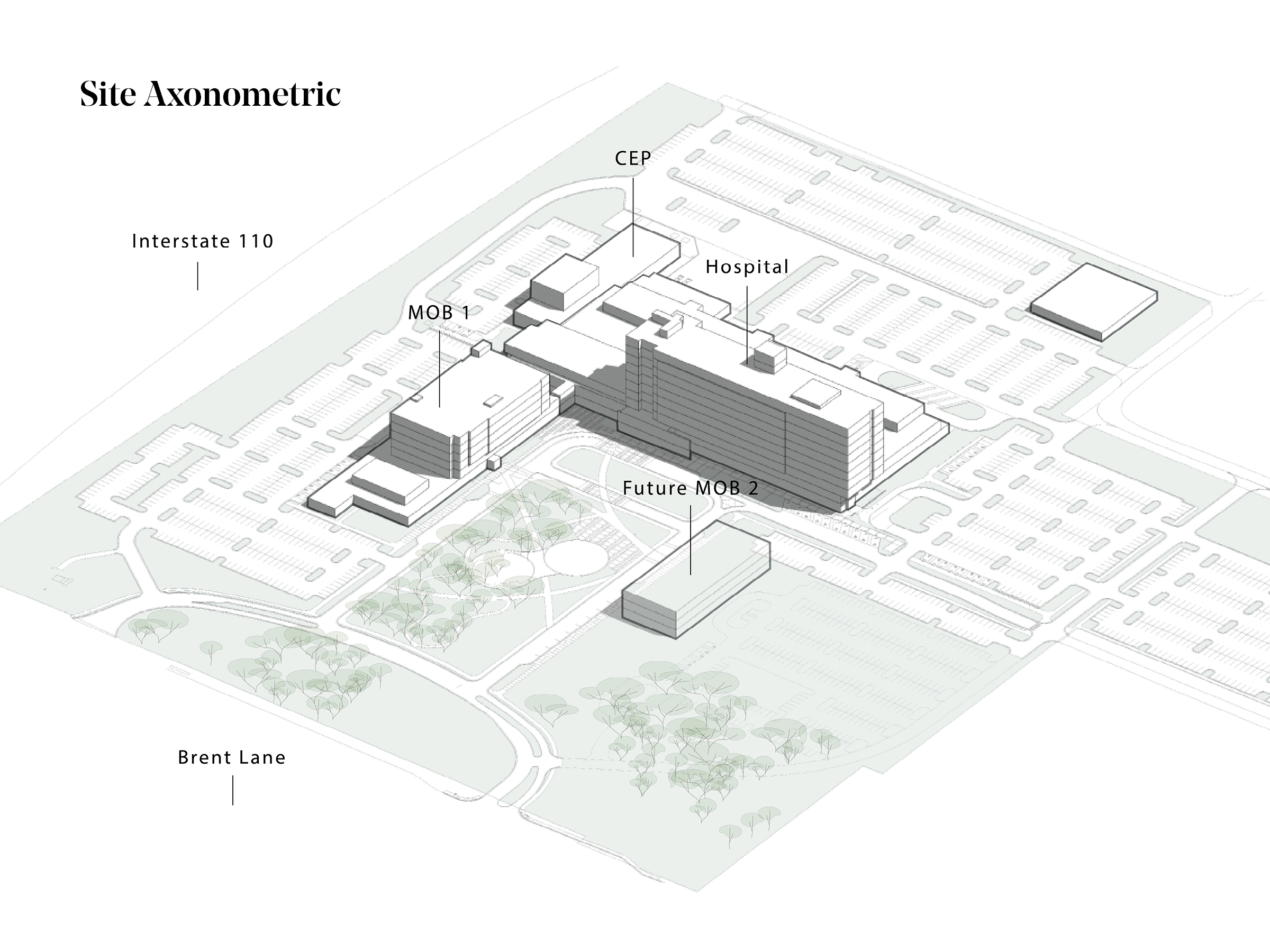 Baptist Health Care Pensacola’s Brent Lane Campus includes a 264-bed hospital, medical office building, and behavioral health hospital, organized around a new community “town square”.