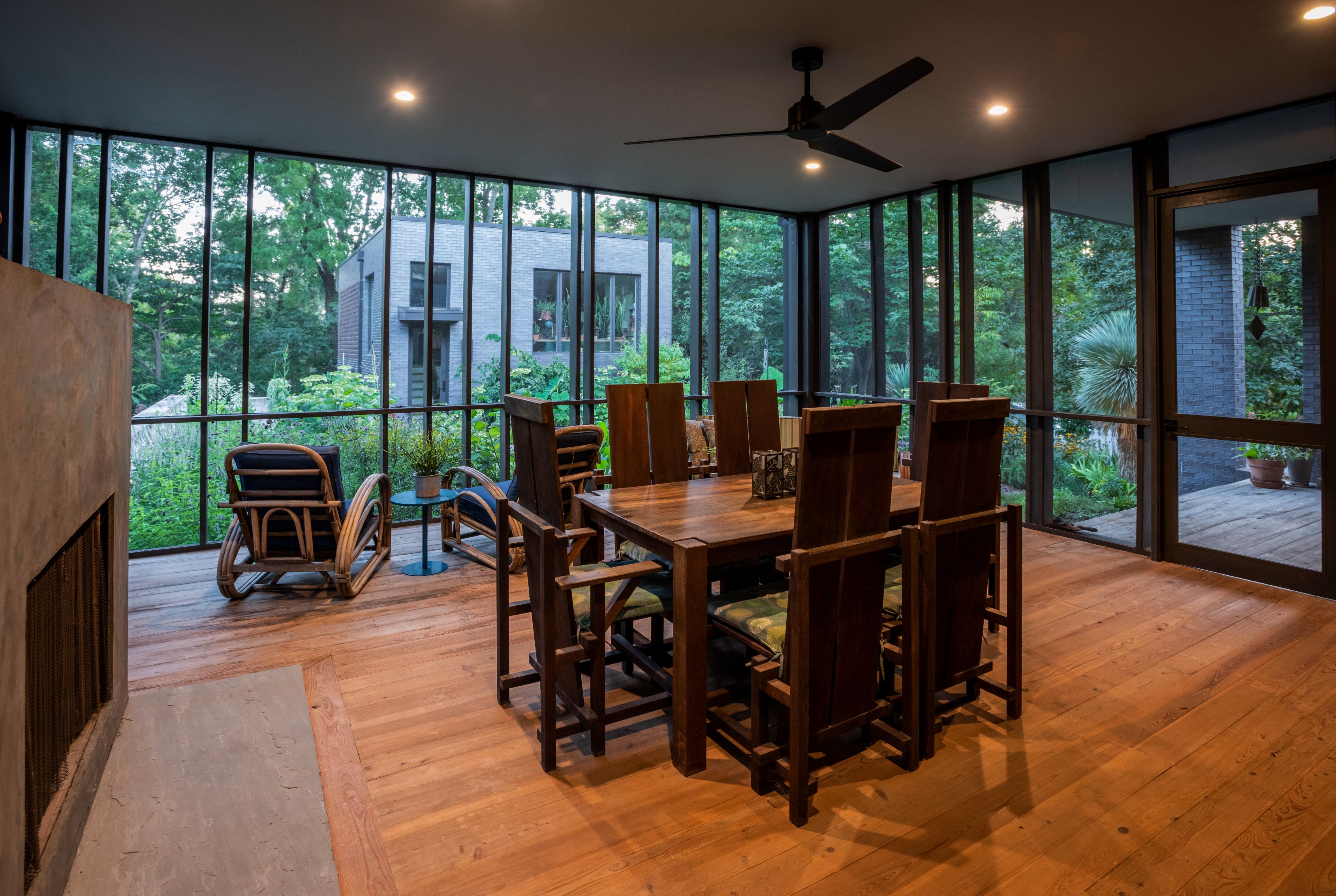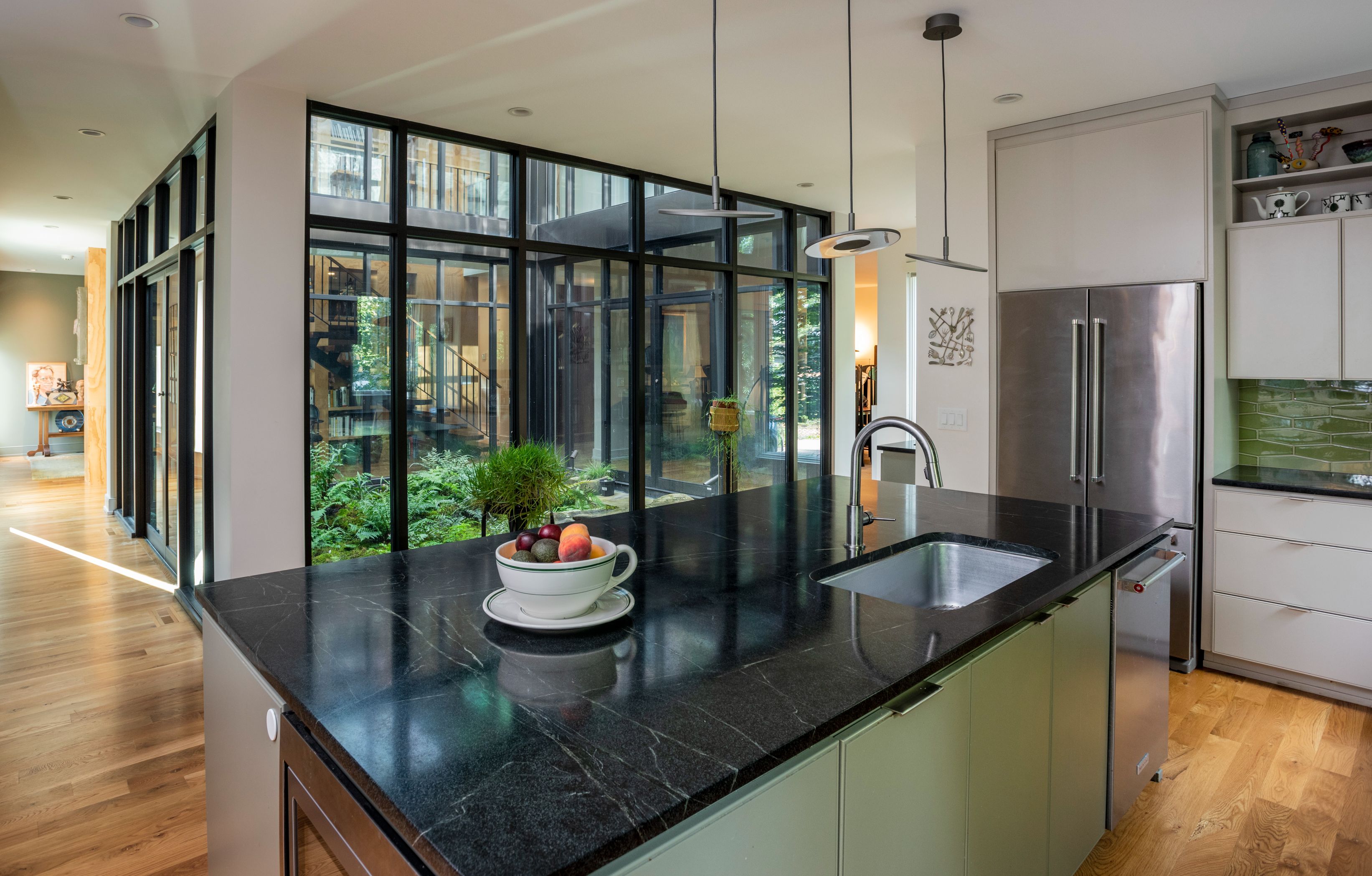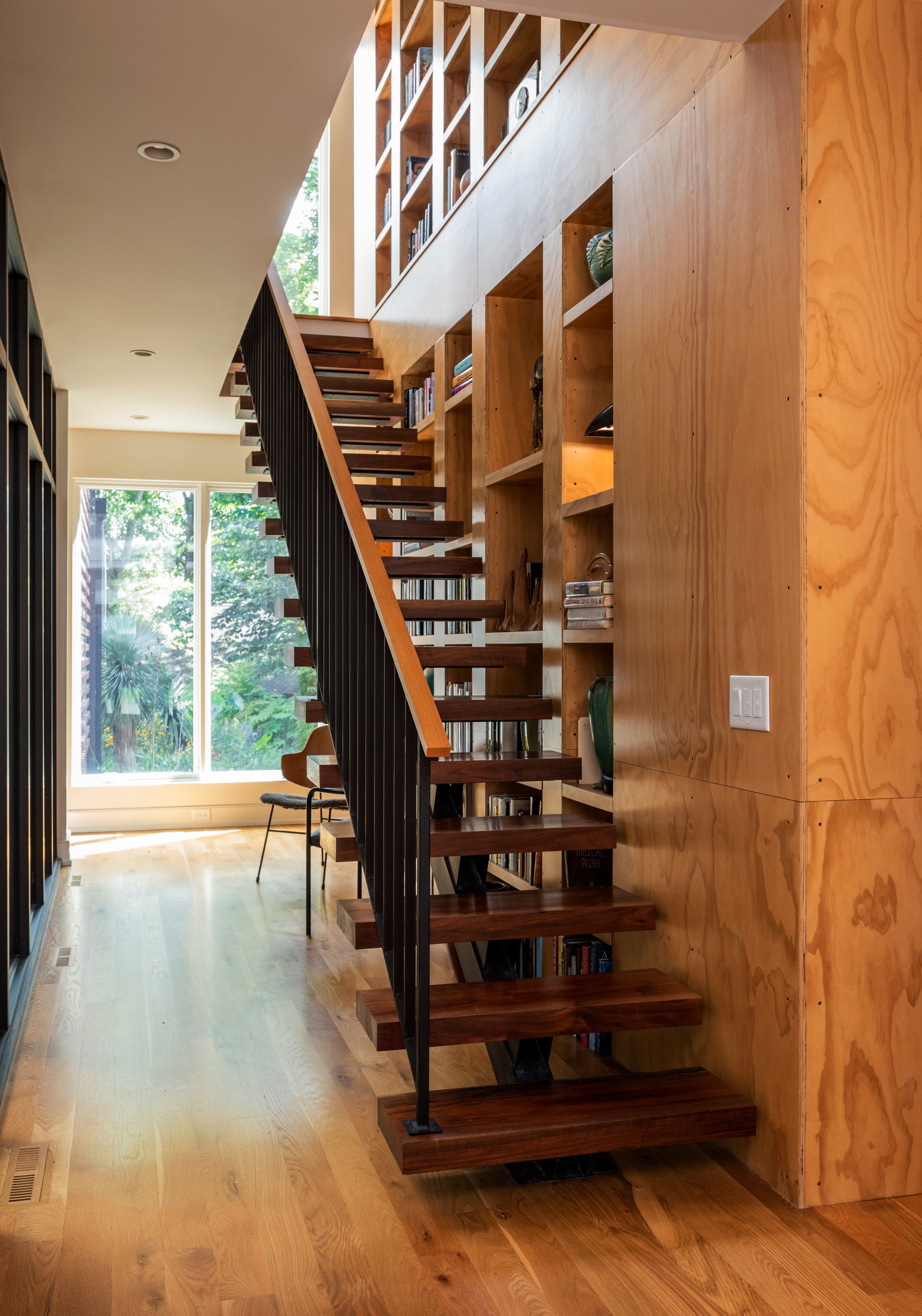 Throughout, the interior serves as a vessel for the owners’ art, furniture, and artifacts collected during travels around the world. Walnut accents—including a fireplace surround, custom closet doors, and floating stair treads—were milled from a large walnut tree removed from the site, extending a tangible connection to the land’s history. The floating stair is flanked by a two-story, double-sided bookcase wall, creating a dramatic vertical display of books and art visible through the glass courtyard from nearly every angle.