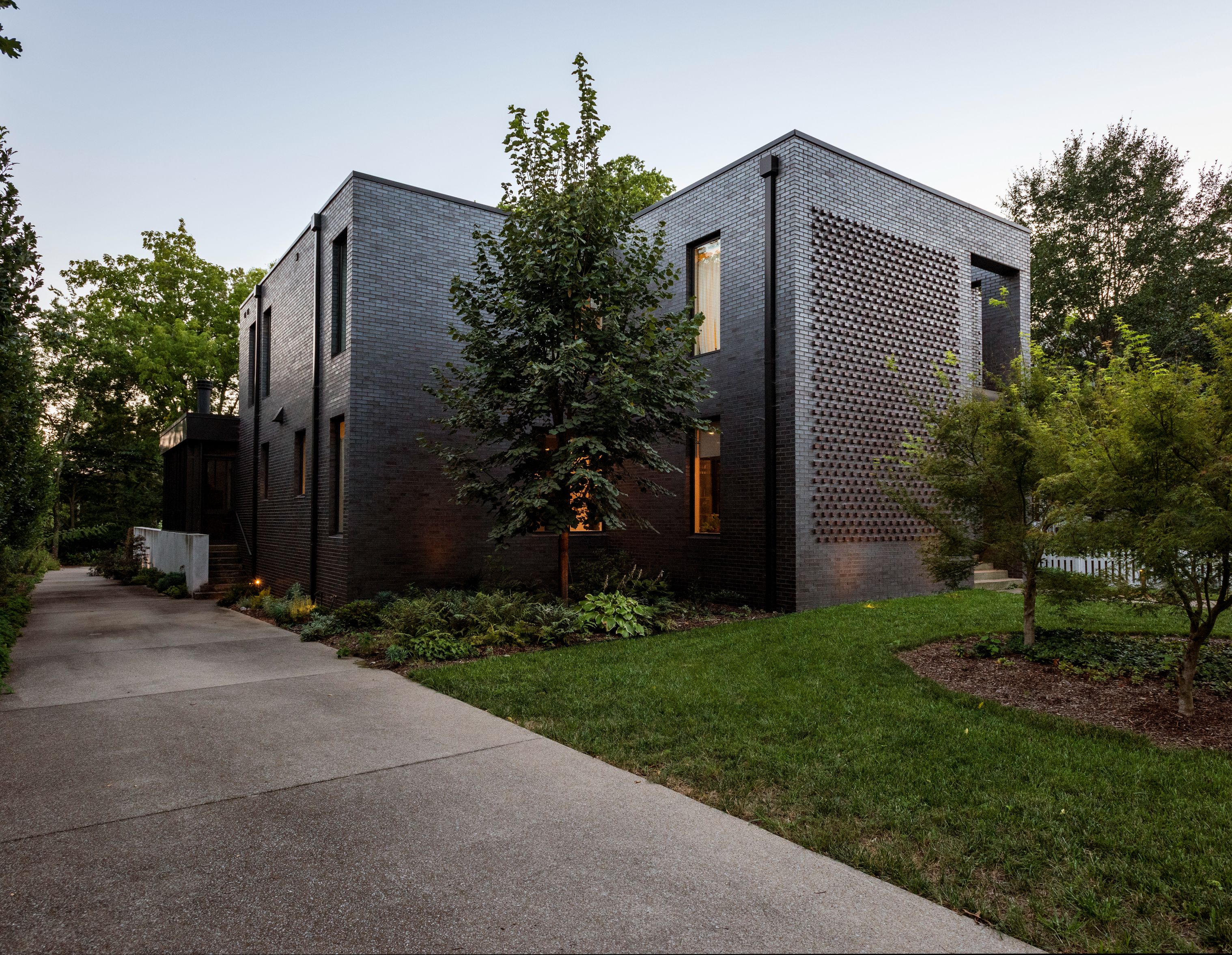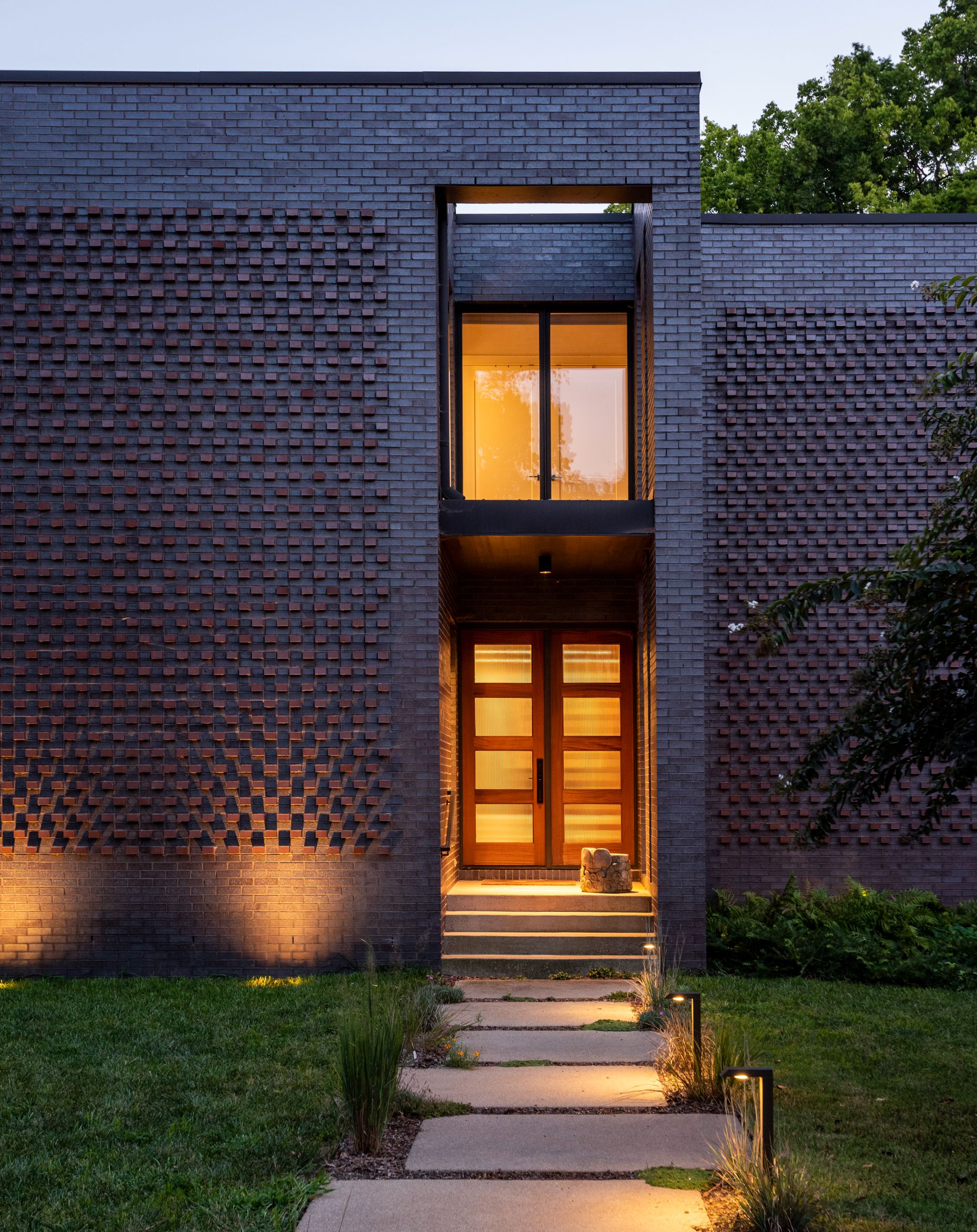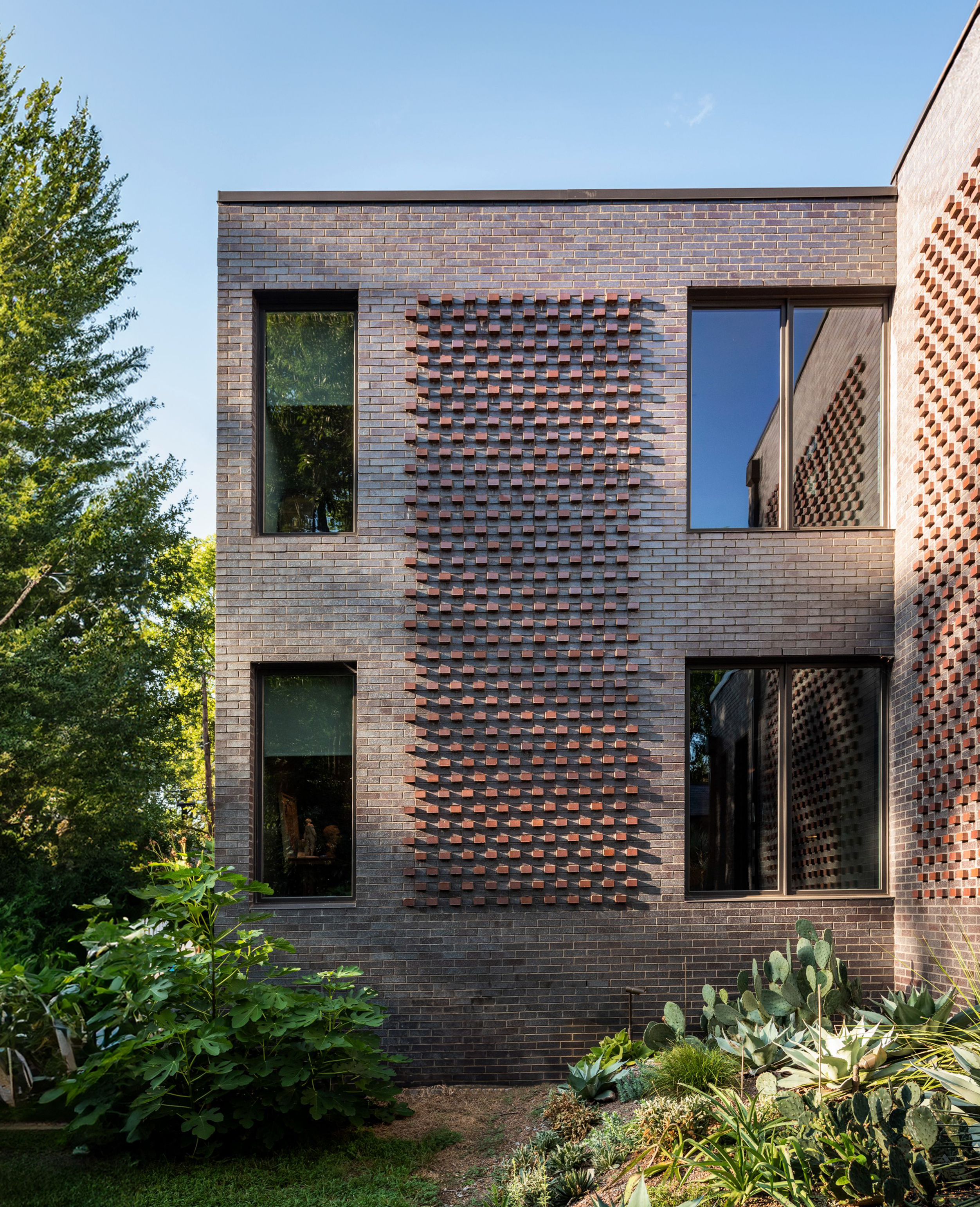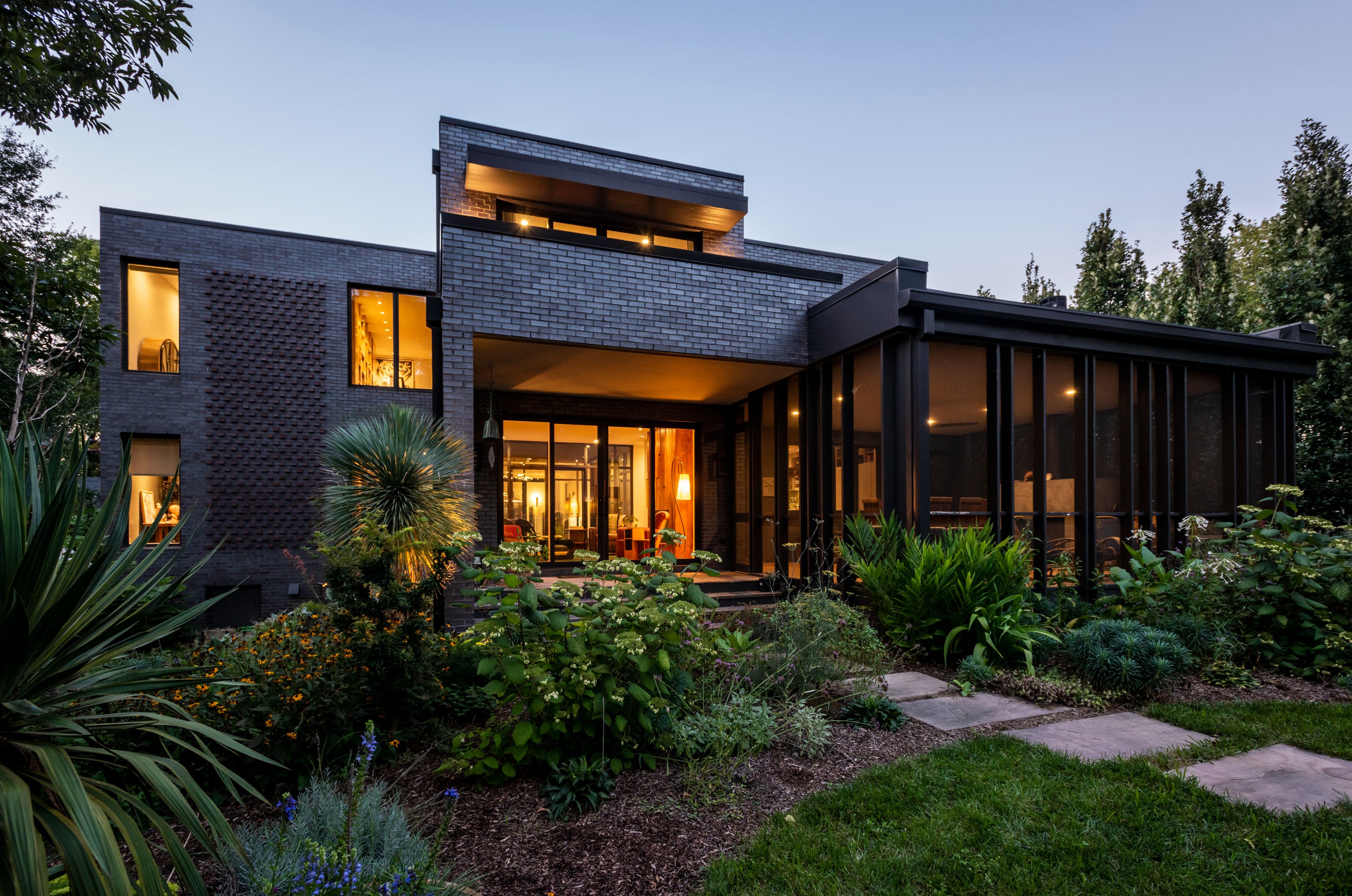The exterior is clad in dark brick that recedes into its green surroundings, with subtle brick detailing providing craftsmanship and texture across otherwise minimal façades. The placement of solid and void was intentionally balanced, providing privacy from the street while opening framed views to the landscape. The owners’ passion for gardening informed the design of the site, where lush plantings and exotic species soften the home’s geometric form and weave nature into daily life.