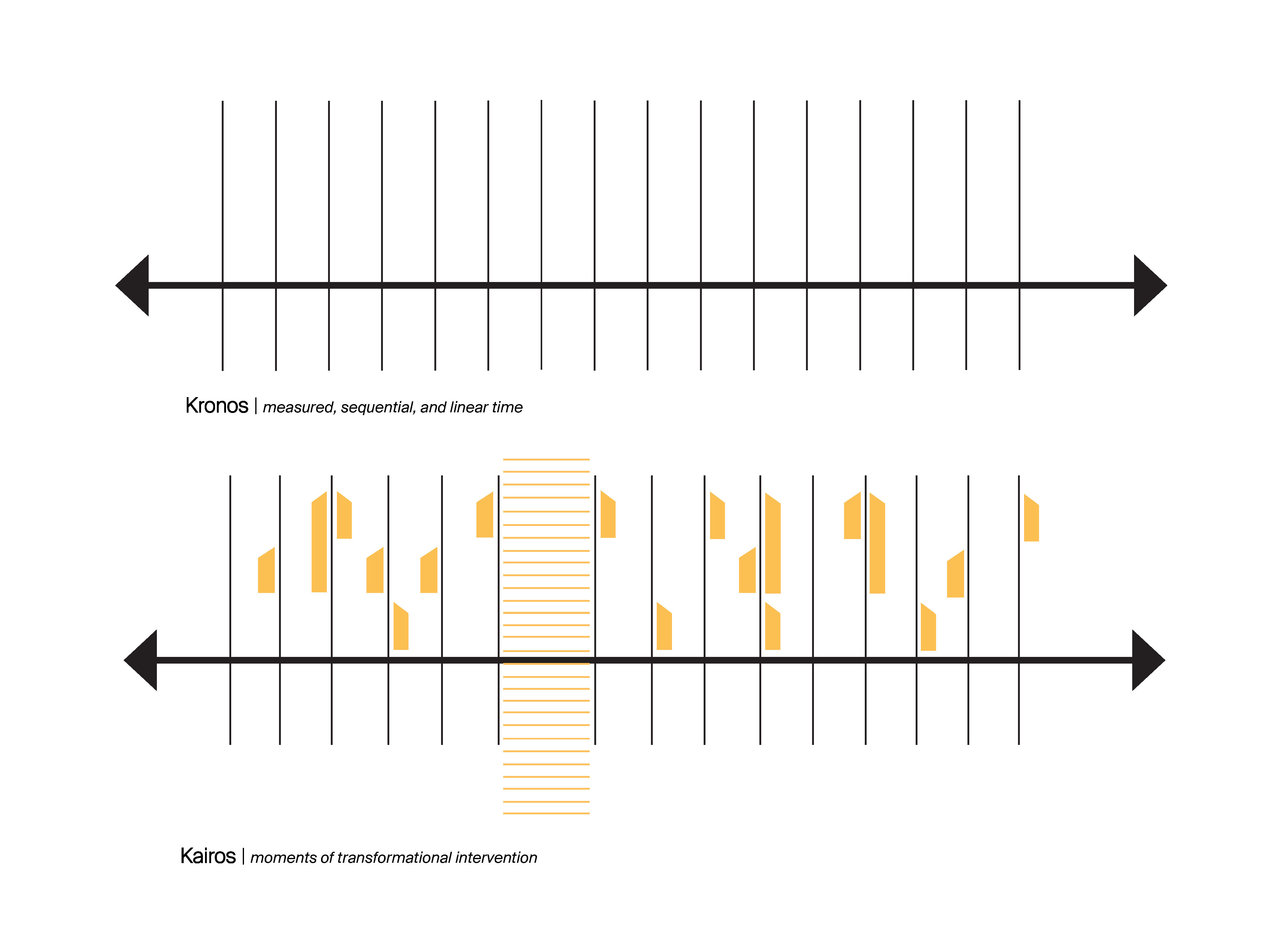 The architecture moves between rhythm and rupture—regular forms recall the passage of time, while sharp recesses and shifting planes mark moments of transformation. These contrasts give form to the layered nature of time itself: Kronos and Kairos
