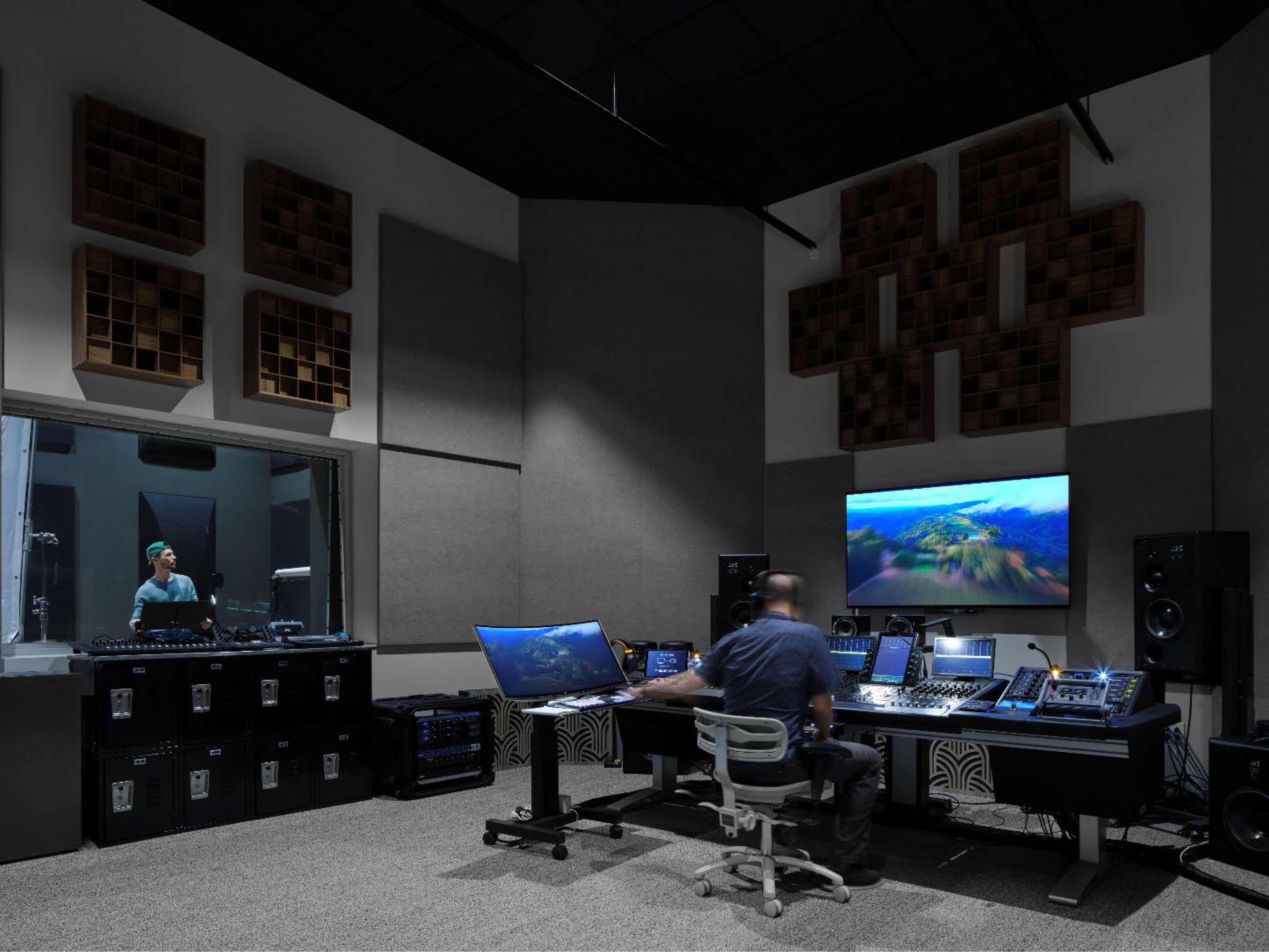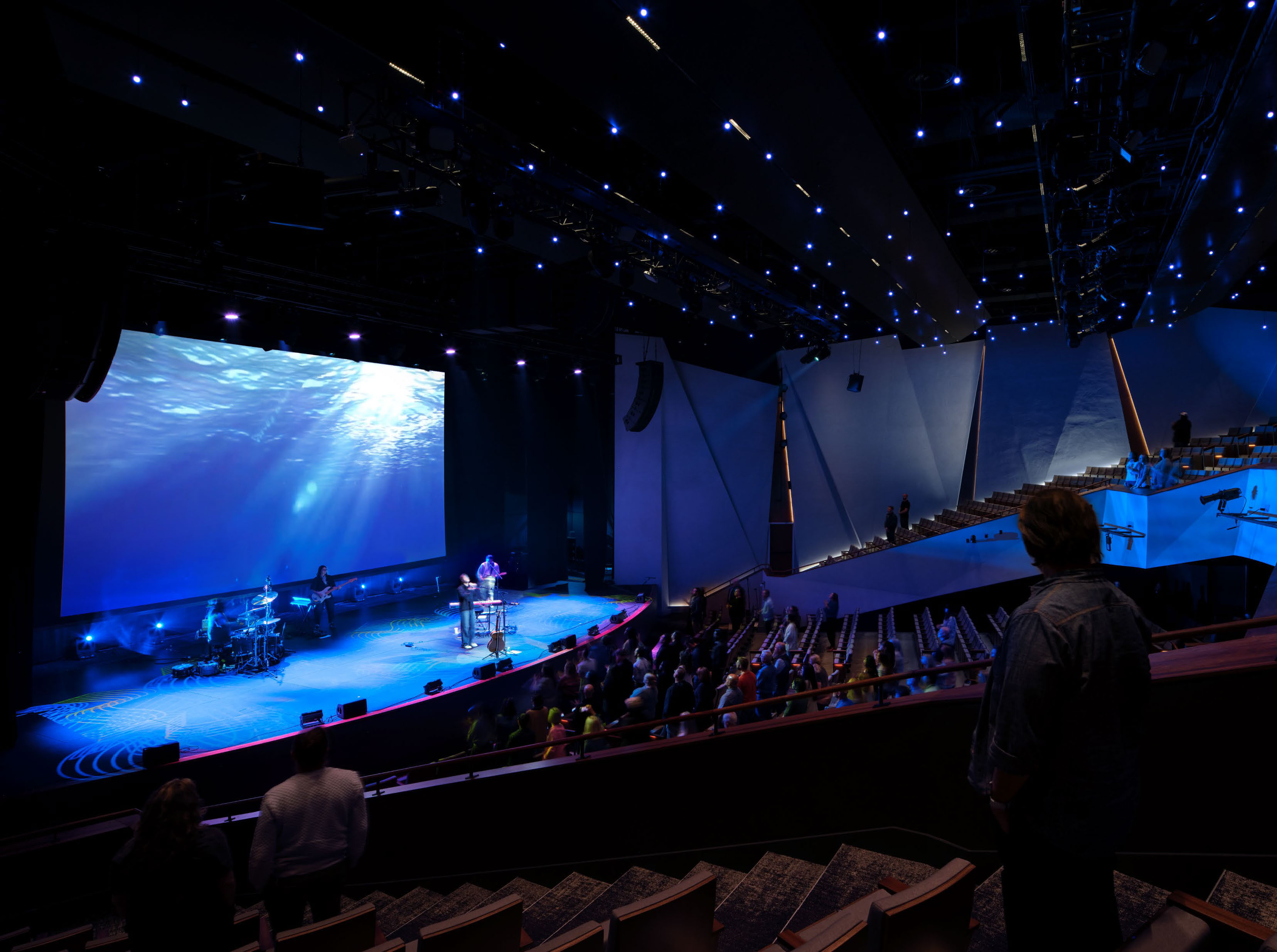 Internally, the building supports a diverse array of programmatic needs. Spaces include on-air studios, content capture zones, editing suites, and a full data center, along with donor engagement, audience experience, and pastoral care offices. A 1,100-seat performance venue doubles as a worship space and content capture recording venue.