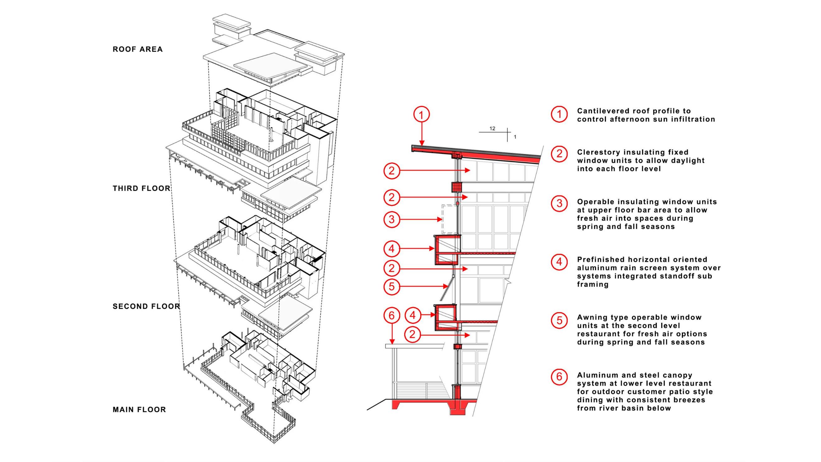 3. Building modeling and section indicating cantilevered roof profile, outdoor patio awning, operable window units and materials.