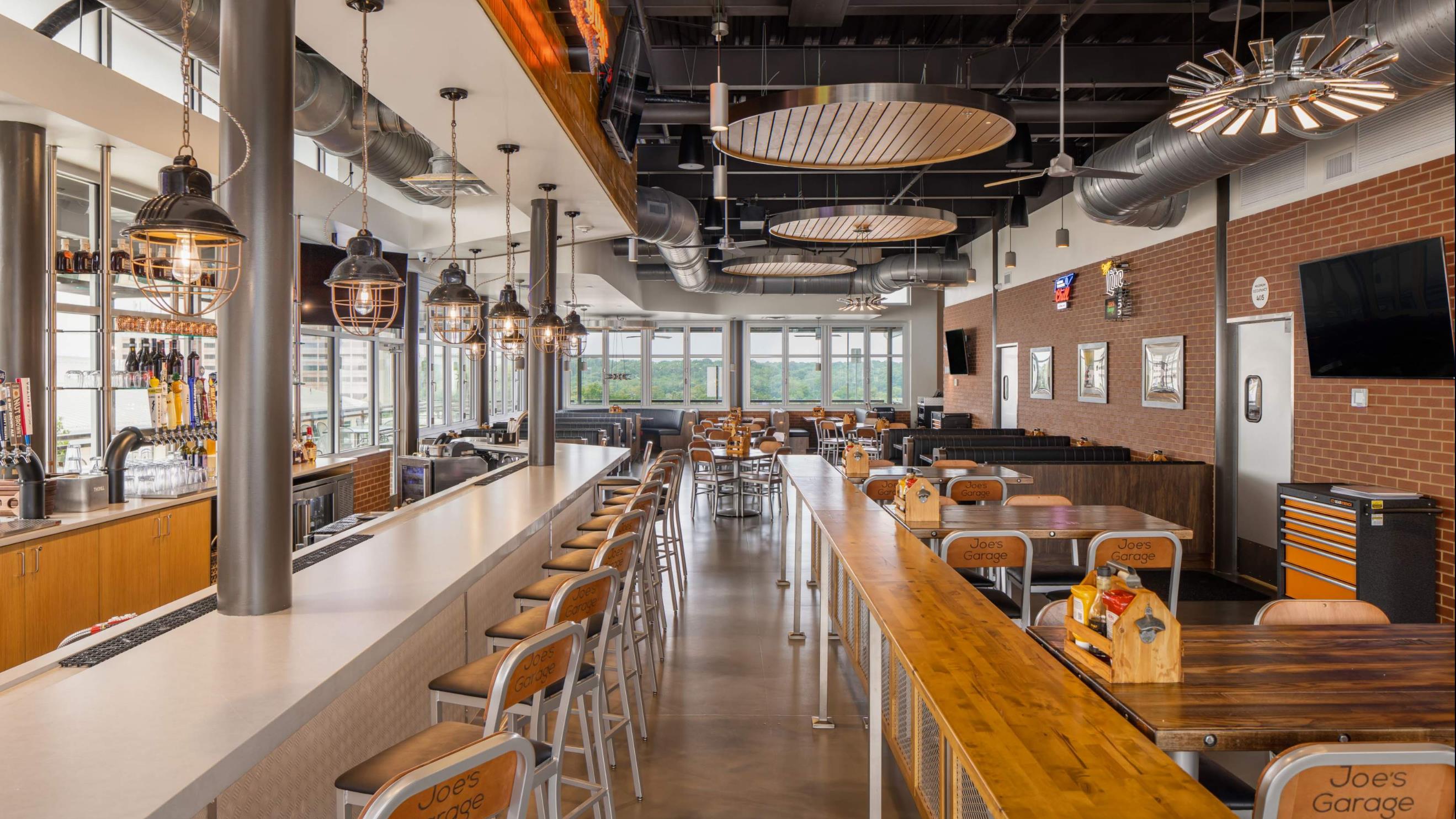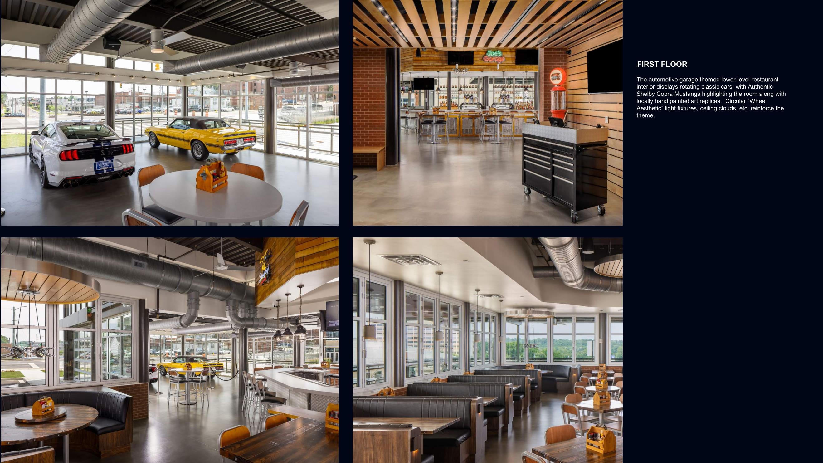 7. Sample photography of the first level restaurant which focuses on a variety of seating options and paying homage to the owner’s love of cars.