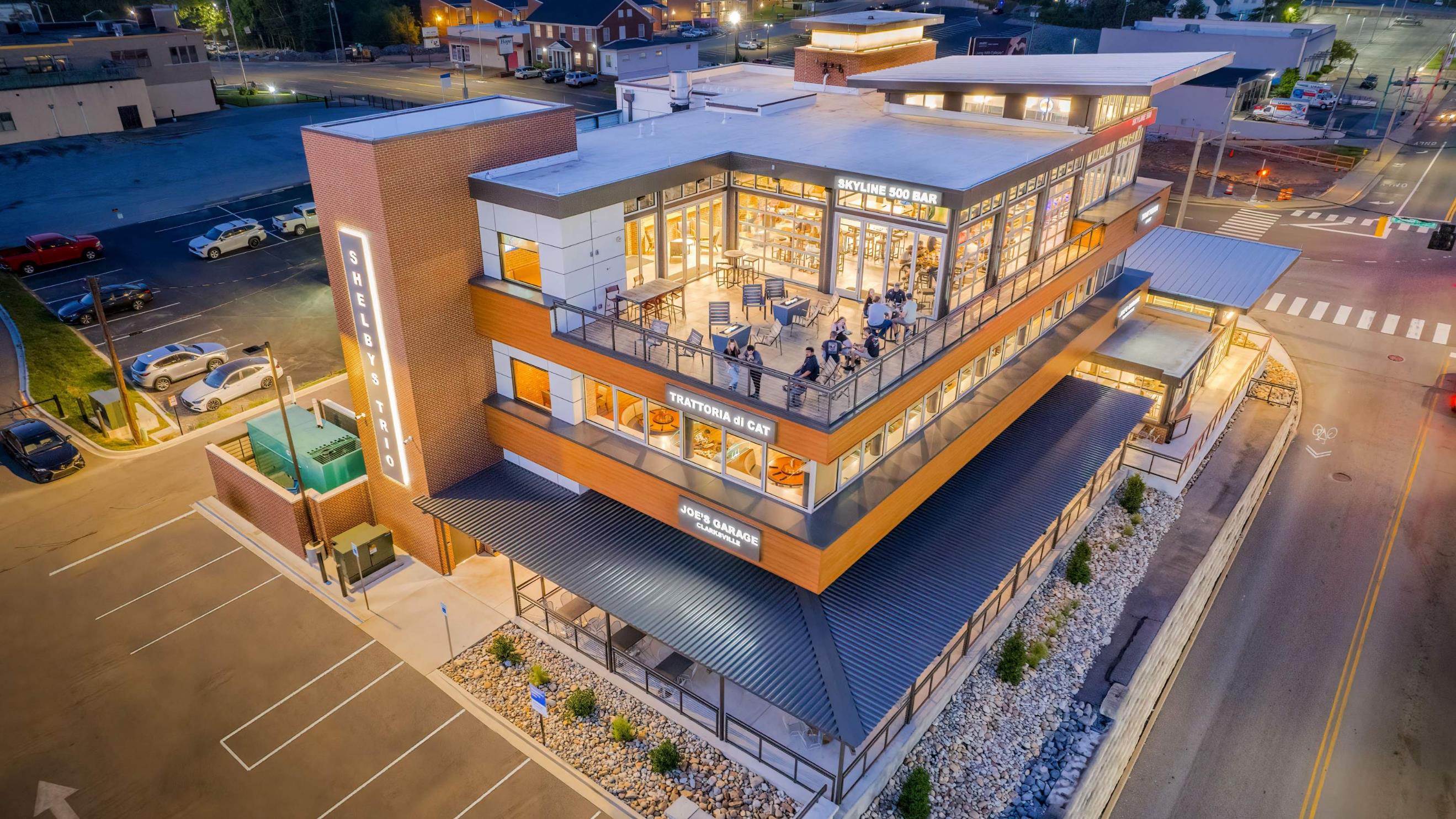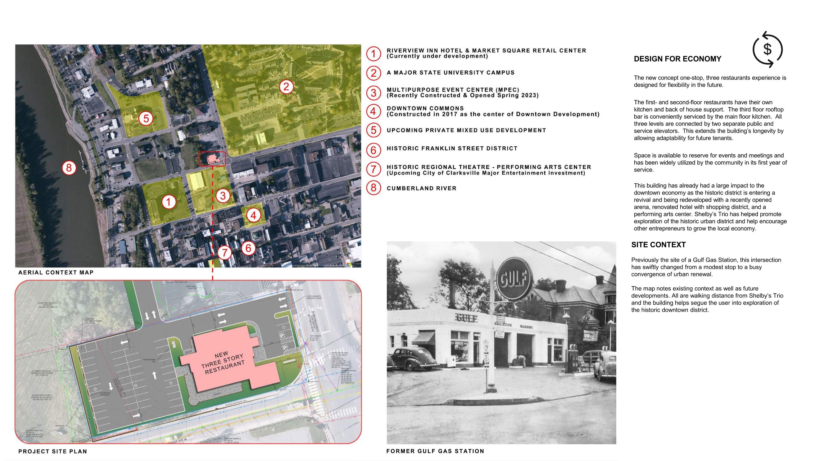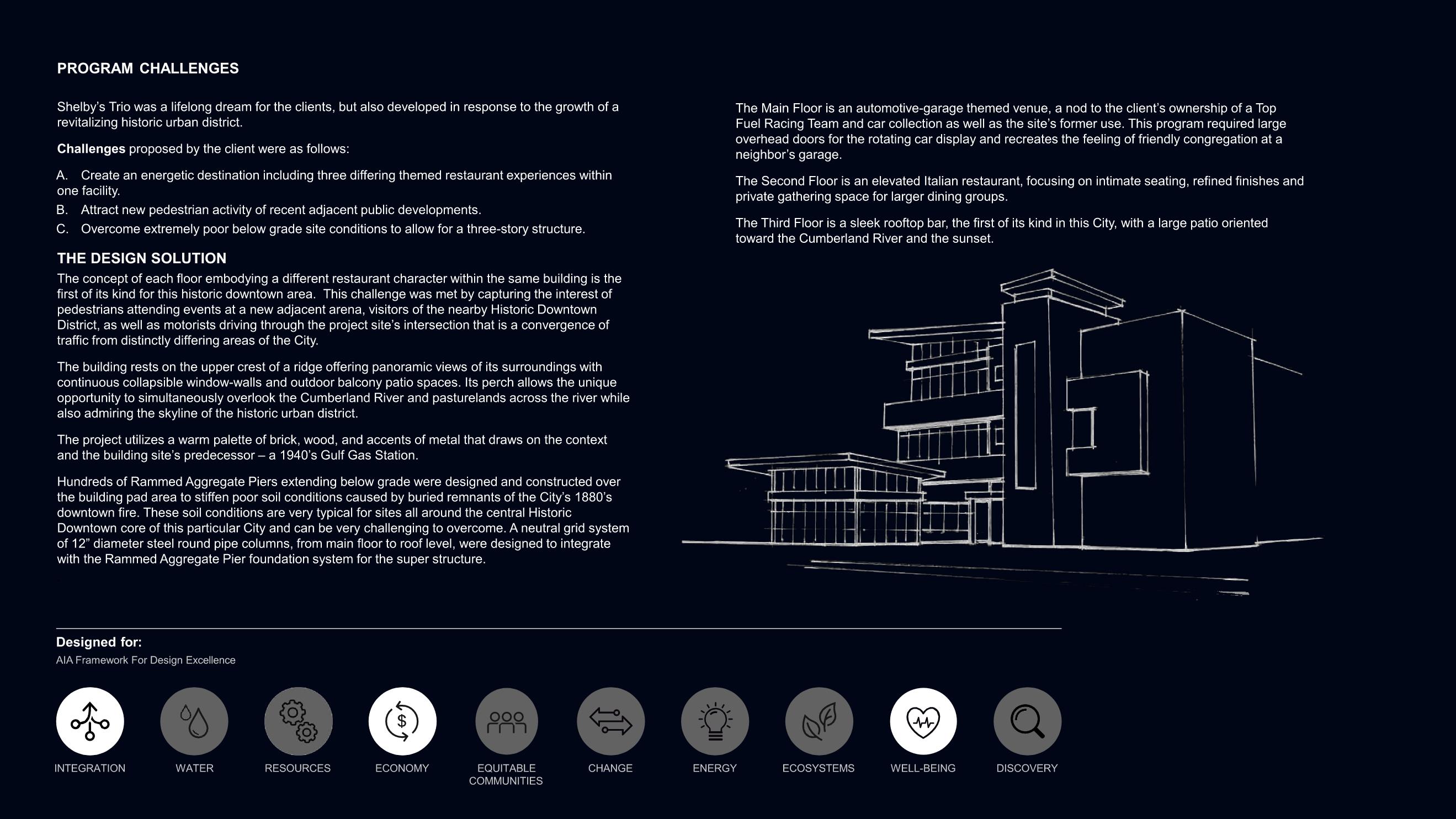 Shelby's Trio was the fulfillment of a lifelong dream for the clients, but also developed in response to the growth of a revitalizing historic urban district. Challenges proposed by the client were as follows: create an energetic destination including three differing themed restaurant experiences within one facility; attract new pedestrian activity of recent adjacent public developments; and overcome extremely poor below grade site conditions to allow for a three-story structure.