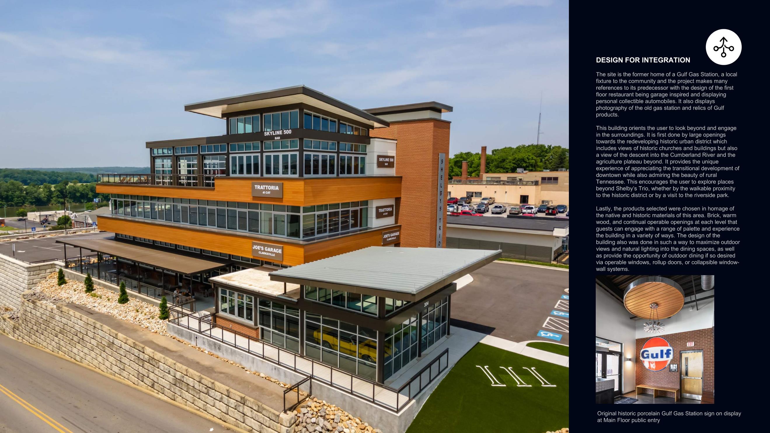 - Integration - The site is the former home of a Gulf Gas Station, a local fixture to the community and the project makes many references to its predecessor with the design of the first floor restaurant being garage inspired and displaying personal collectible automobiles. It also displays photography of the old gas station and relics of Gulf products.