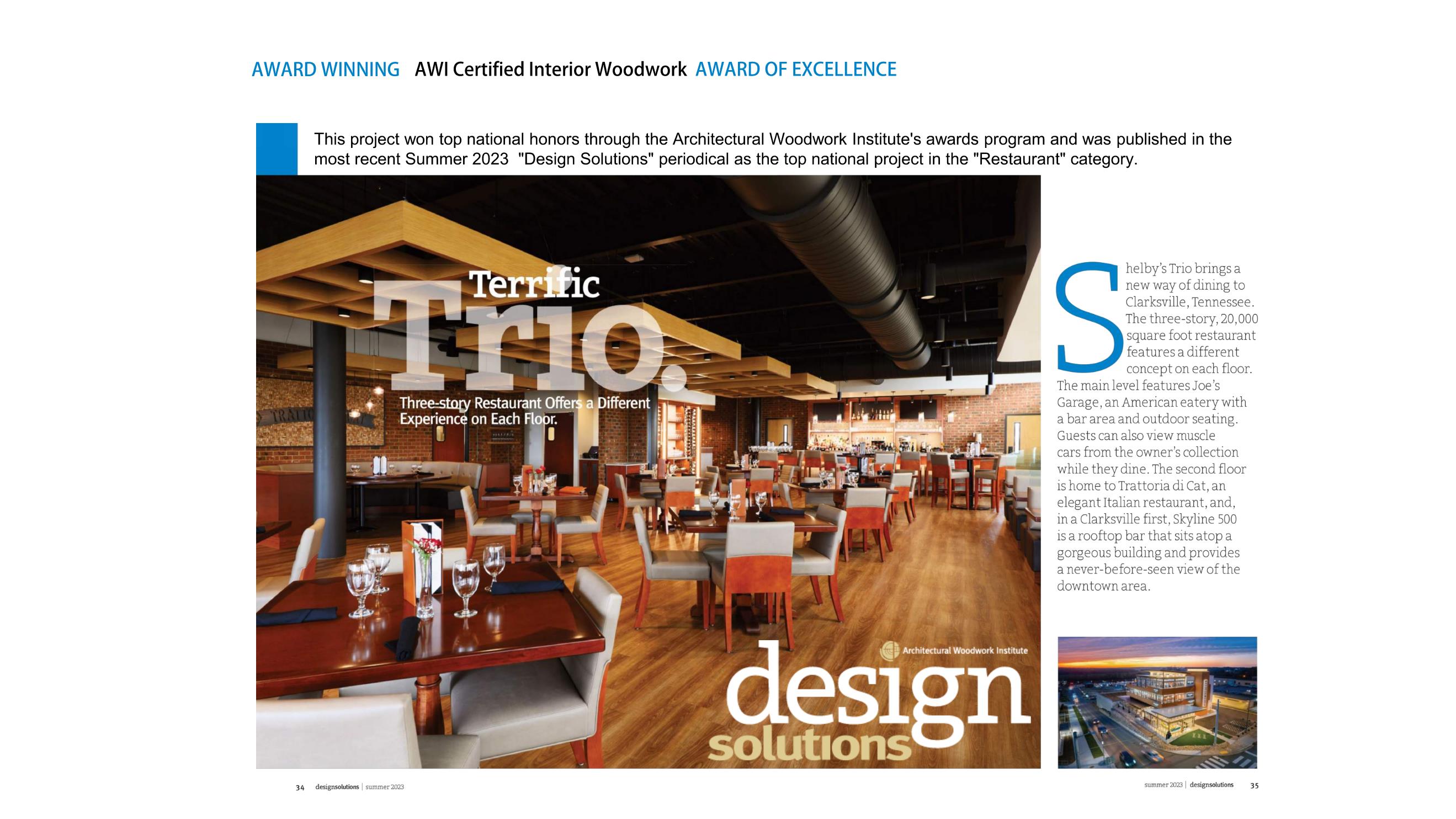 11. Design Solutions Magazine Summer 2023 edition, published as Award of Excellence for AWI certified interior woodwork.