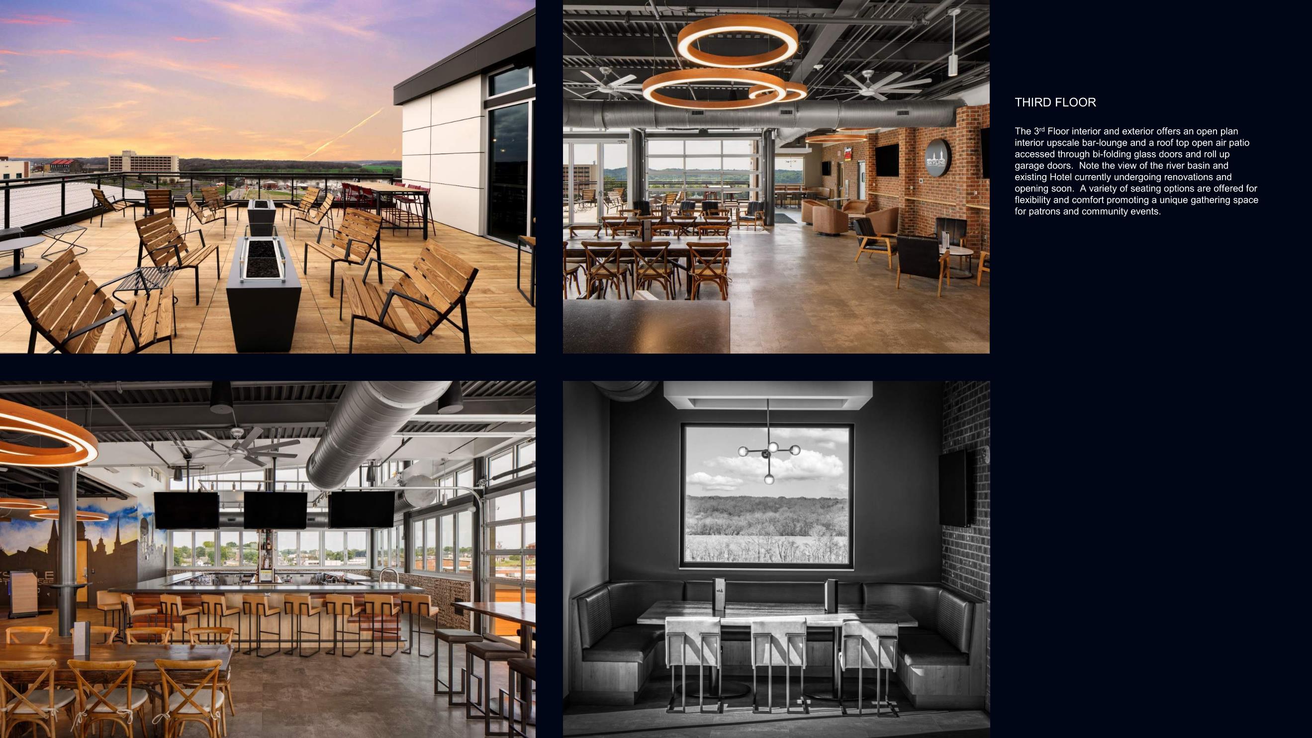 12. The 3rd Floor interior and exterior offers an open plan interior bar-lounge and a rooftop open air patio accessed through bi-folding glass doors and roll up garage doors. Note the view of the river basin and existing Hotel to be renovated very soon.