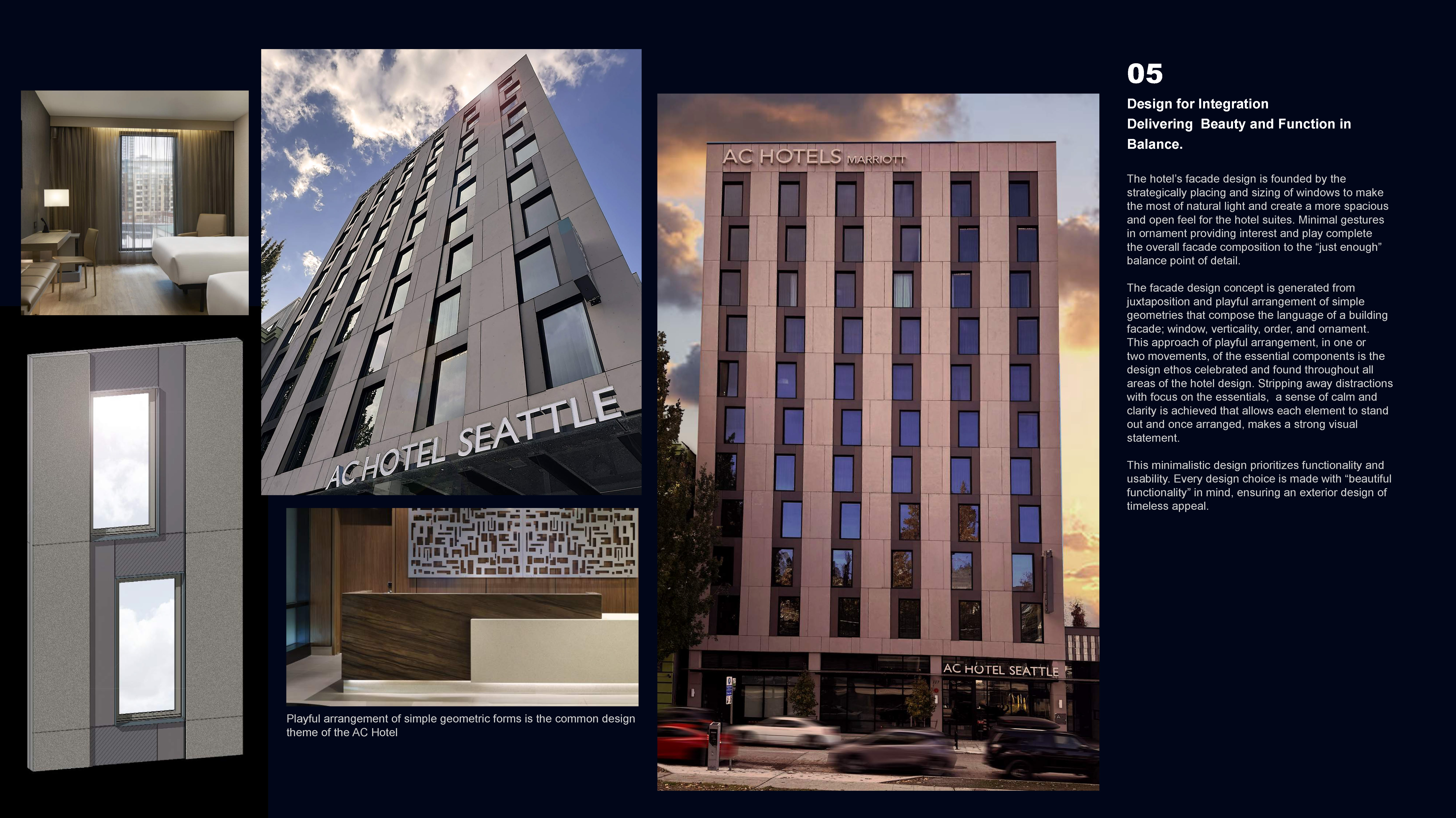 Making a building as functional as possible is a universal goal. Finding “the beauty of less” has been hallmark of the minimalist movement. All too often functionality has been achieved without the aesthetics that separate reduced from refined, or simple to sleek. It is also often misconceived that minimalism only applies to the visual. With the visual as our dominant sense, a building that works with ease and simplicity can elevate the user’s sense of calm beyond the visual to the physical, to the comfort of fit, the sensation of getting it “just right” as one can get in a piece of clothing. The success of the AC Seattle Hotel is its ability to carry the “functional beauty” of the AC Hotel brand to physical form and function that hits “just right” with look and feel.
