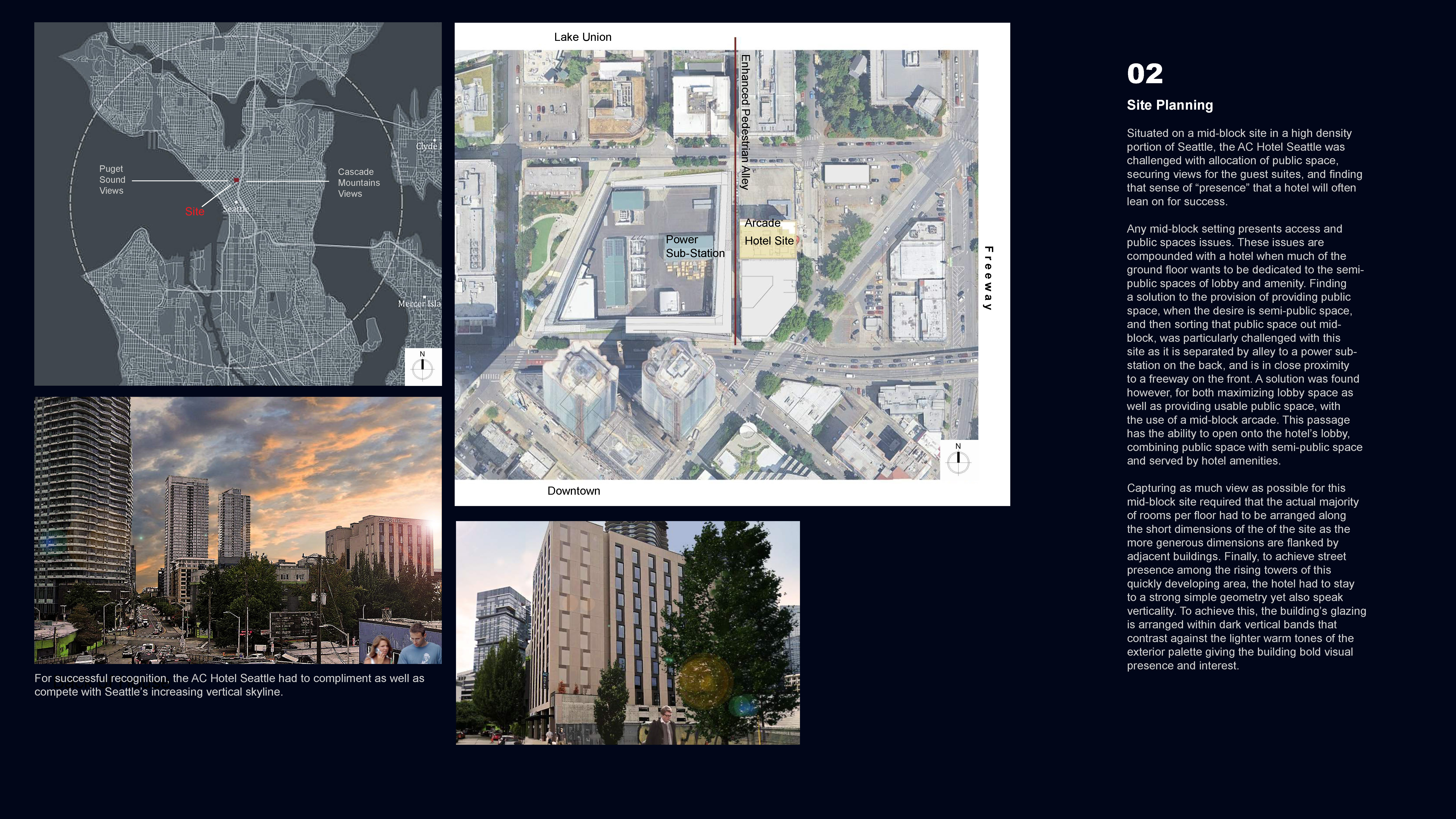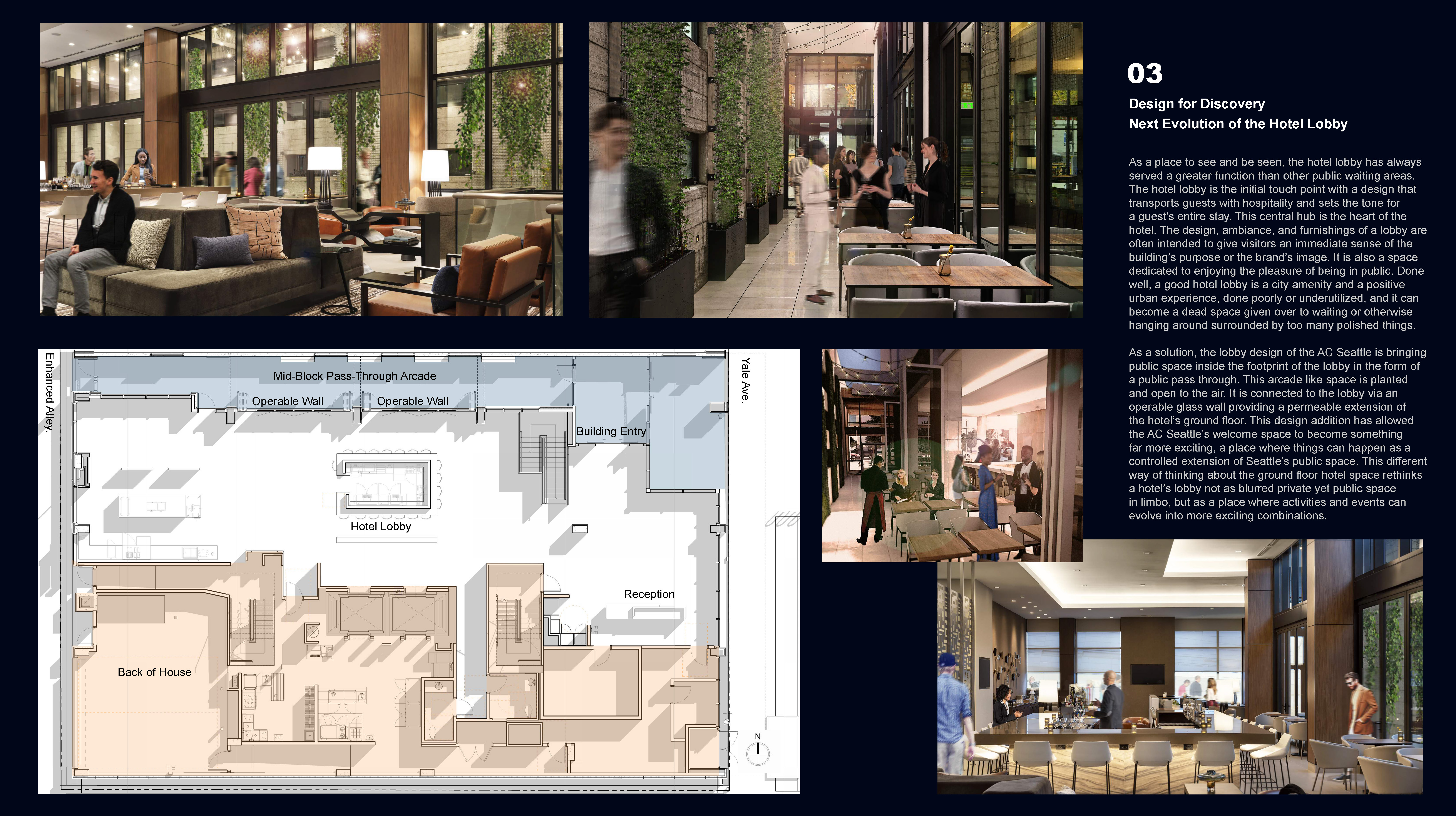 3 - As a place to see and be seen, the hotel lobby has always served a greater function than check-in. The hotel lobby is the initial touch point with design that transports guests with hospitality and, done well, is also city amenity and a positive urban experience of city hospitality. Combining a public arcade as an extension of the hotel lobby has been a successful precedent for grand hotels of the past. For the AC Seattle, the same precedent also served well for a site requiring a more minimal application but still able give to the neighborhood a contributing piece of city hospitality.