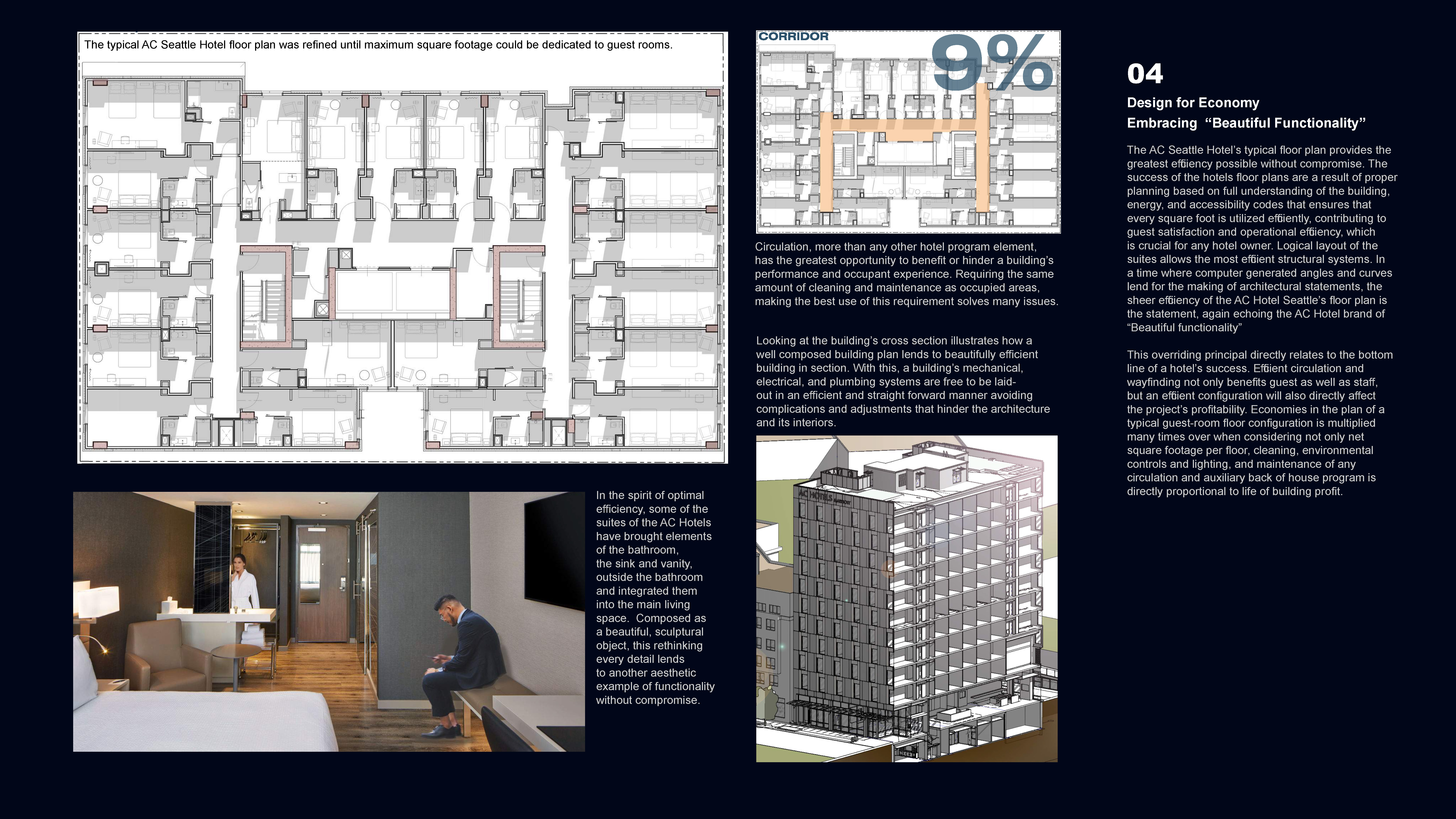 The AC Seattle Hotel’s typical floor plan provides the greatest efficiency possible without compromise. The success of the hotels floor plans are a result of proper planning based on full understanding of the building, energy, and accessibility codes that ensures that every square foot is utilized efficiently, contributing to guest satisfaction and operational efficiency, which is crucial for any hotel owner. Logical layout of the suites allows the most efficient structural systems. In a time where computer generated angles and curves lend for the making of architectural statements, the sheer efficiency of the AC Hotel Seattle’s floor plan is the statement, again echoing the AC Hotel brand of “Beautiful functionality” This overriding principal directly relates to the bottom line of a hotel’s success. Efficient circulation and wayfinding not only benefits guest as well as staff , but an efficient configuration will also directly affect the project’s profitability. Economies in the plan of a typical guest-room floor configuration is multiplied many times over when considering not only net square footage per floor, cleaning, environmental controls and lighting, and maintenance of any circulation and auxiliary back of house program is directly proportional to life of building profit.