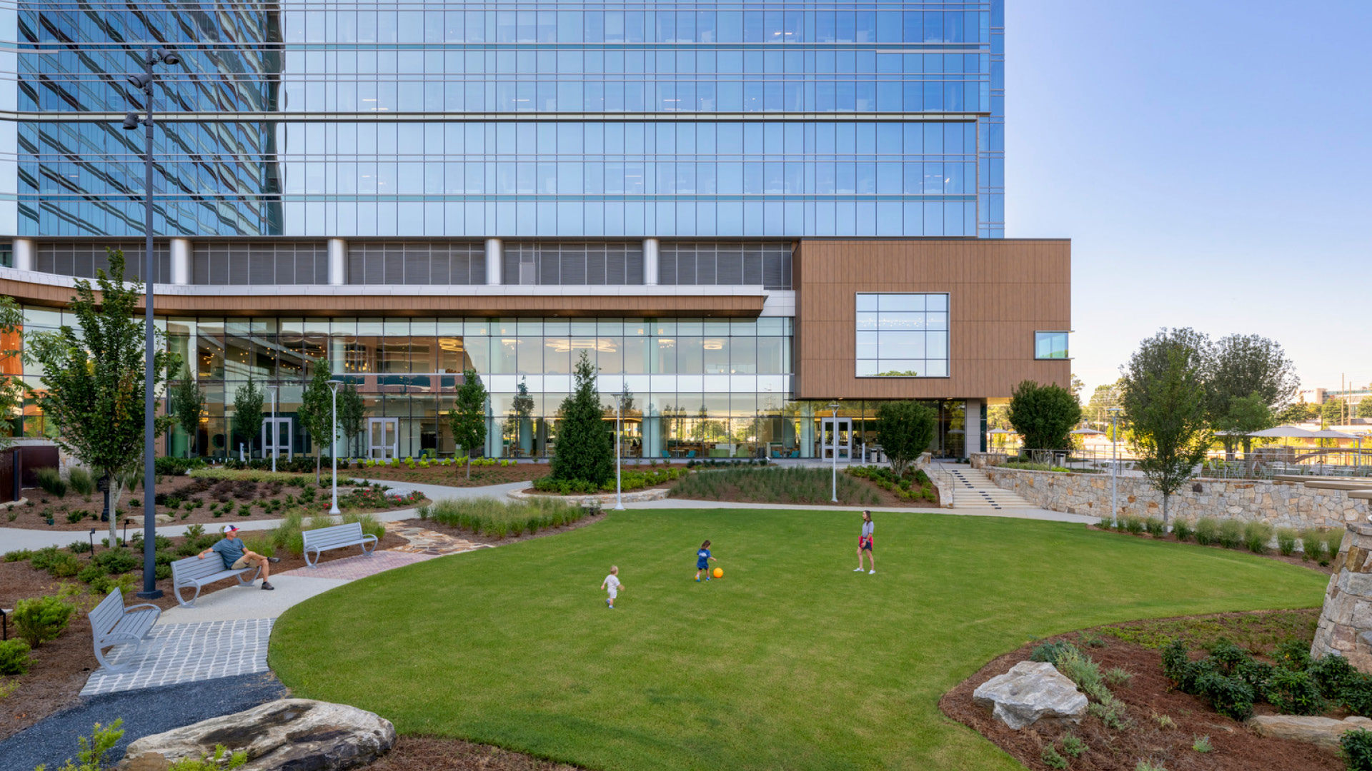 - **Biophilic Design & Nature Integration** \n Large windows, strategic building orientation, and green spaces—including a private terrace for immunocompromised patients—bring the beauty of Atlanta’s natural surroundings indoors, promoting healing through connection to nature.
