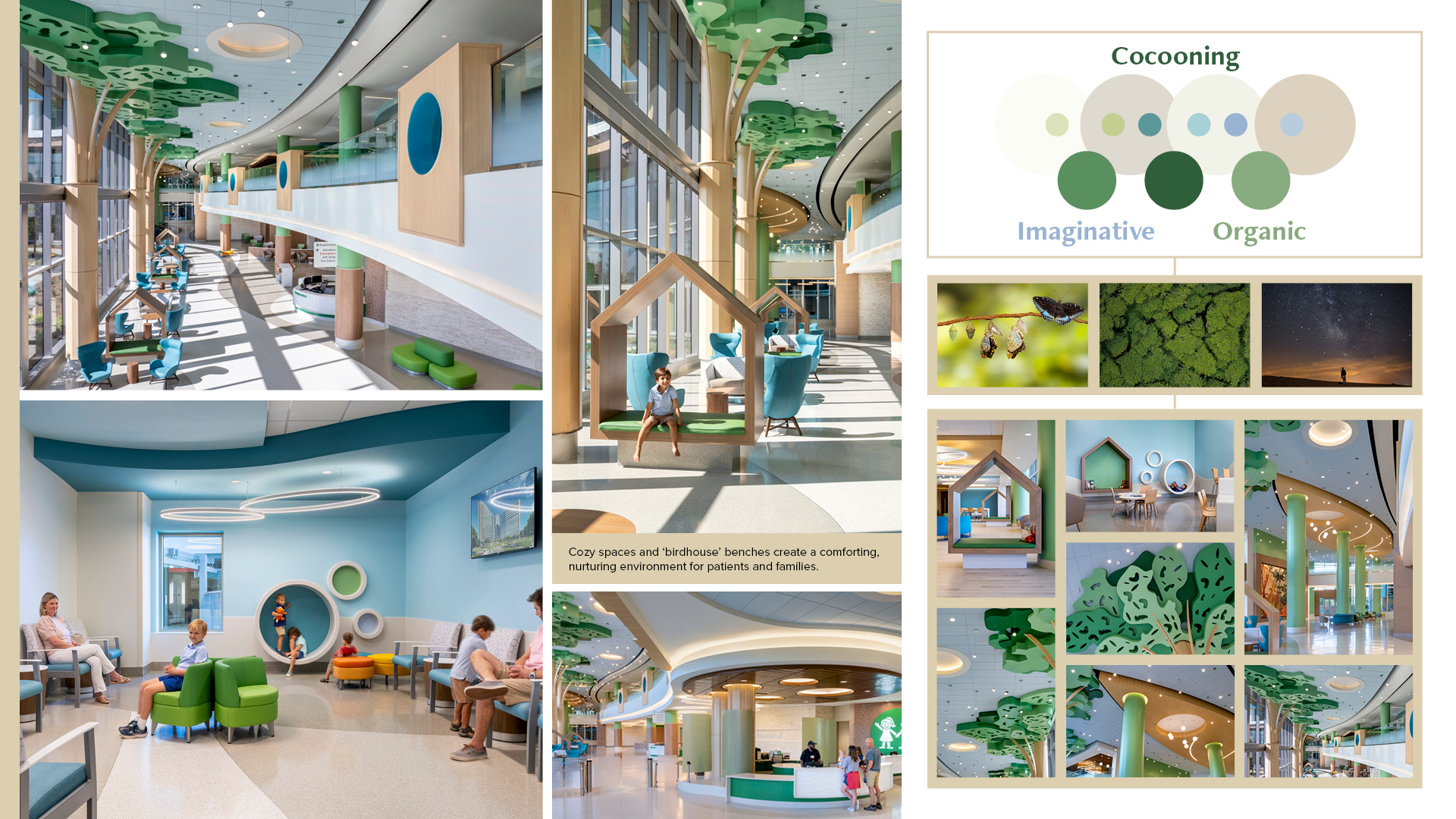 5 - Cocooning and comfort: Treehouse-inspired benches, organic forms, and cozy seating areas create a nurturing, imaginative environment that supports healing for patients and families.