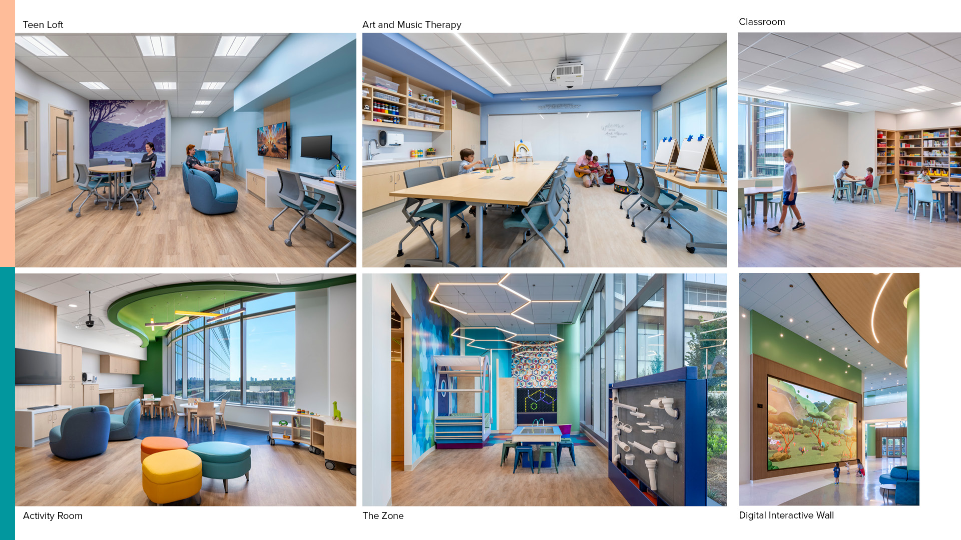 - **Child Life Programming** \n Spaces like The Zone, Seacrest Studios, Art & Music Therapy rooms, and The Teen Loft provide joyful, age-appropriate experiences that support emotional well-being and development.