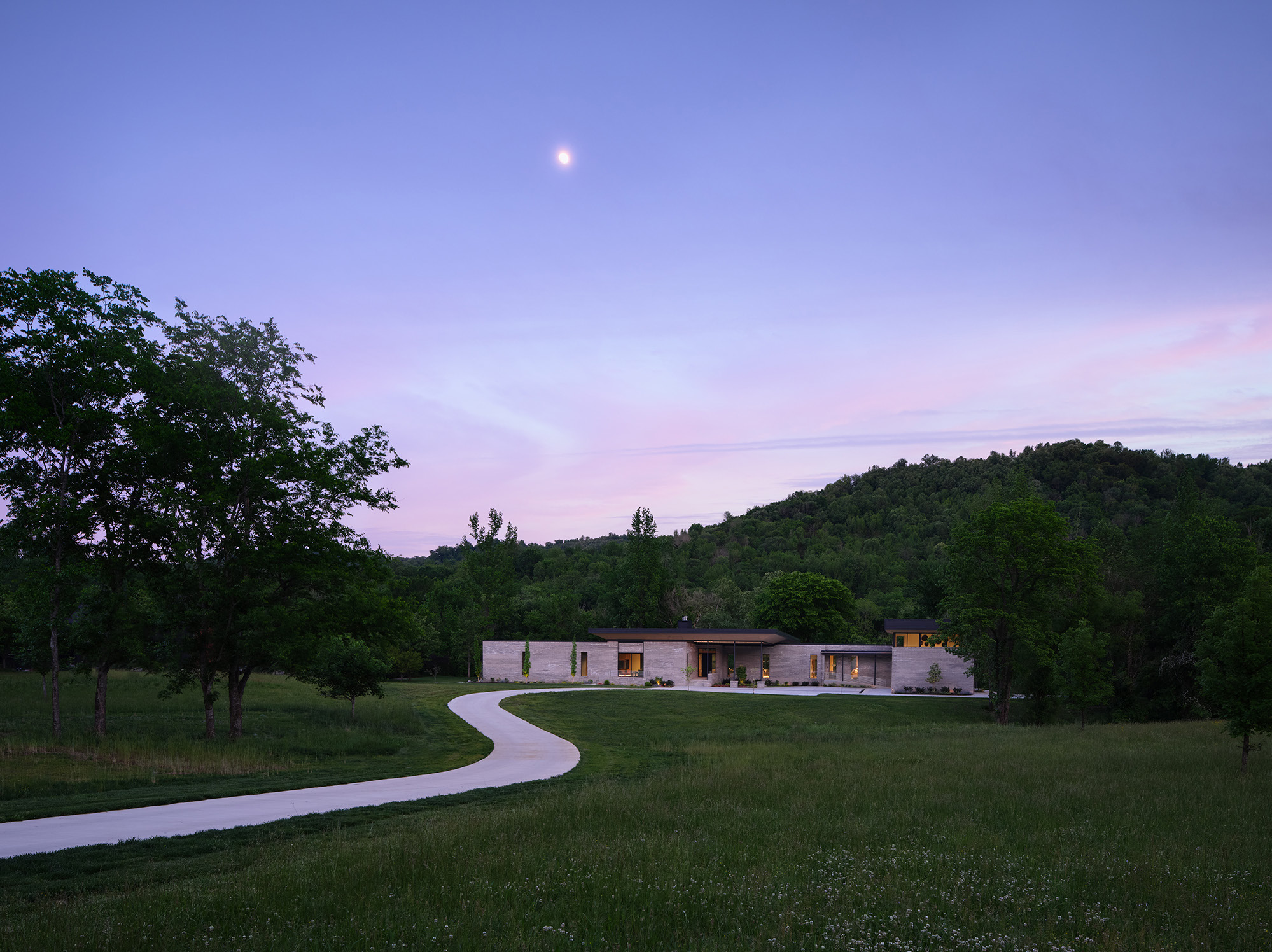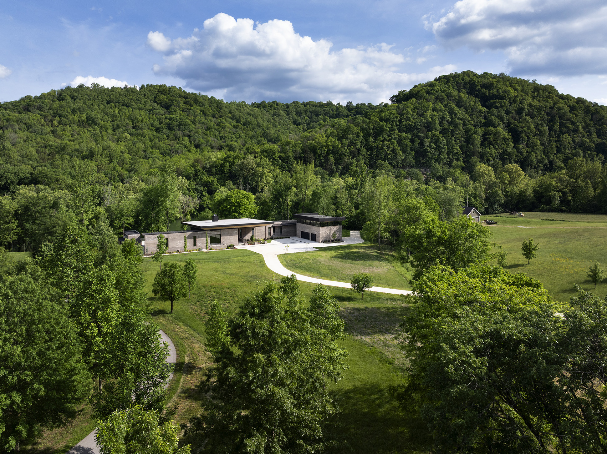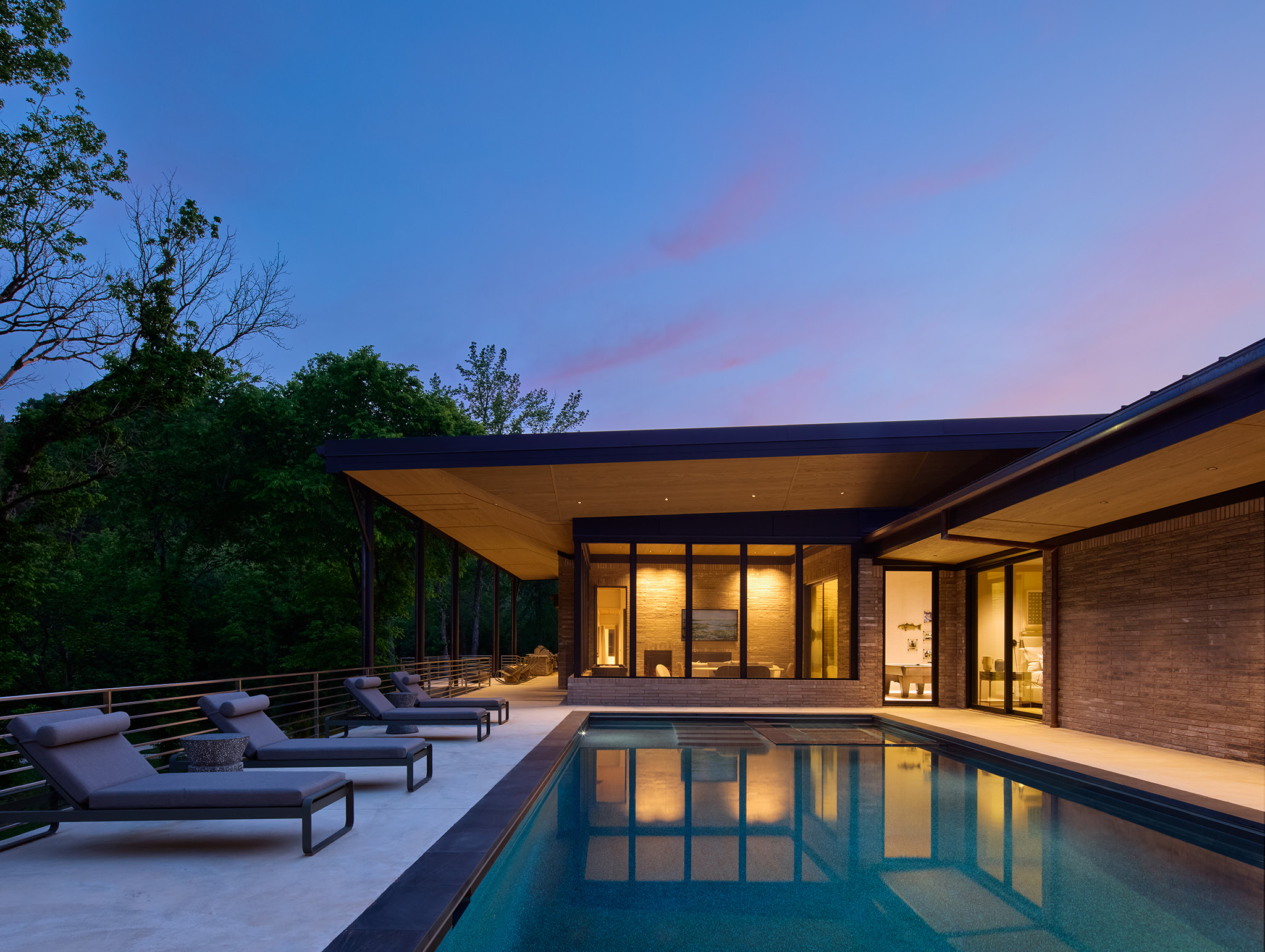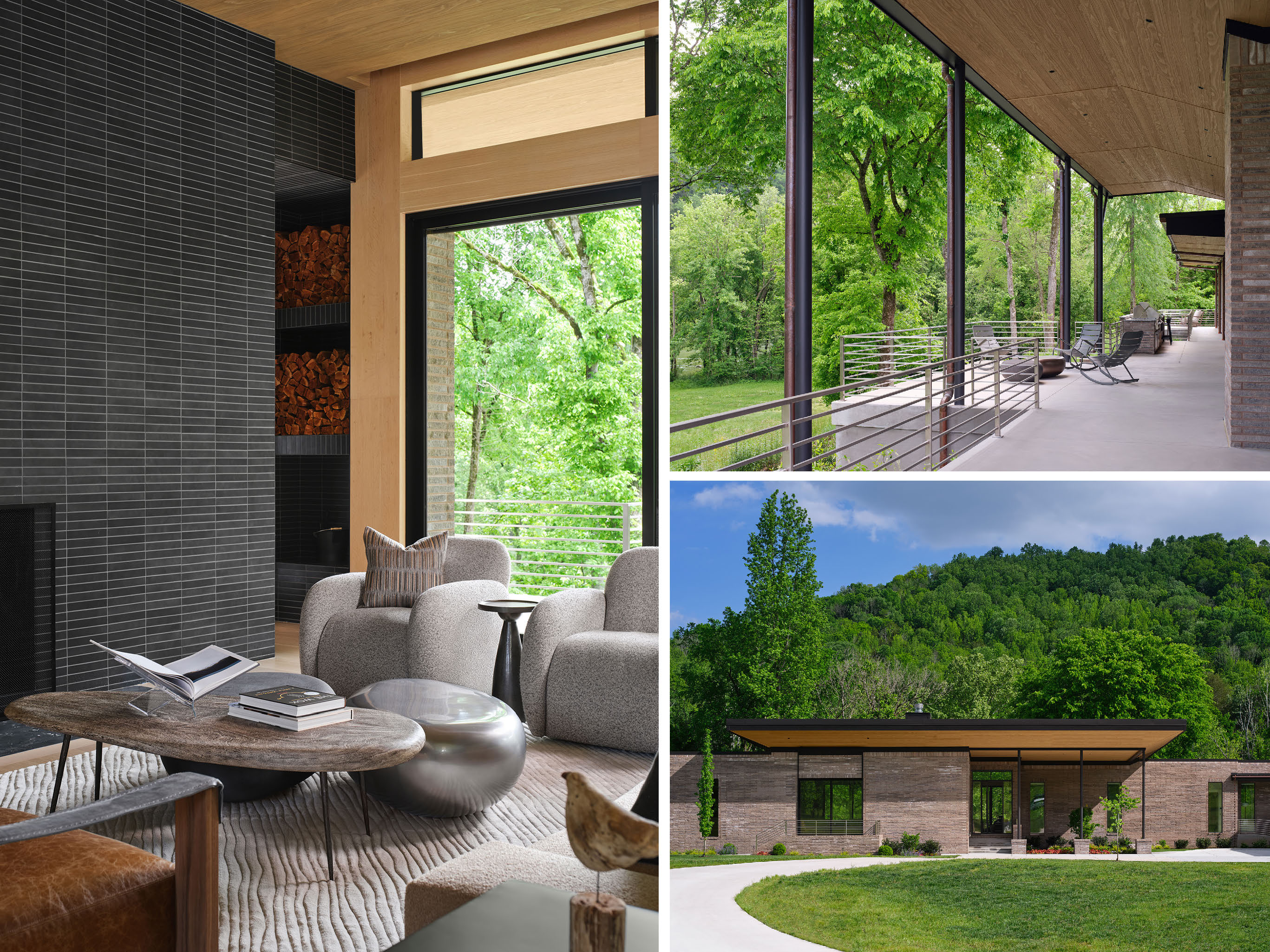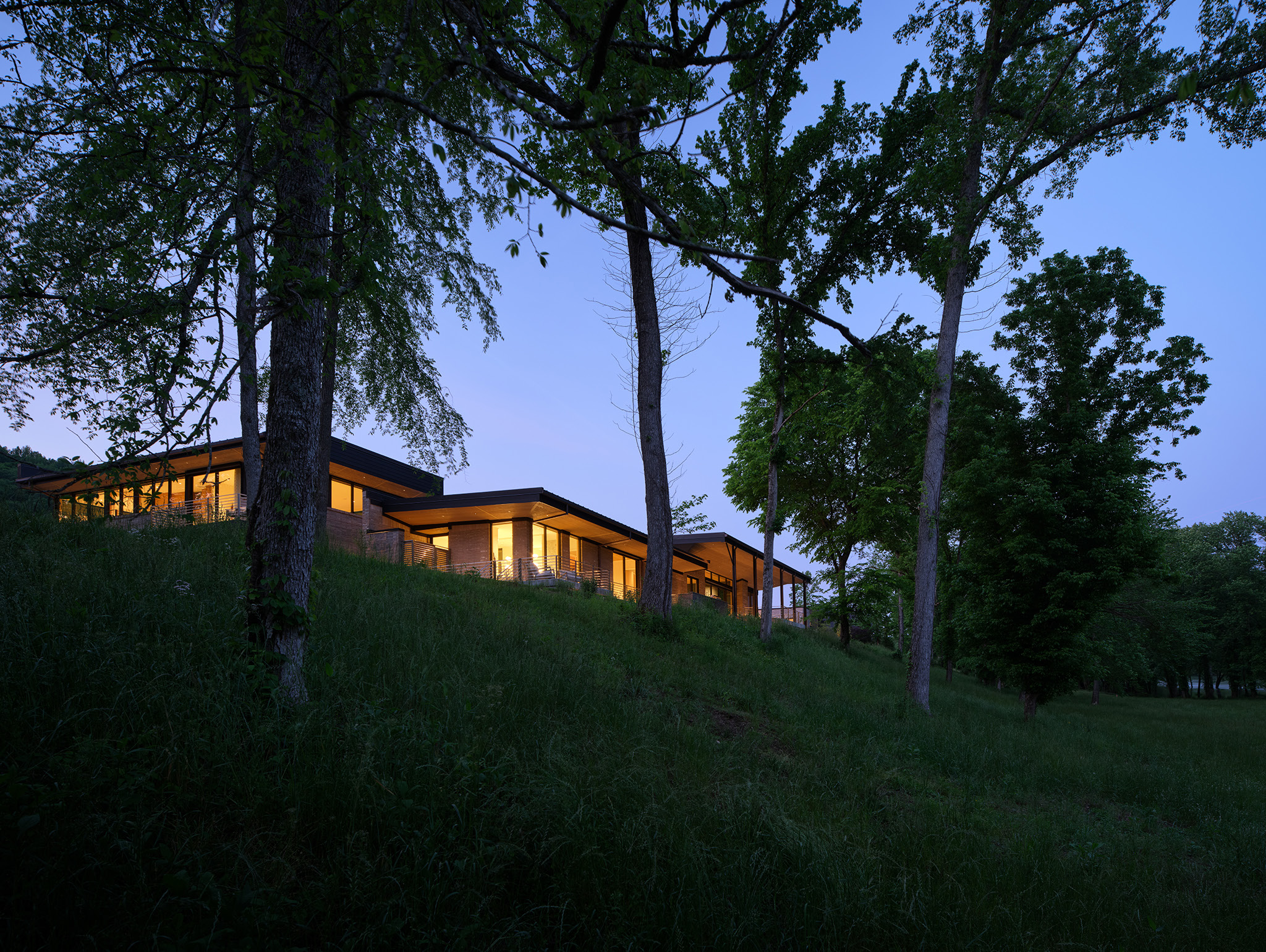 Fed by the deep, cold waters from Center Hill dam upstream from this house, the Caney Fork River winds its way along the western base of the Cumberland Plateau creating a unique habitat for striped bass. This cabin is ideally situated for an avid fly-fisher and environmentalist and is perched at the edge of the Caney’s banks, merging with the tree canopy above. Fly fishing is imprinted in this modern project, influencing all decisions, and shaping an experience as relaxed and restorative as the sport. The exterior integrates seamlessly into the landscape through the use of complimentary materials, textures, and forms. Concrete, metal, and wood come together to create an undemanding, durable, and timeless material palette. Blackened exterior siding interprets the striped bass markings with its vertical patterning