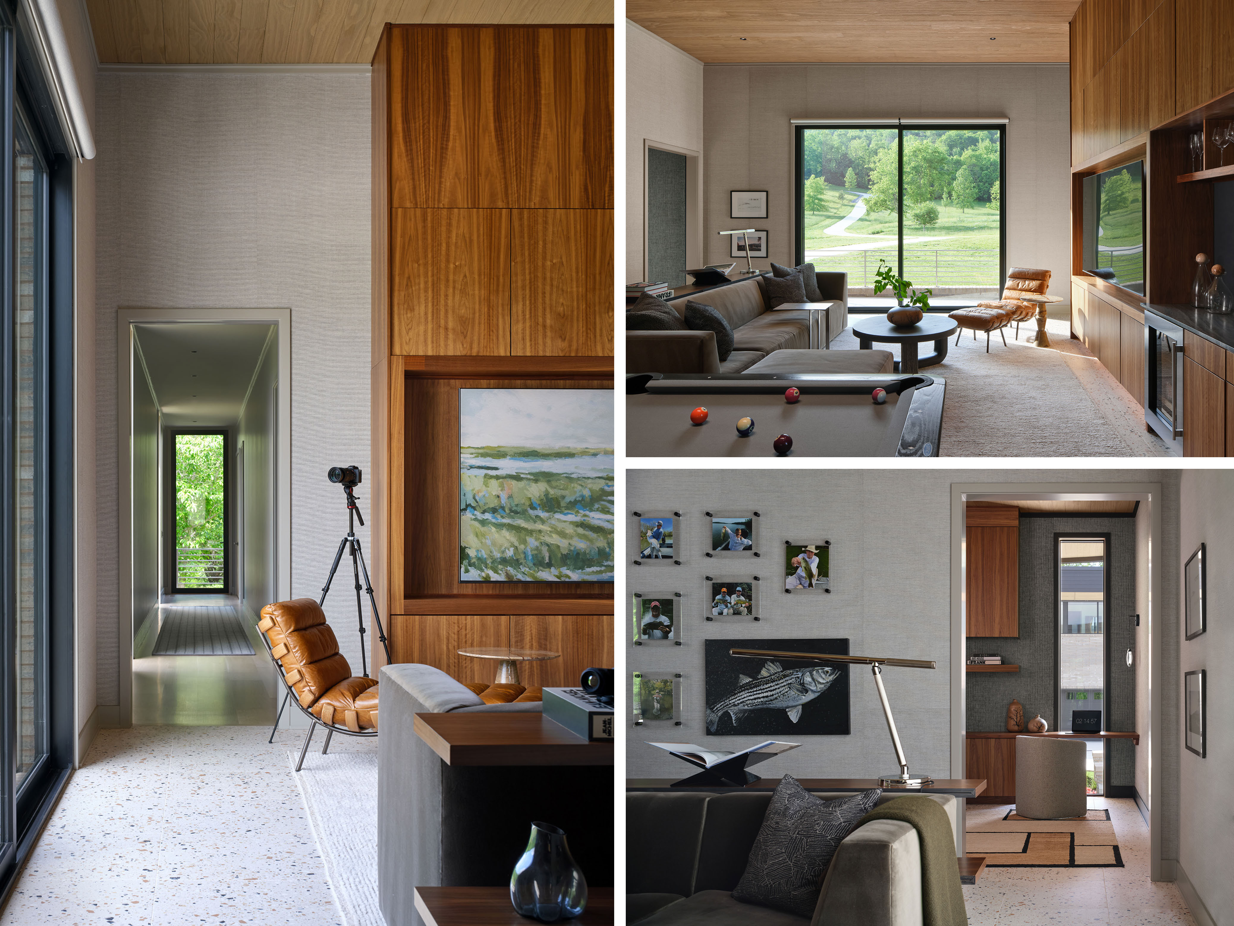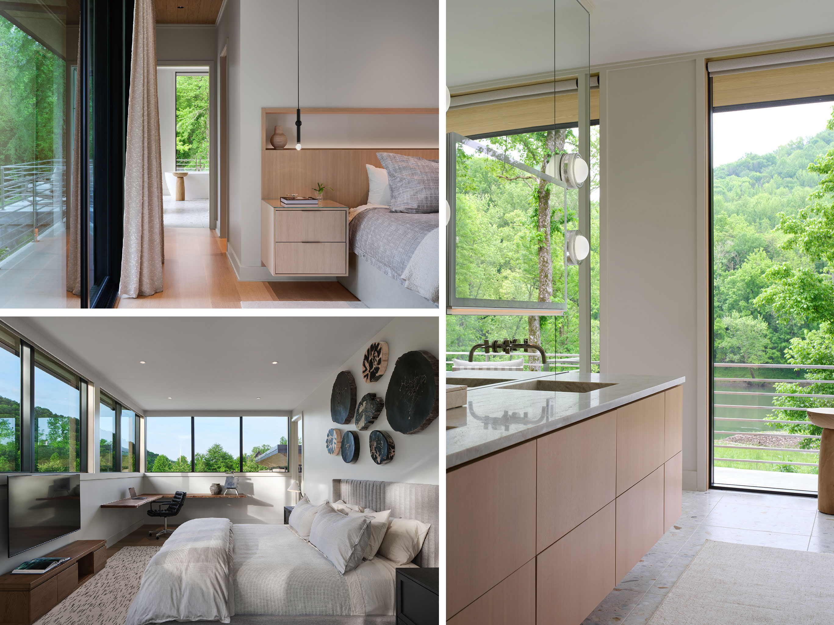 Echoing the ebb and flow of the river, a series of expanding and contracting horizontal volumes define the space, while an east-to-west axis organizes the transition between public and private areas. The main entrance on the north side leads through the kitchen and dining areas to the southern outdoor living spaces. Sweeping views and a seamless connection between indoors and outdoors are achieved with floor-to-ceiling windows and large sliding glass doors that fully open to the terrace and surrounding landscape.