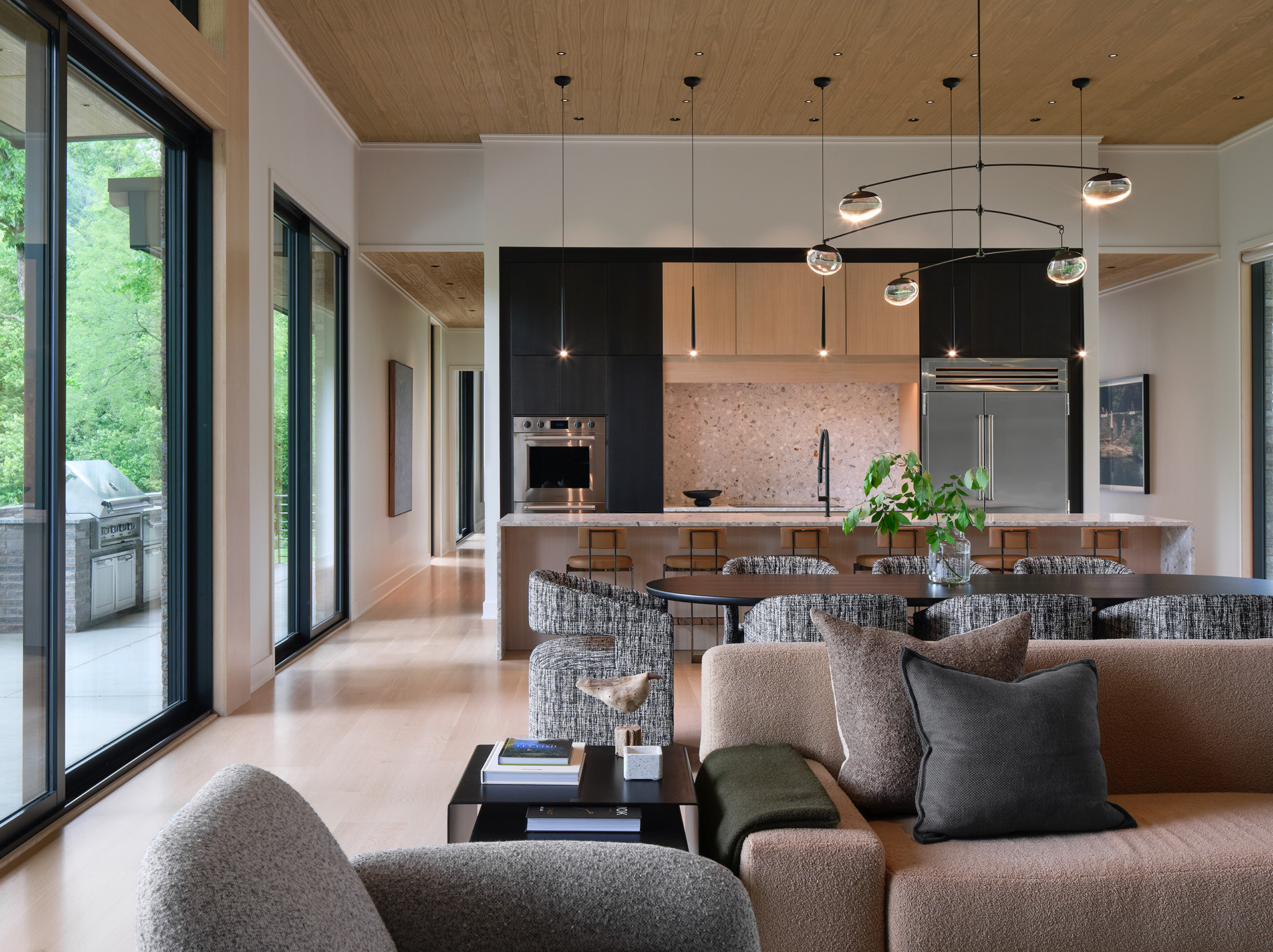 6- The open concept living, dining, and kitchen area seamlessly flows outward onto the cantilevered terrace, offering breathtaking views of the river and landscape beyond