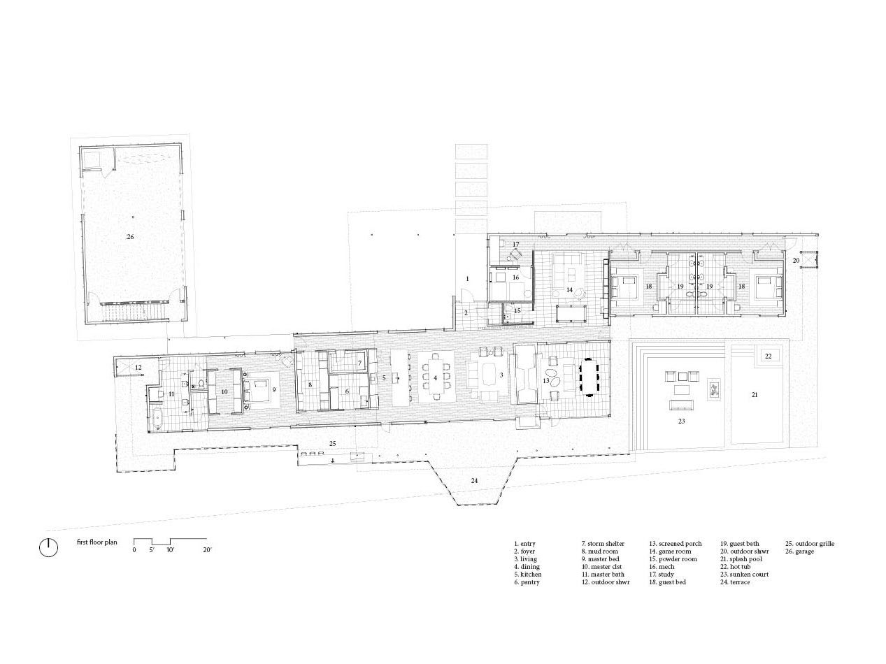 The east wing houses a game room, office, and two guest rooms, each with an en suite bath and access to an outdoor shower. The west wing offers privacy for the primary bedroom, bathroom, and an adjoining outdoor shower, along with convenient access to the boat ramp. The entire length of the southern façade features a canopied terrace that hovers above ground level, serving as a key gathering space complete with an outdoor grill, firepit, splash pool, hot tub, and a sunken living room court.