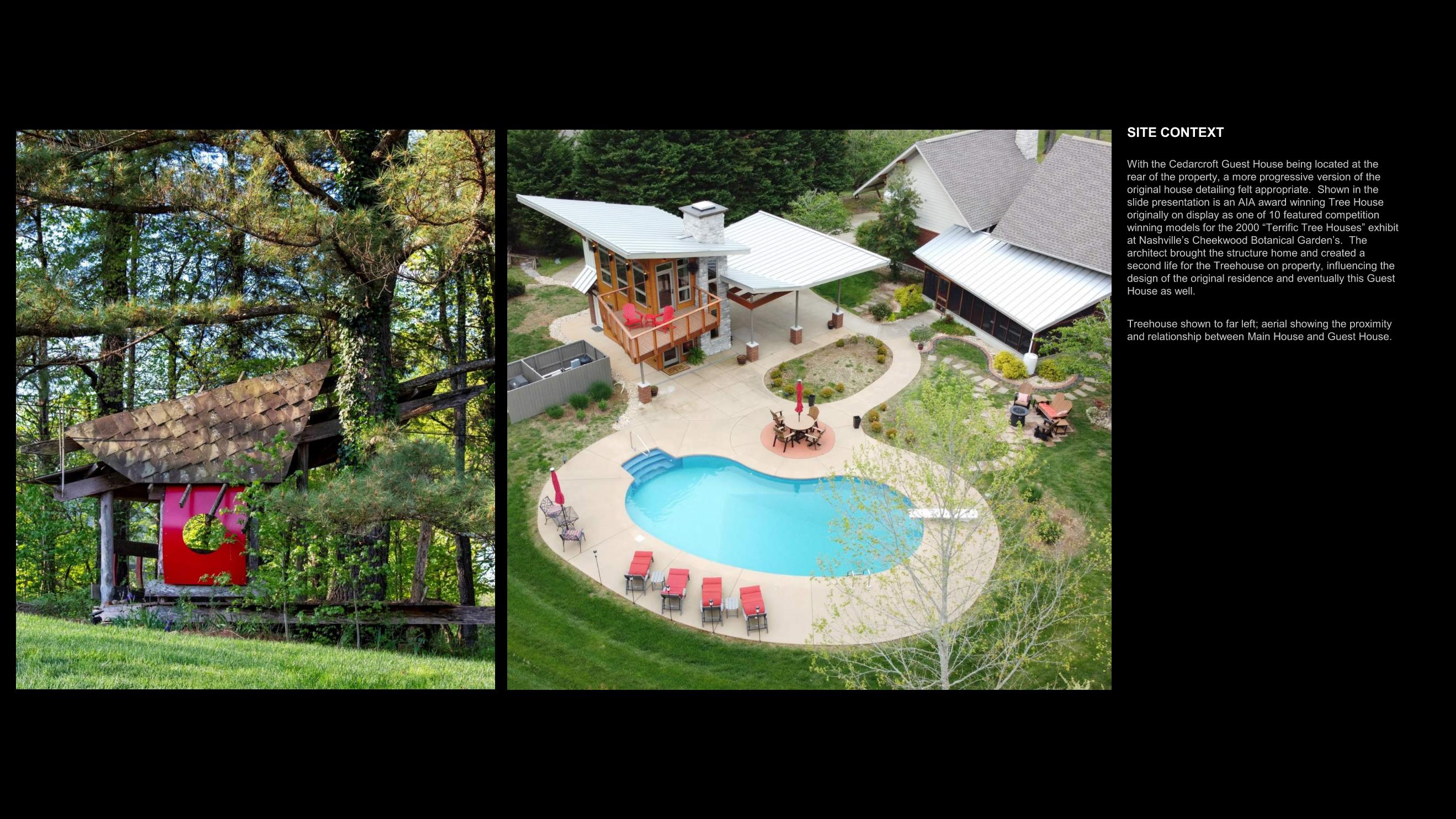 4. Context Images - Drone Photo of the site and an image of “The Tree Hugger” treehouse.