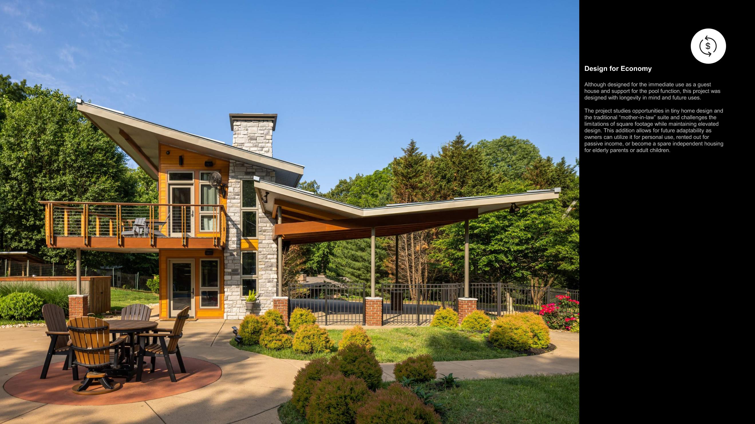 Economy -Although designed for the immediate use as a guest house and support for the pool function, this project was designed with longevity in mind and future uses. The project studies opportunities in tiny home design and the traditional “mother-in-law” suite and challenges the limitations of square footage while maintaining elevated design. This addition allows for future adaptability as owners can utilize it for personal use, rented out for passive income, or become a spare independent housing for elderly parents or adult children.