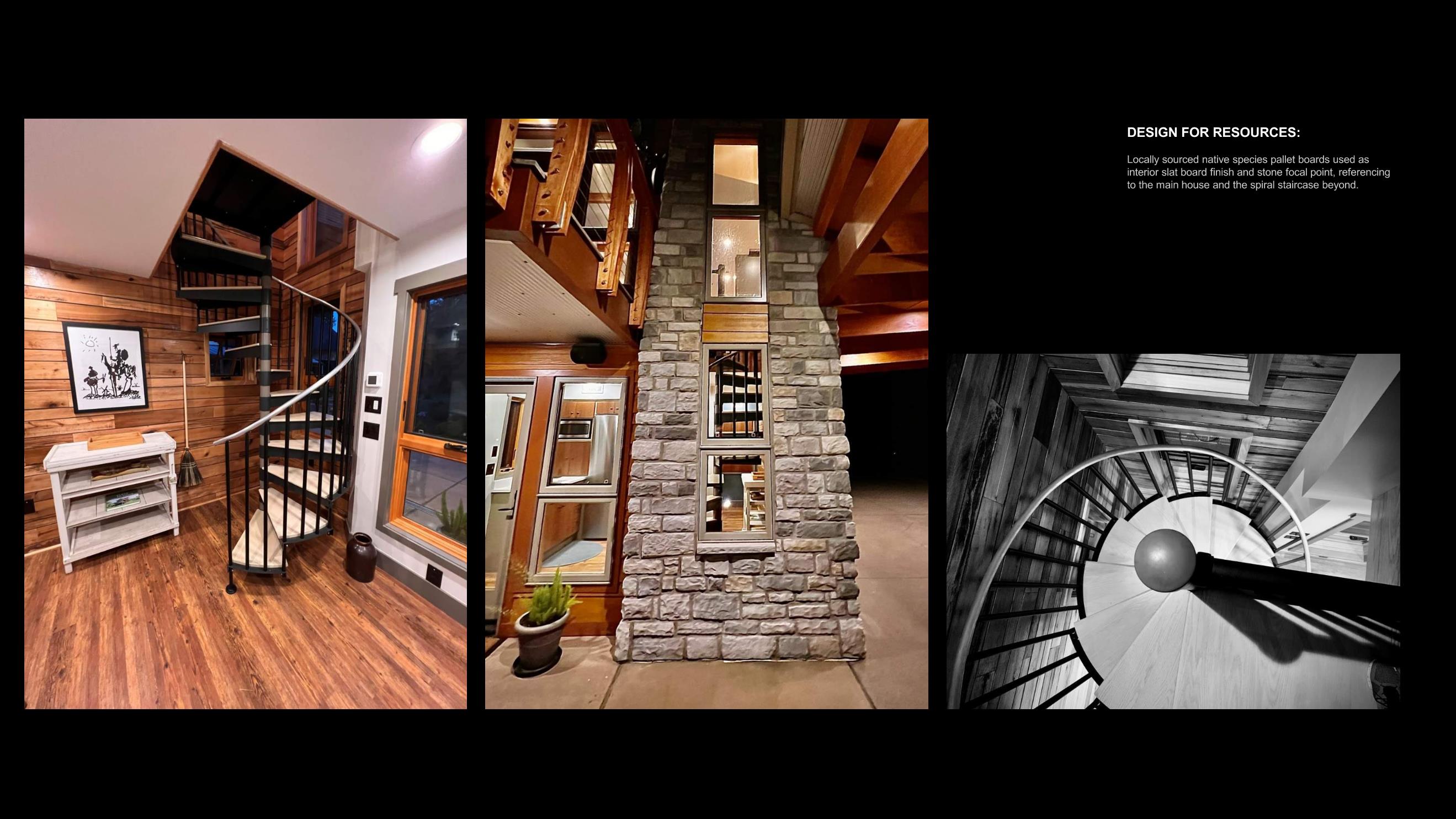 11. The spiral staircase is a focal piece from the interior but also from the exterior by its stacked stone facade moment.
