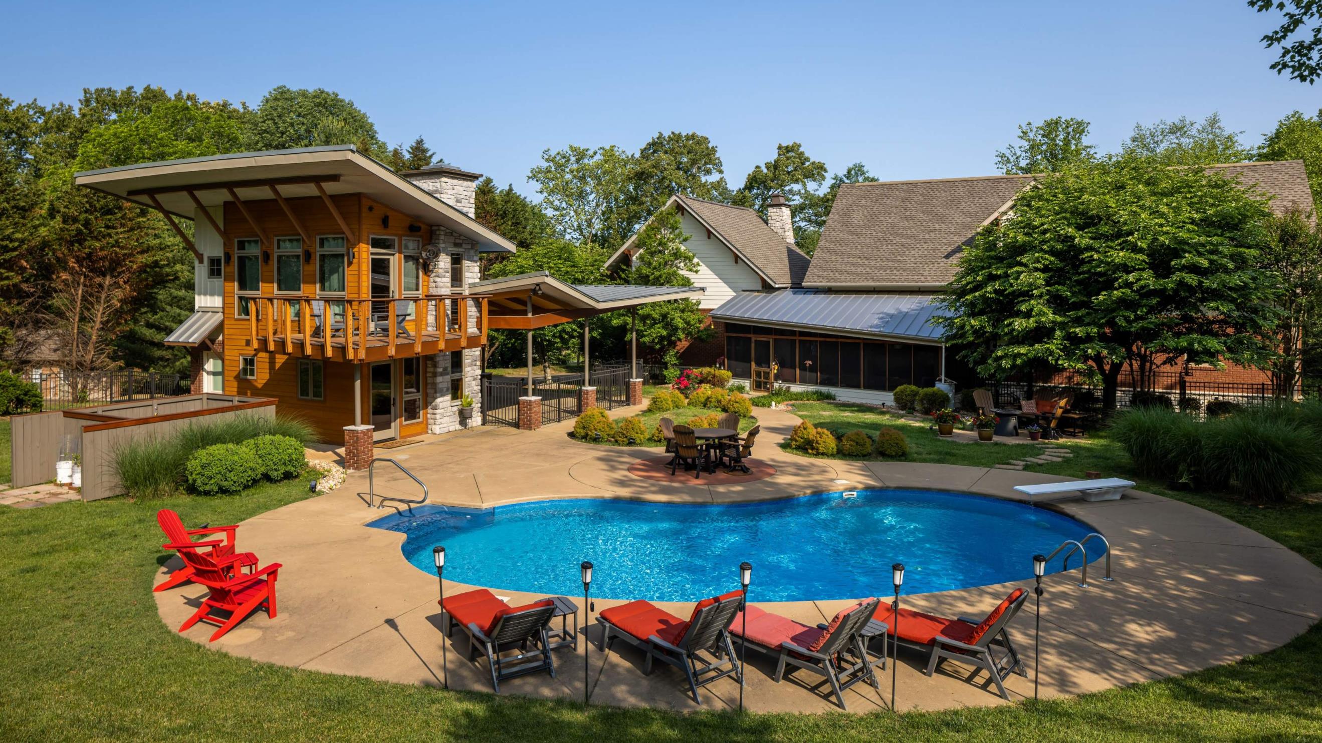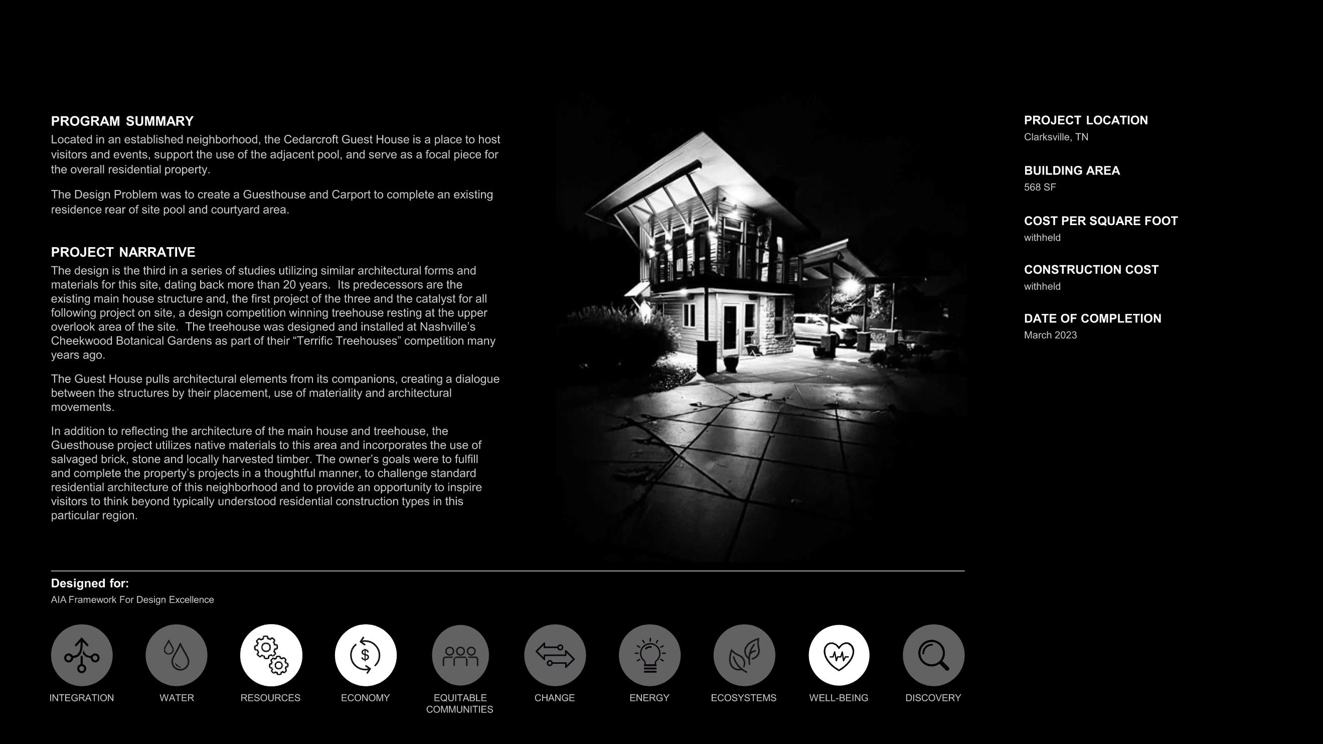 Located in an established neighborhood, the Cedarcroft Guest House is a place to host visitors and events, support the use of the adjacent pool, and serve as a focal piece for the overall residential property.