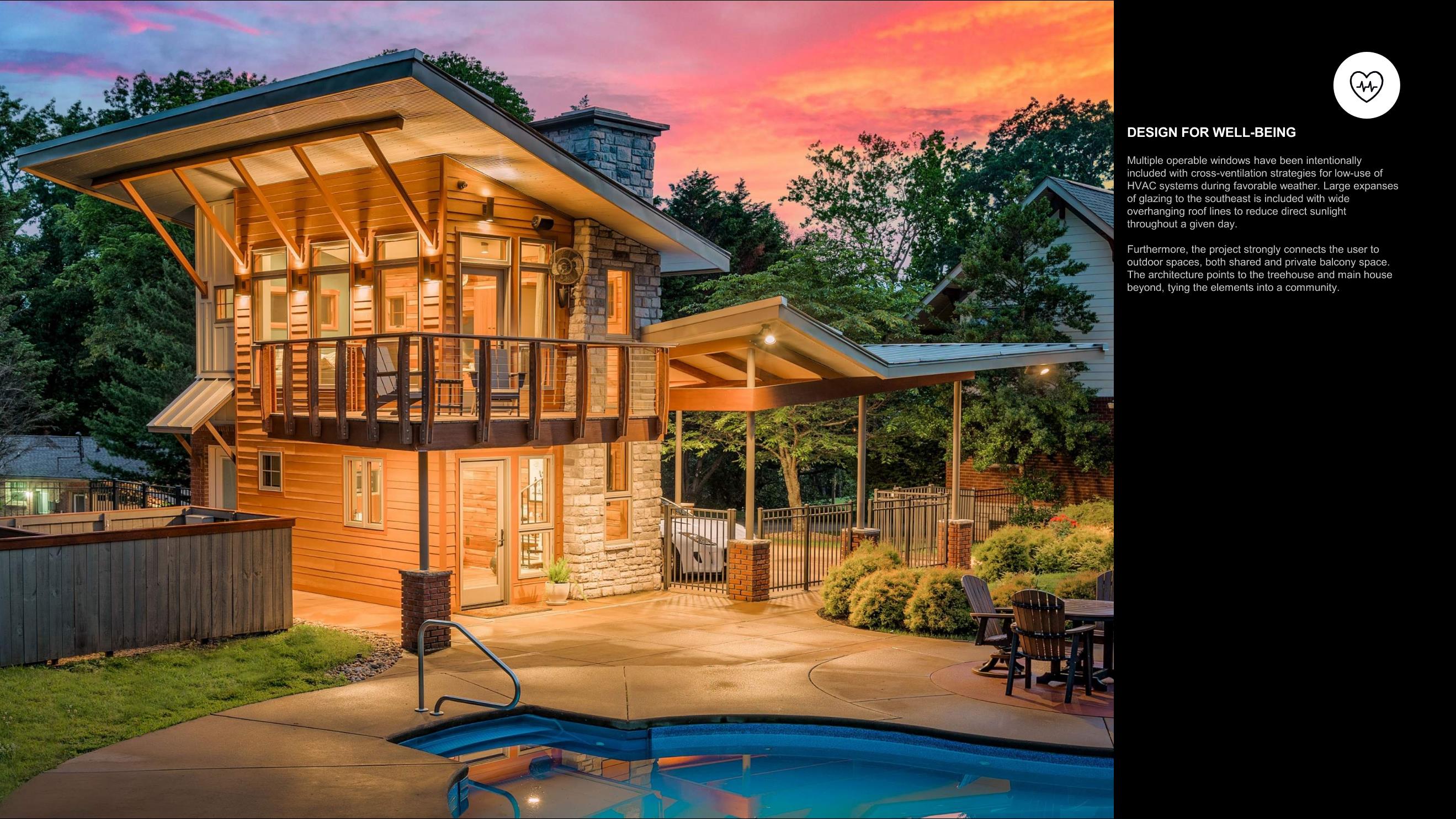Well-Being - Multiple operable windows have been intentionally included with cross-ventilation strategies for low-use of HVAC systems during favorable weather. Large expanses of glazing to the southeast is included with wide overhanging roof lines to reduce direct sunlight throughout a given day. Furthermore, the project strongly connects the user to outdoor spaces, both shared and private balcony space. The architecture points to the treehouse and main house beyond, tying the elements into a community.
