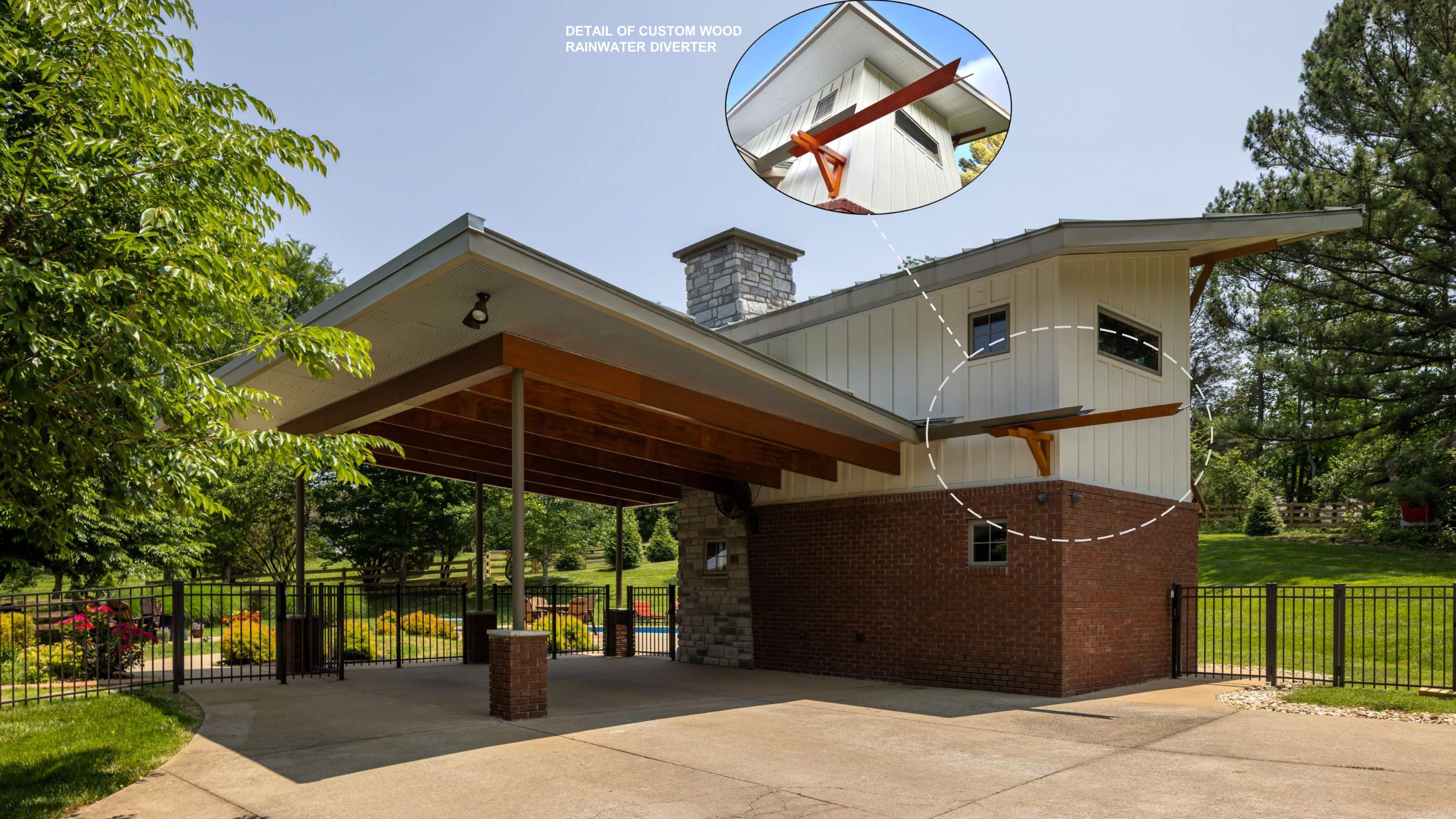 9. The approach from the drive to the Guest House. The rainwater diverter detail is celebrated from this perspective, as well as another unique view of the form of building.