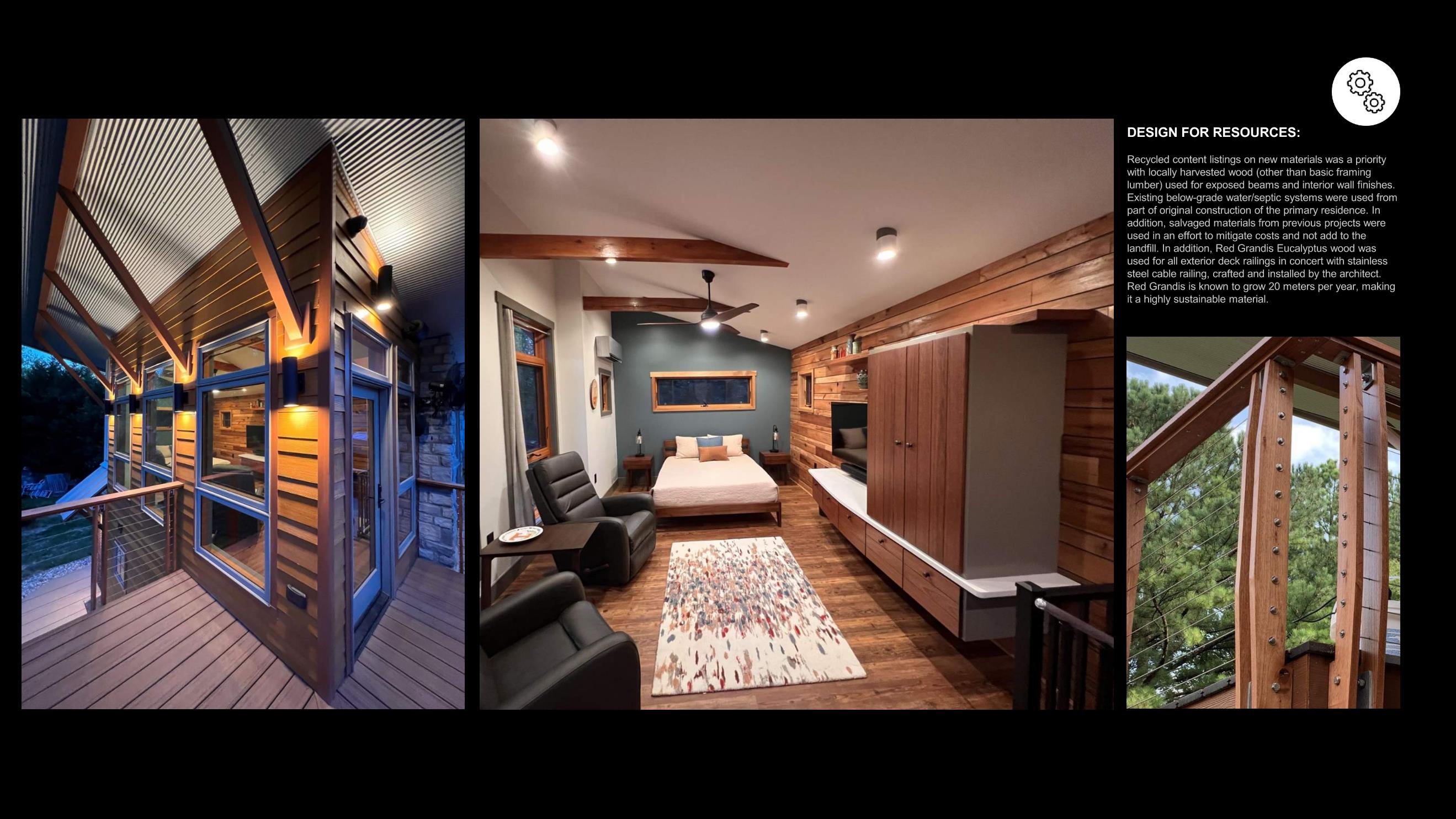 Resources - Recycled content listings on new materials was a priority with locally harvested wood (other than basic framing lumber) used for exposed beams and interior wall finishes. Existing below-grade water/septic systems were used from part of original construction of the primary residence. In addition, salvaged materials from previous projects were used in an effort to mitigate costs and not add to the landfill. In addition, Red Grandis Eucalyptus wood was used for all exterior deck railings in concert with stainless steel cable railing, crafted and installed by the architect. Red Grandis is known to grow 20 meters per year, making it a highly sustainable material.