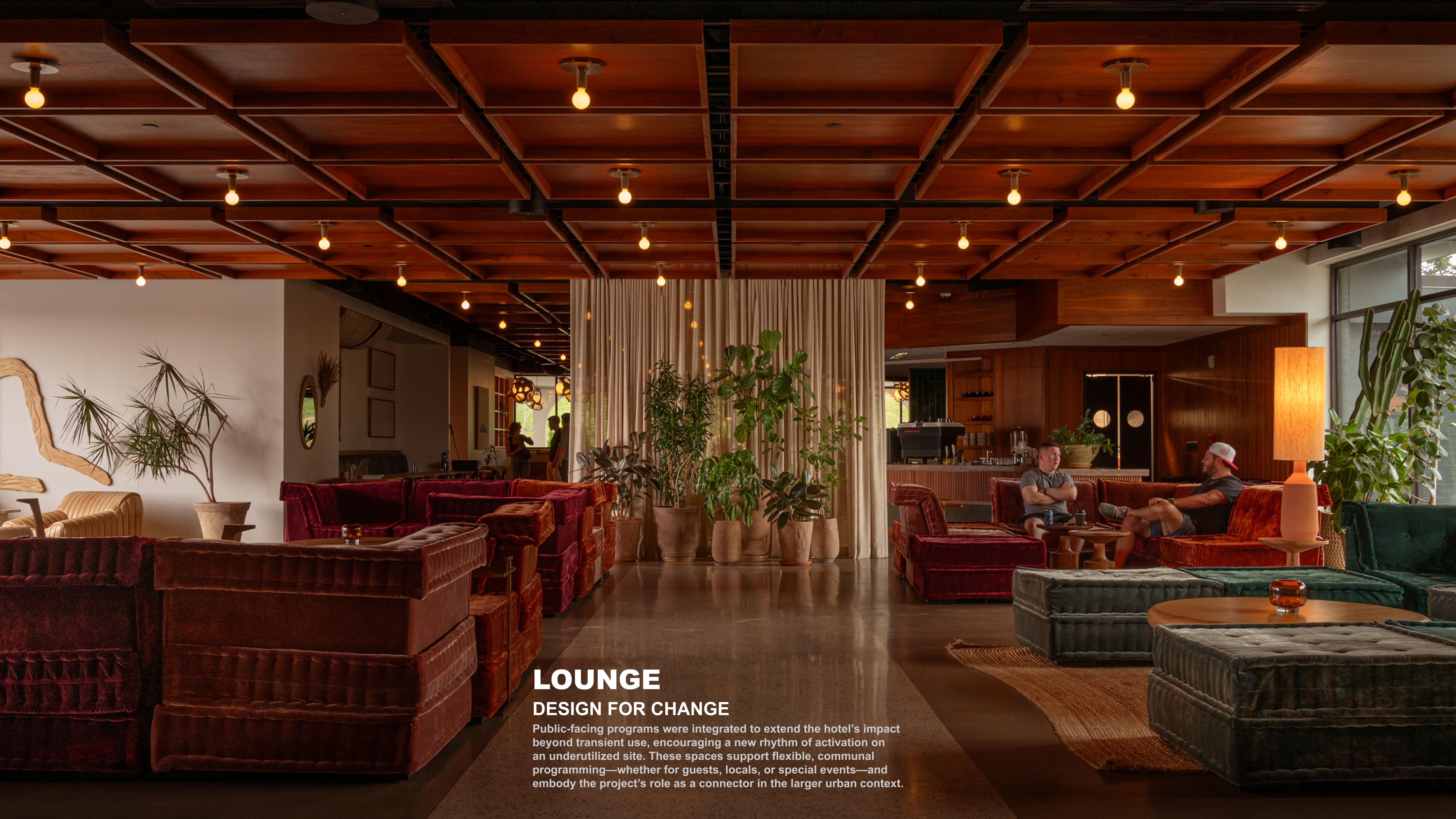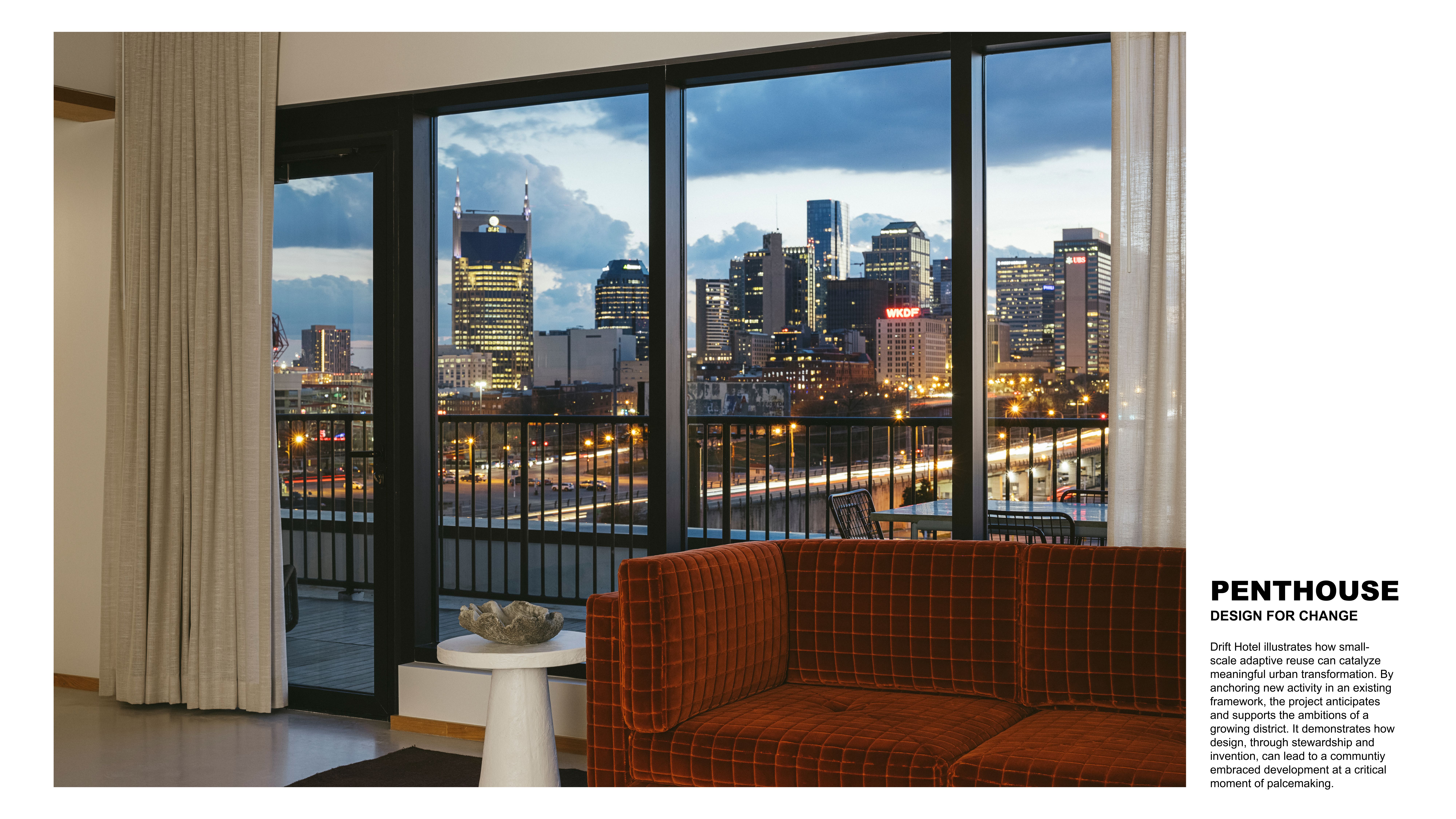 Design for Change: Positioned in a formerly underutilized area, the hotel contributes to the district’s revitalization. Its flexible layout includes multi-room suites with kitchenettes, a ground-level pool and cabanas, and diverse food and beverage offerings that invite community interaction. Designed to accommodate a range of uses and users, the project serves as a model for how hospitality spaces can evolve with neighborhood needs. By rethinking an outdated structure through thoughtful, place-based design, the Drift Hotel exemplifies how architecture can support cultural continuity, sustainability, and inclusive urban renewal. PROJECT LOCATION 10 Interstate Dr, Nashville, TN 37213