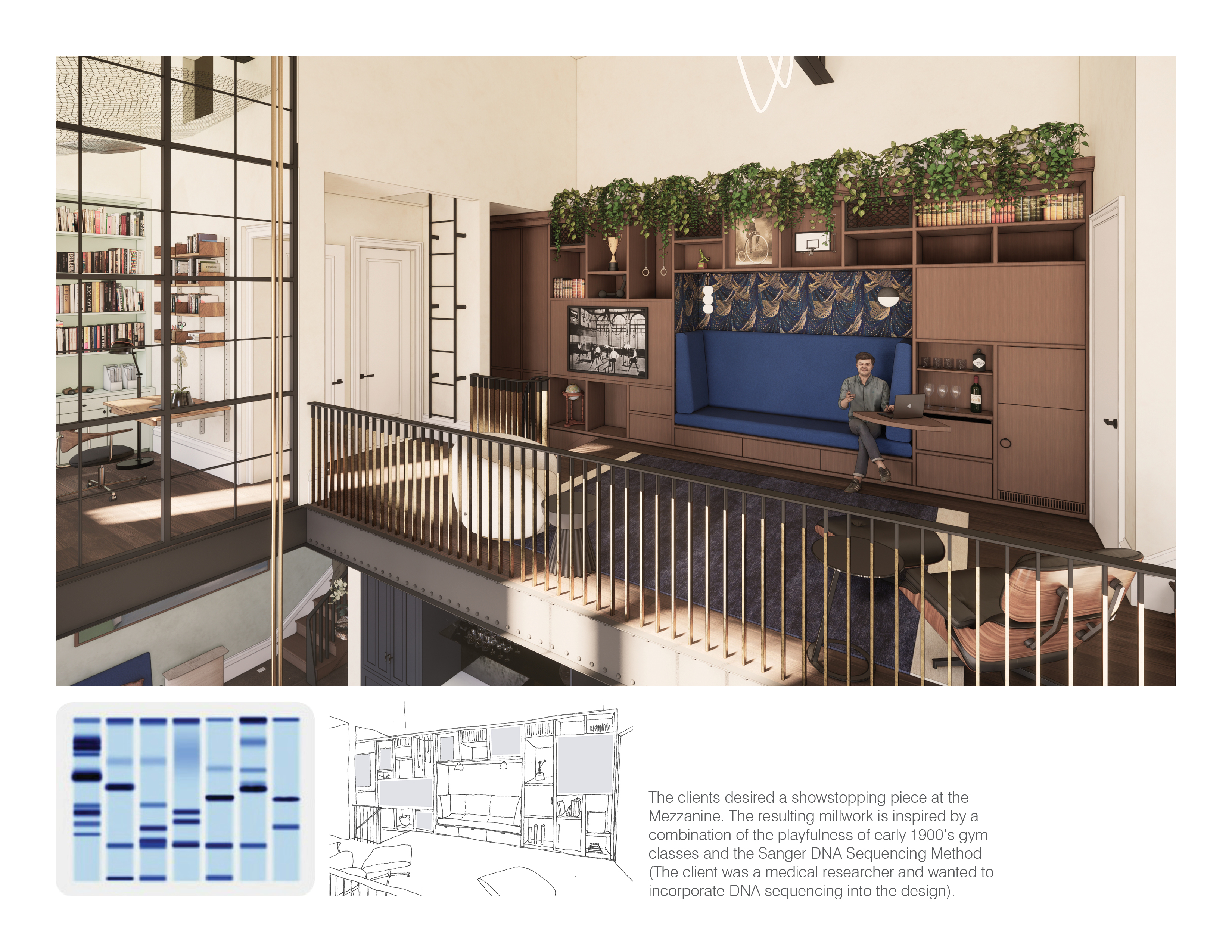 For the interior architecture and design, rope-clad chandeliers paid homage to the gymnasium, school desk-inspired cabinetry was designed for the kitchen and bathrooms, and retaining the existing exposed steel trusswork were a few of the design moves made to embrace the historical past of this space. The client worked in the medical field, and the millwork in the upper level lounge was designed using the Sanger Sequencing Method as the main concept driver.